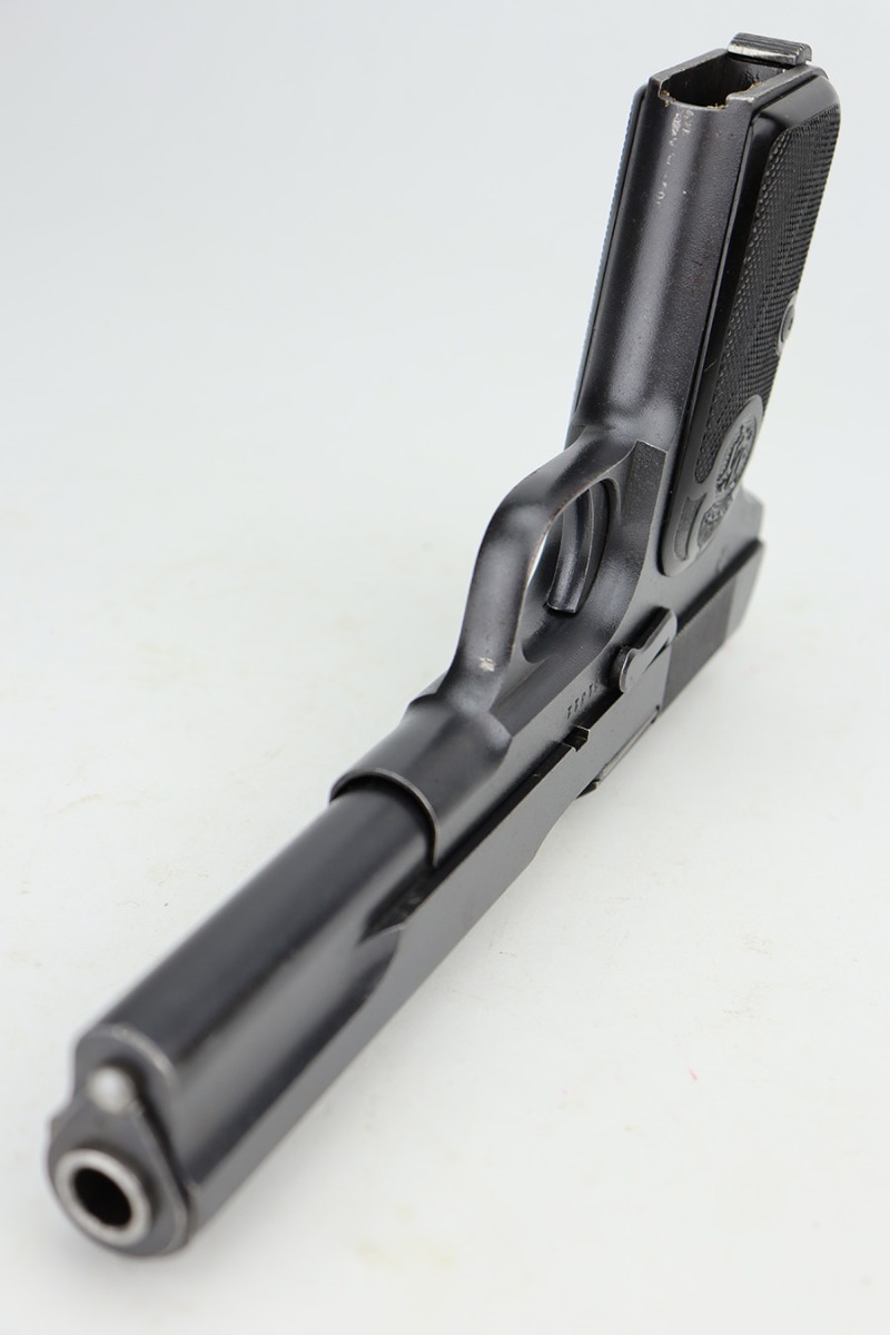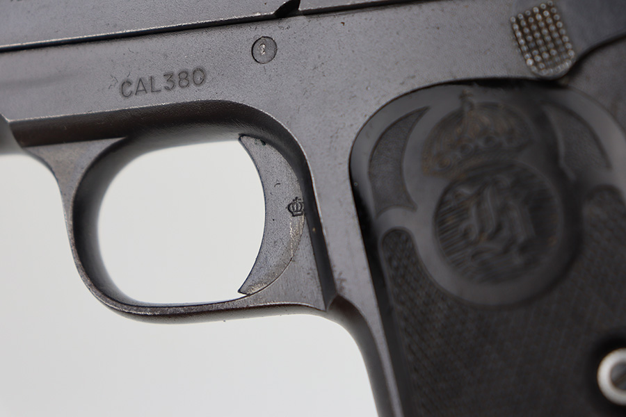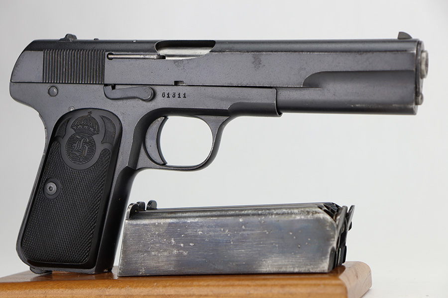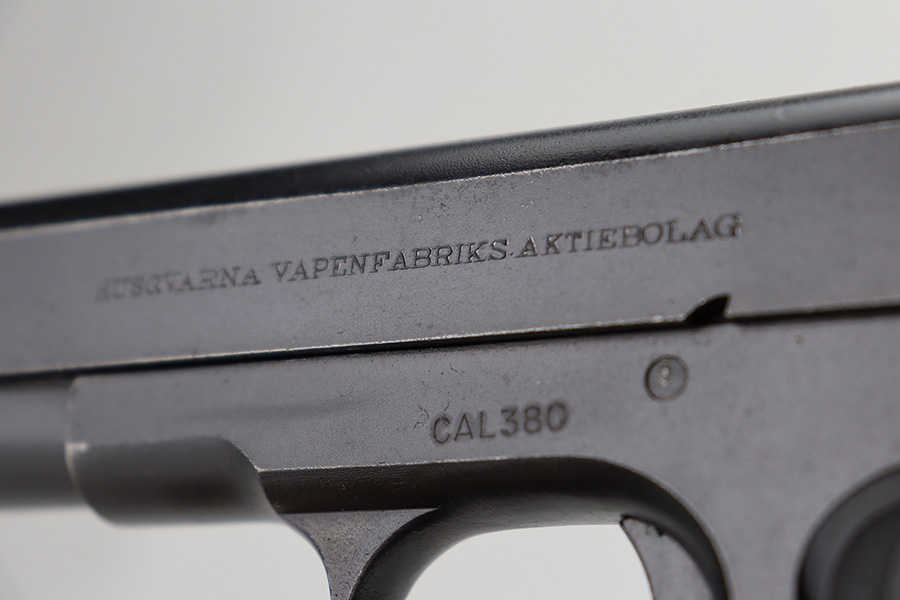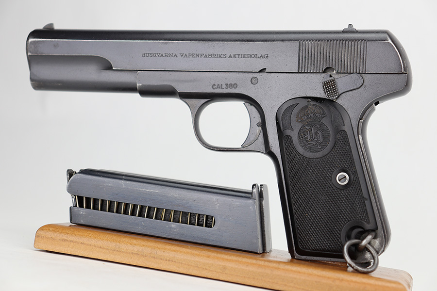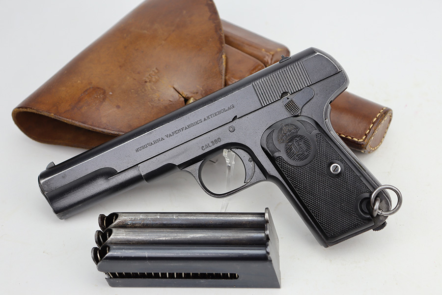 9/5/24 – This is a somewhat uncommon find, the Swedish Husqvarna Model 1907 pistol. The origin story on these handguns dates back to the early 1900s, as they were being produced by Fabrique Nationale under the designation of Model 1903. FN had been licensed to produced Browning’s .32 caliber pocket hammerless for the European market, while Colt had the U.S. rights, hence why this pistol looks like an oversized Colt M1903. Several countries reportedly wanted a larger service pistol on the same FN design that could accommodate the 9x20mm Browning Long cartridge, so FN lengthened the barrel to five inches, and added a slide stop on the right side of the frame. Sweden adopted the pistol as their military sidearm in 1907, and imported them from FN under the designation of Model 1907. FN then produced these pistols for Sweden until Germany captured their factory in 1914, and later Sweden procured licenses to produce them at the Husqvarna factory in 1917. This production continued until 1940, when the Lahti took over as preferred sidearm. Tucked away by the Swedish military, these pistols eventually hit the export market and many ended up in the states, such as the one listed here. They were then re-chambered to .380 ACP, and this one was likely imported before all firearms required import marks as none are present. This one is matching, has a Crown GB marking on the tang, and comes as a rig with a mint holster and three proper magazines. It has retained nearly all of its finish with hints of wear on the high edges and a couple of small spots of discoloration on the right side of the slide. Excellent black bakelite grips. Minty bore.