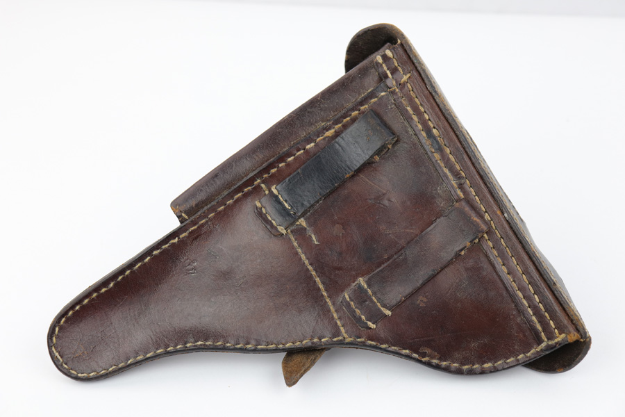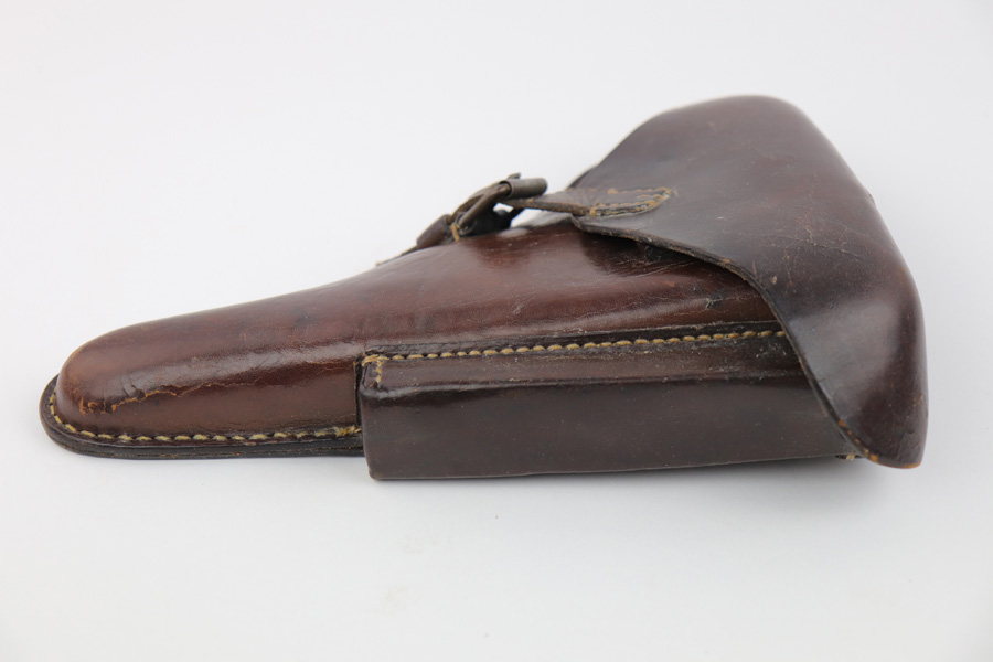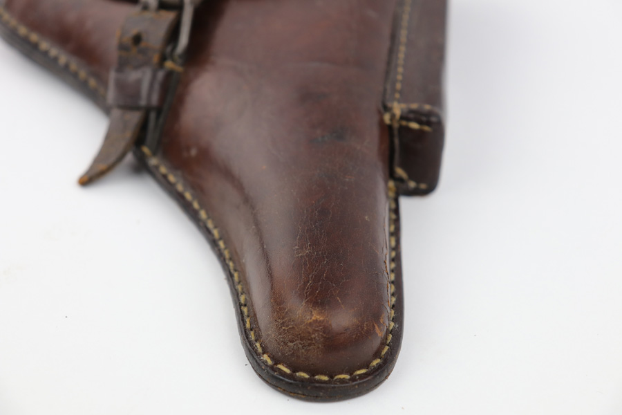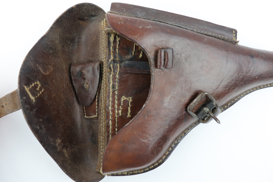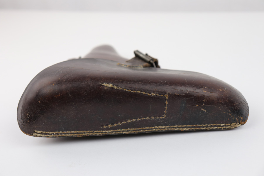 7/31/19 – This is an original Swedish commercial Luger holster. The holster has no markings except for what appears to be a faint crown stamp on the back leather. The brown leather has some wrinkling on the exterior leather as well as a few light cracks in the leather (none go all the way through). The stitching is all original and in tact. Overall in good condition and all original.