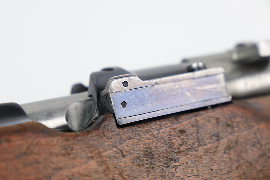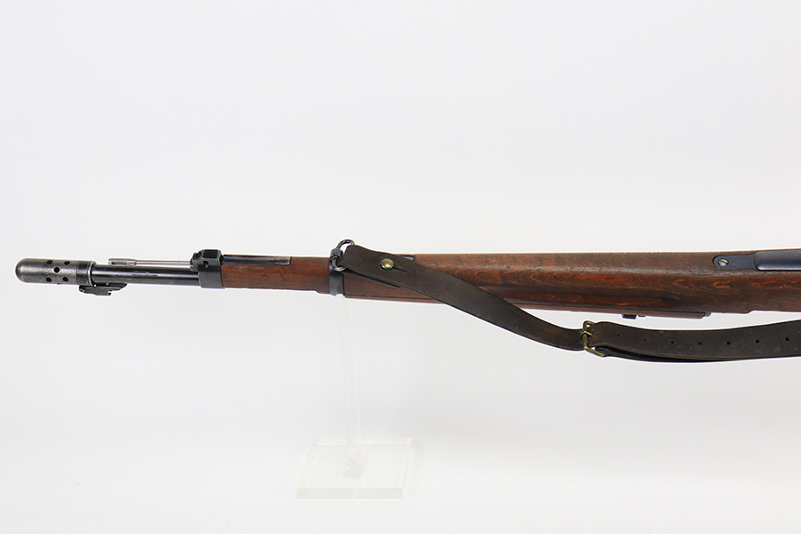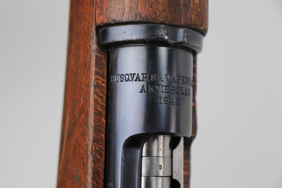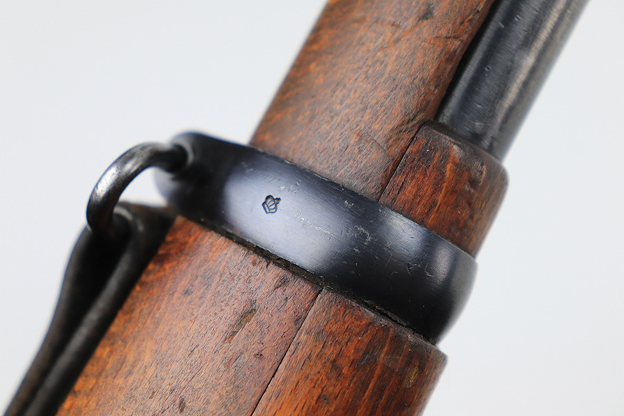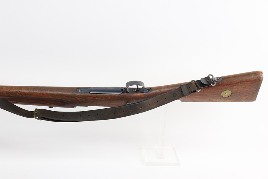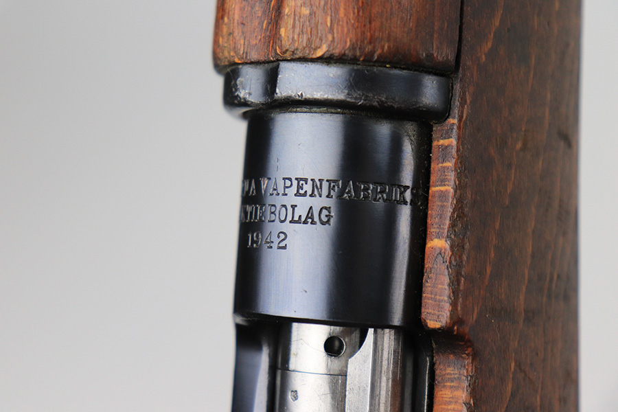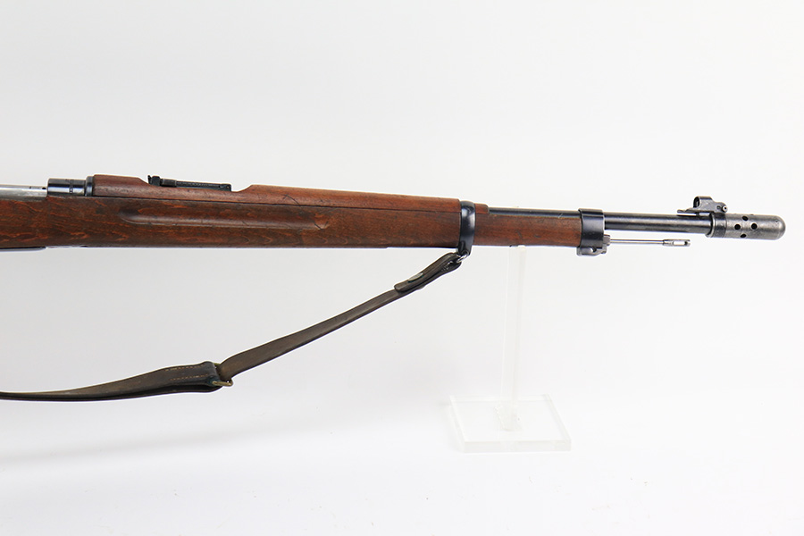12/10/21 – This is a very nice example of a Swedish Mauser M38 rifle issued to the Swedish military in 1942. This one is all matching, has the proper “Crown” Swedish military proofs throughout, and comes with an original cleaning rod and leather sling. The gun also comes with a period-correct blank-firing muzzle attachment that screws onto the end of the barrel. These were used when firing blank wood bullets – likely for training. The back of the left side of the bolt assembly is numbered with an electro pencil to match the receiver. Import mark on the barrel. The gun has retained the majority of its finish, but there is noticeable scratchy wear on the whole barrel, underside of the trigger guard, and on the bolt release lever. Some splotchy discoloration on the underside of the gun, just behind the front barrel band. Some of the small parts have retained their original fire bluing. The stock is nice and is properly “Crown”-proofed – there are just minor dings and scratches throughout. The bore is excellent – shiny with strong rifling.