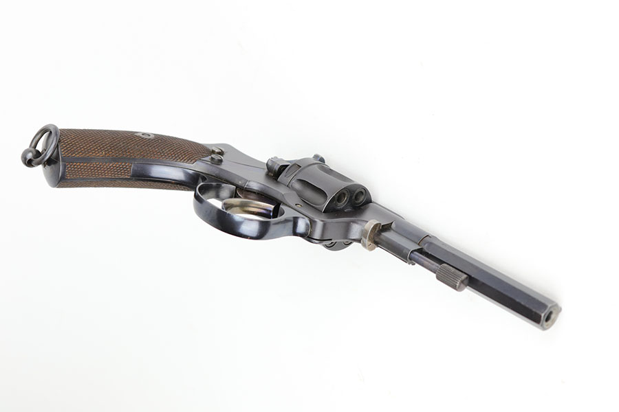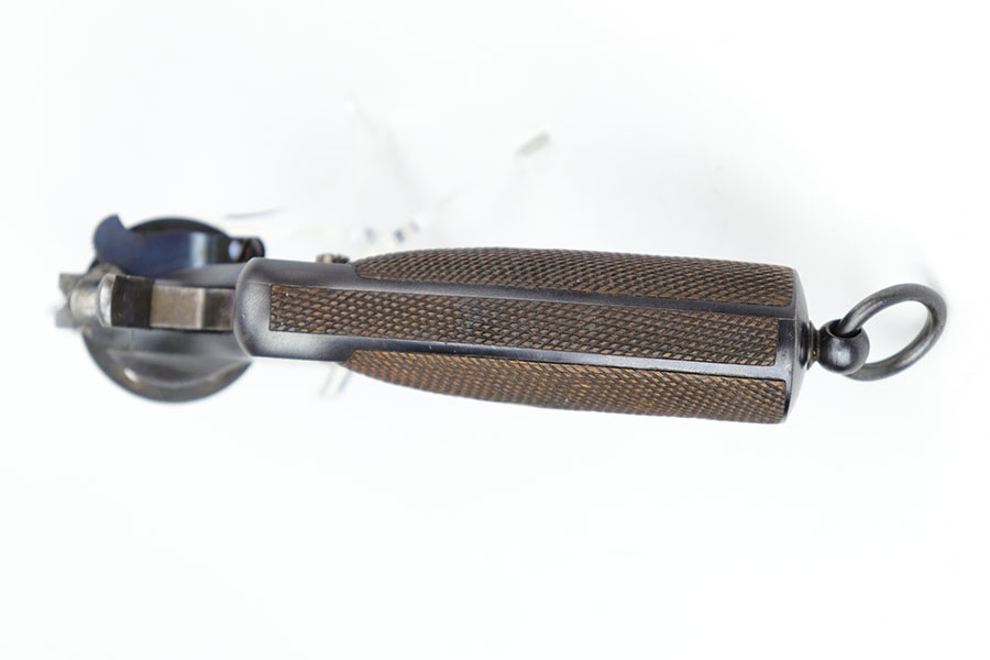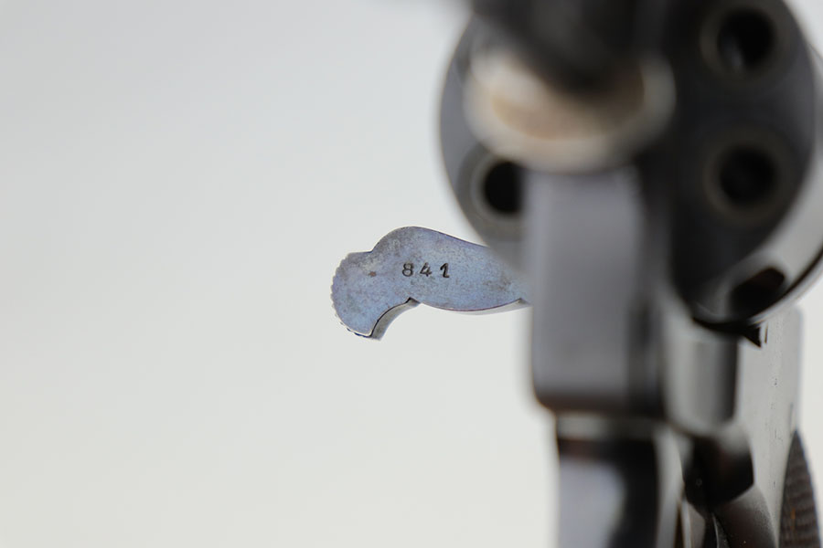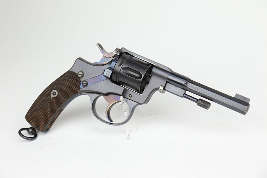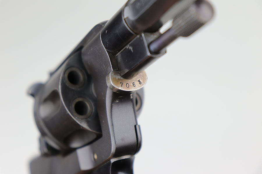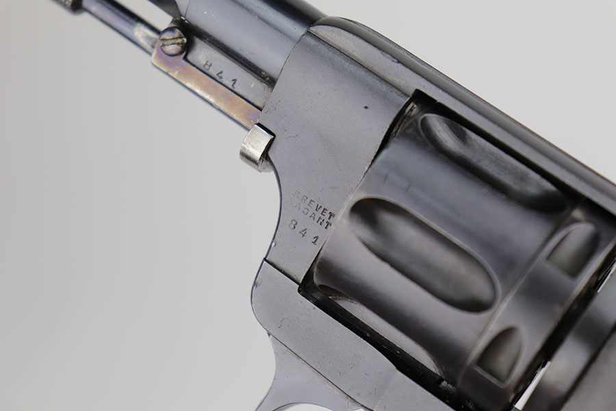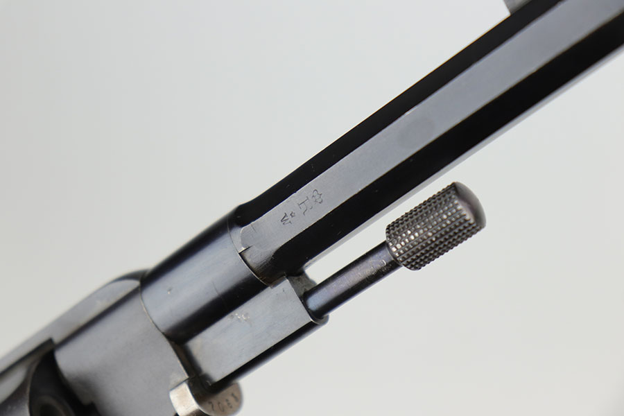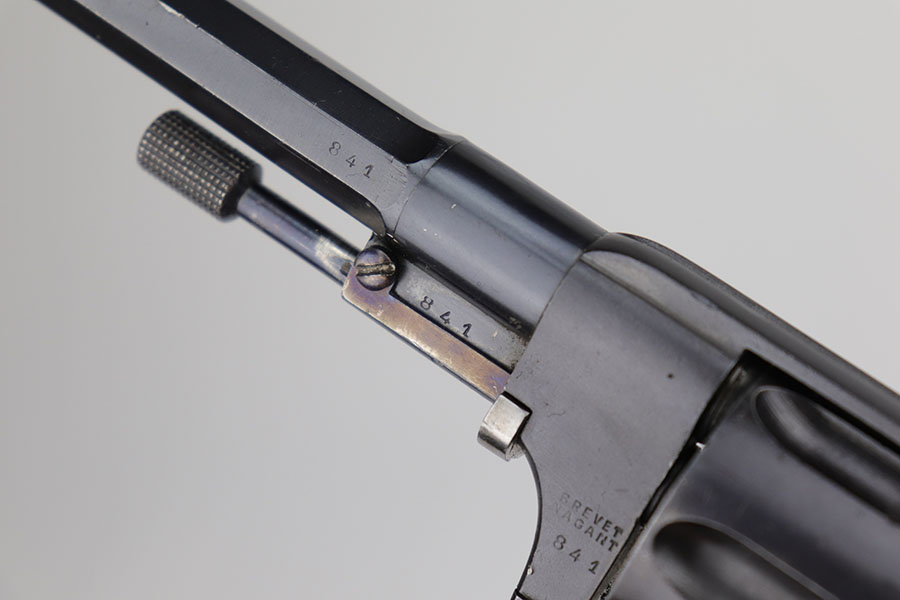 12/8/20 – This is an interesting and scarce Belgian Nagant revolver that was made for Sweden, and appears to be a training revolver as it’s chambered for .22LR. All numbers are matching except for part on underside of frame. Excellent blue, showing minimal wear. Beautiful fire blue on small parts. Minty bore and excellent grips. Crown/R and Star/W proofs on right side of barrel.