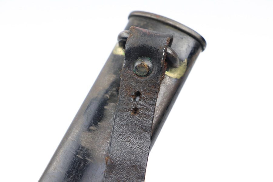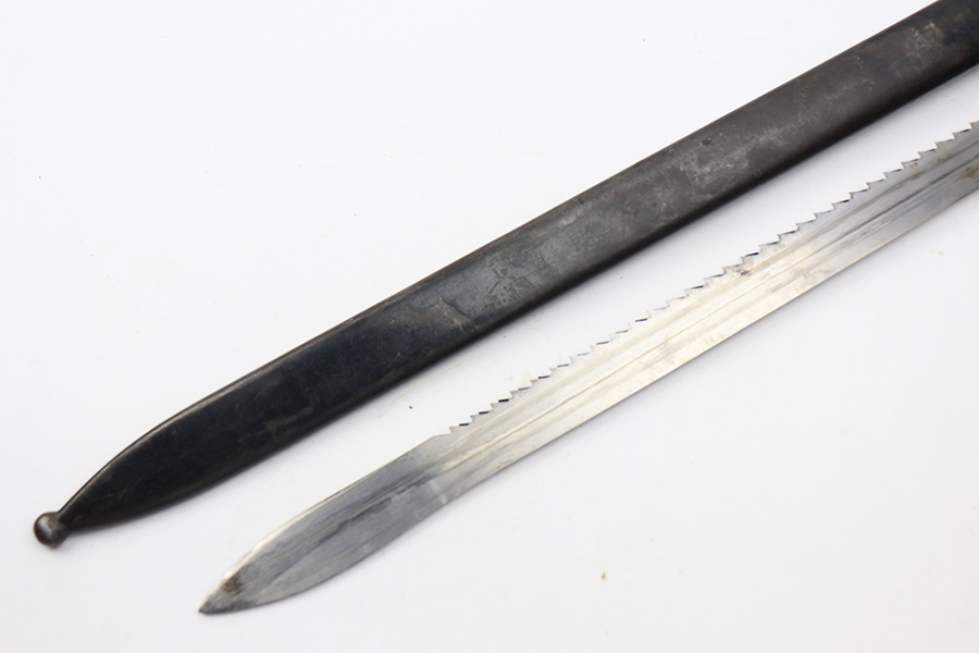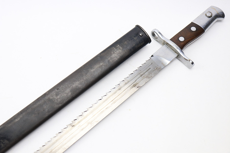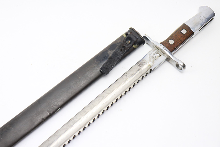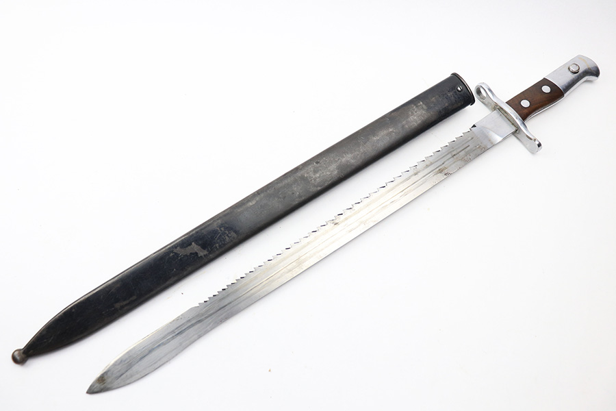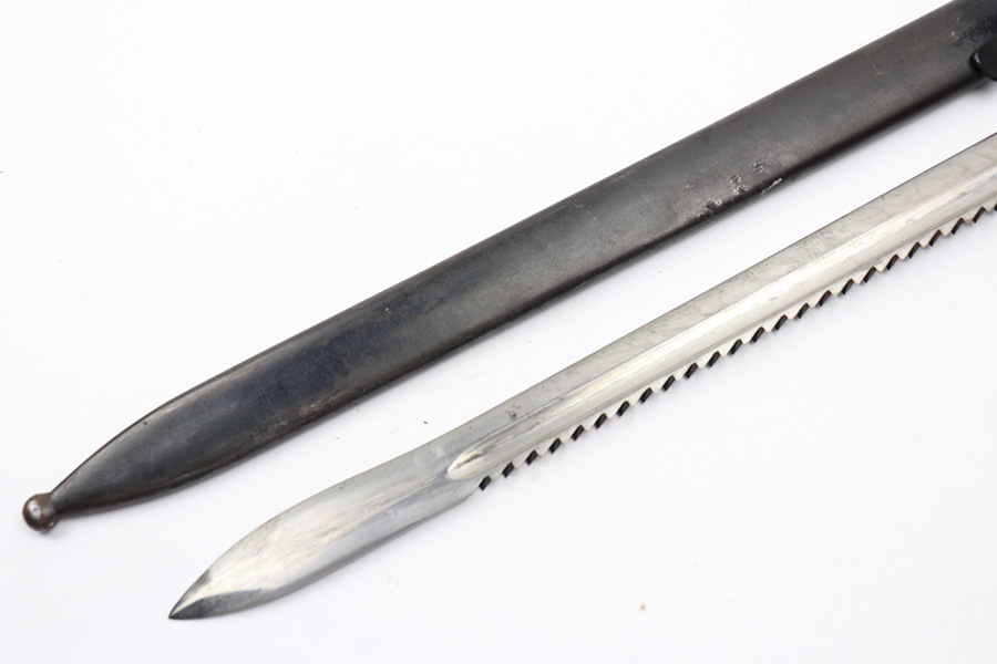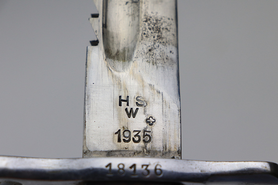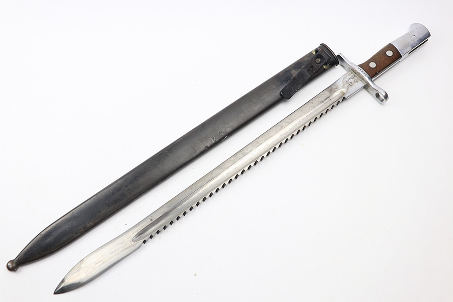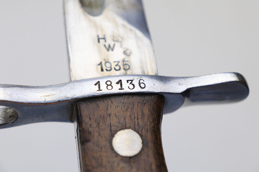 1/4/22 – This is an original WW2 era Swiss model 1914 sawback bayonet. The bayonet was issued with the K31 rifle during the WW2 era. The blade is in great condition with some mild surface oxidation and use wear. There’s also some faint signs of sharpening along the edge. Maker stamped and 1935 dated at the base of the blade. The hand guard is serial numbered. Great wood grips. The scabbard has patina throughout but no major dents. “P” stamped on one side of the scabbard.