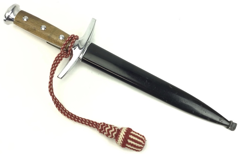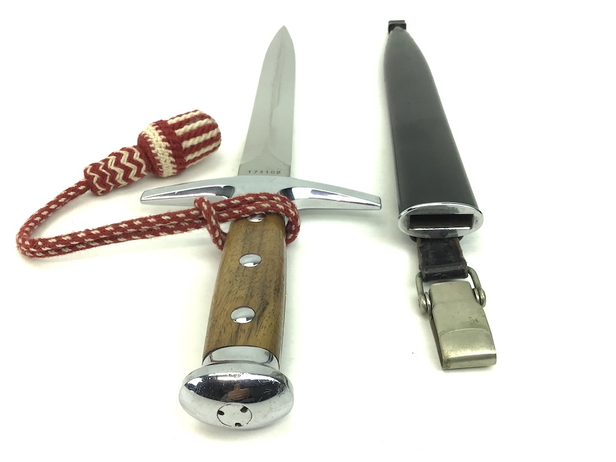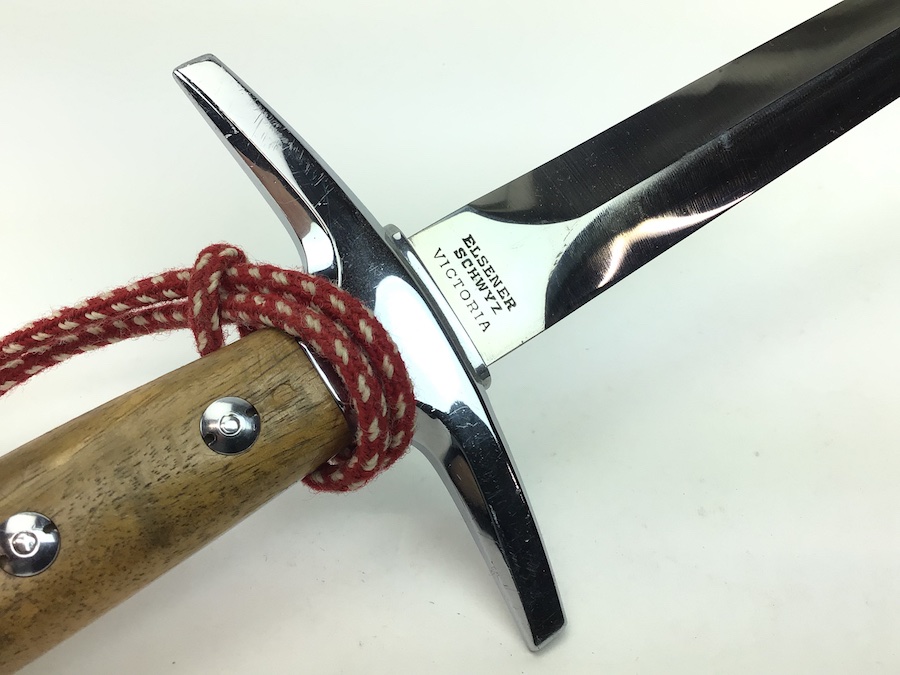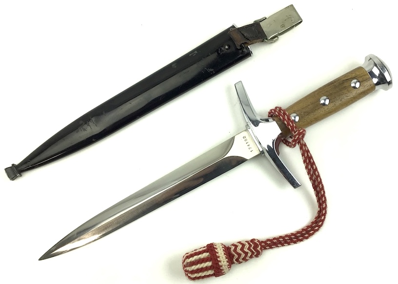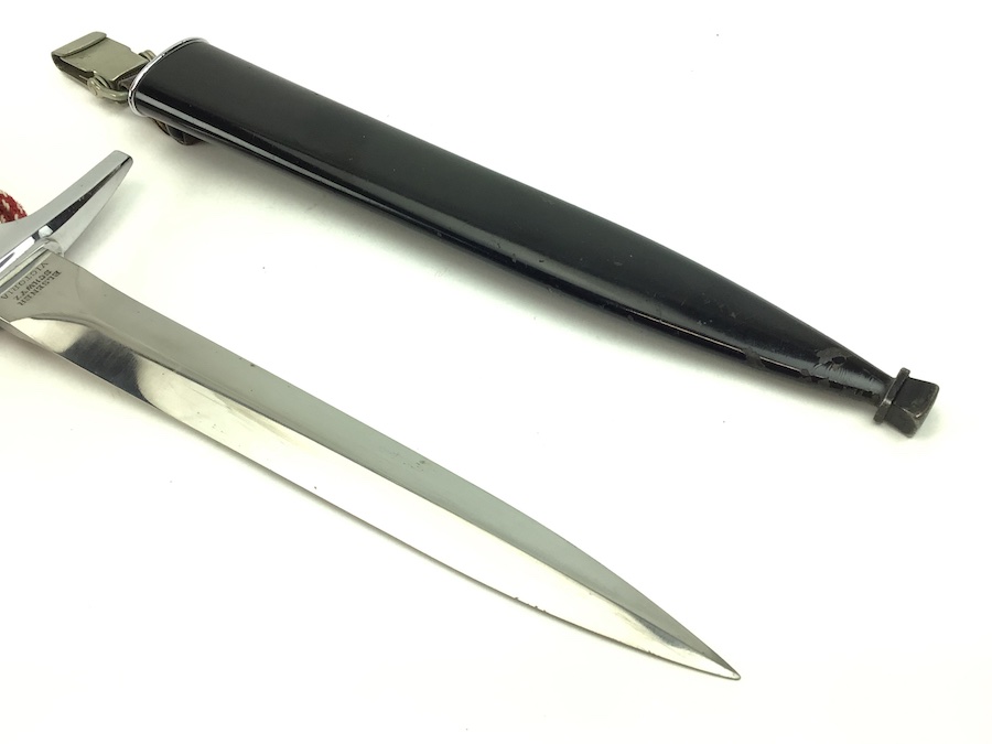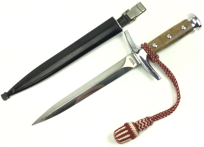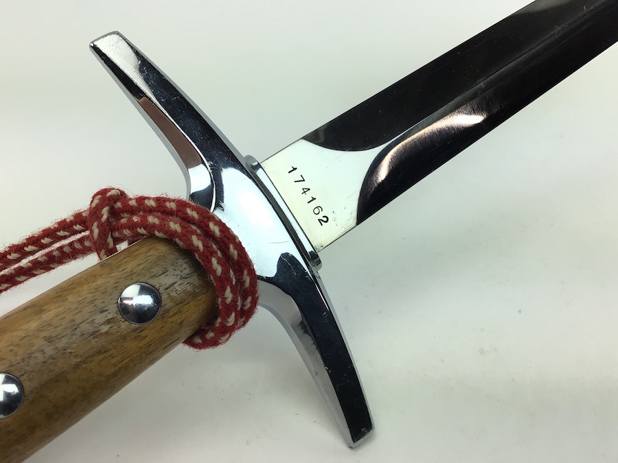 4/26/21 – Original and excellent condition Swiss Army Officer’s Dagger, Scabbard and portepee. Maker stamped on the ricasso along with a serial number on the reverse. Nickel plating has minor wear. Wood grips are secure and intact. Blade has minimal scabbard wear with no evidence of sharpening. Scabbard has a minor dimple on the back side. Great piece.