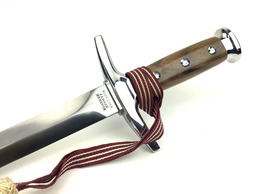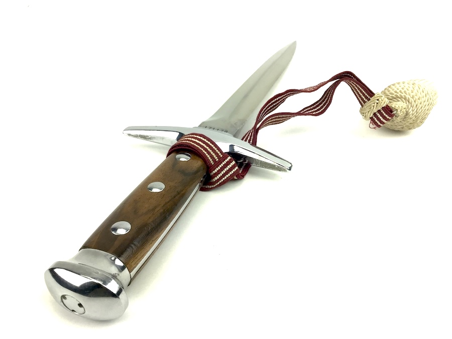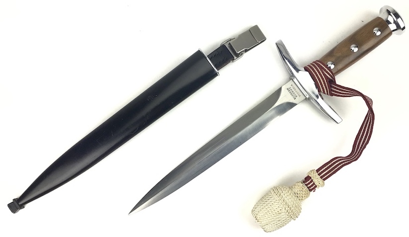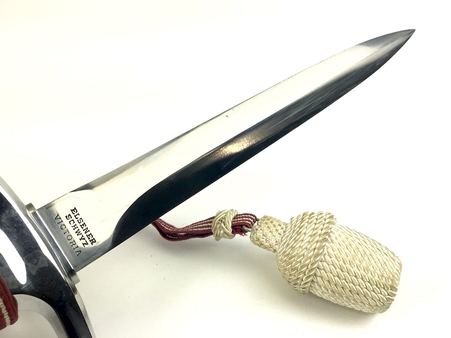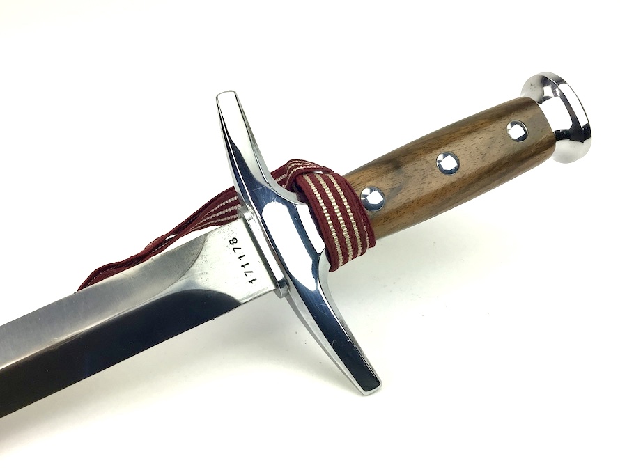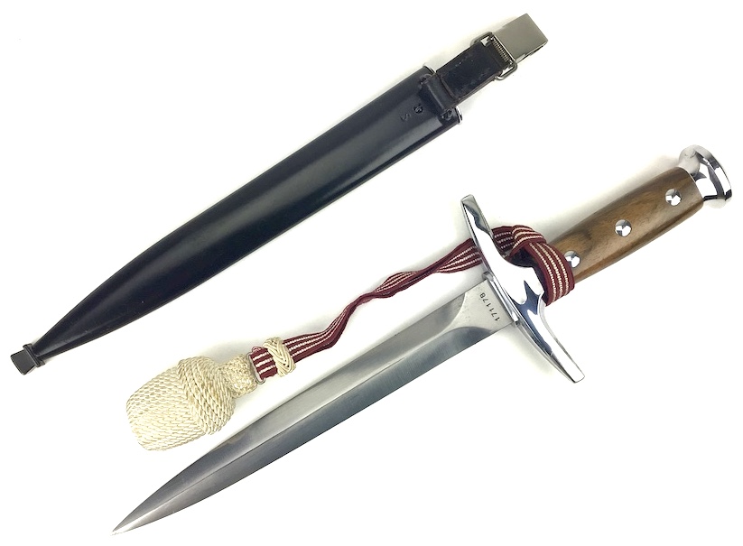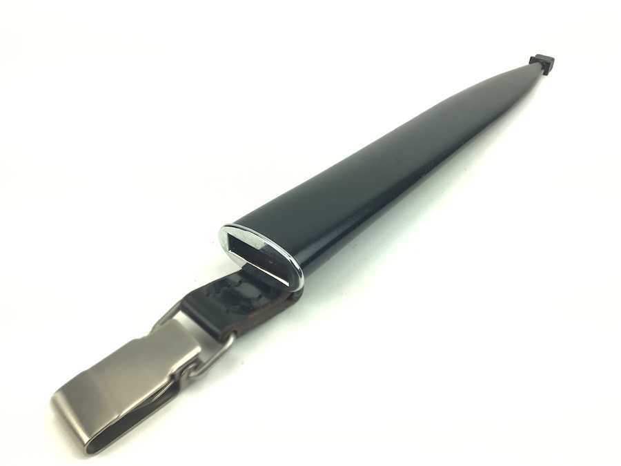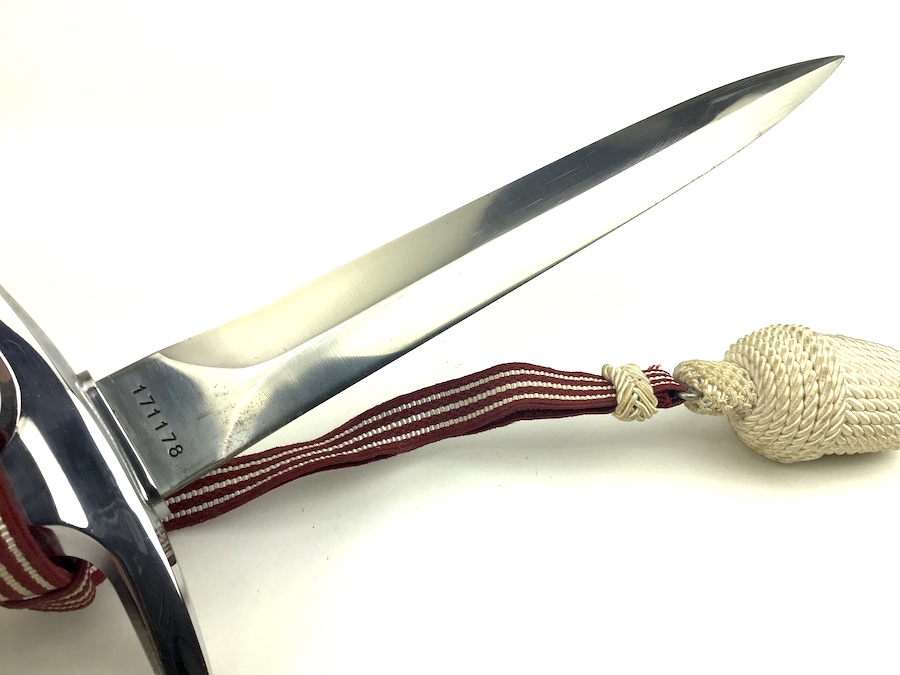 8/18/21 – Original and excellent condition Swiss Army Officer’s Dagger, Scabbard and portepee. Maker stamped on the ricasso along with a serial number on the reverse. Nickel plating has minor wear. Wood grips are secure and intact. Blade has minimal scabbard wear with no evidence of sharpening. Scabbard has an “S” stamp on the back side. Great piece.