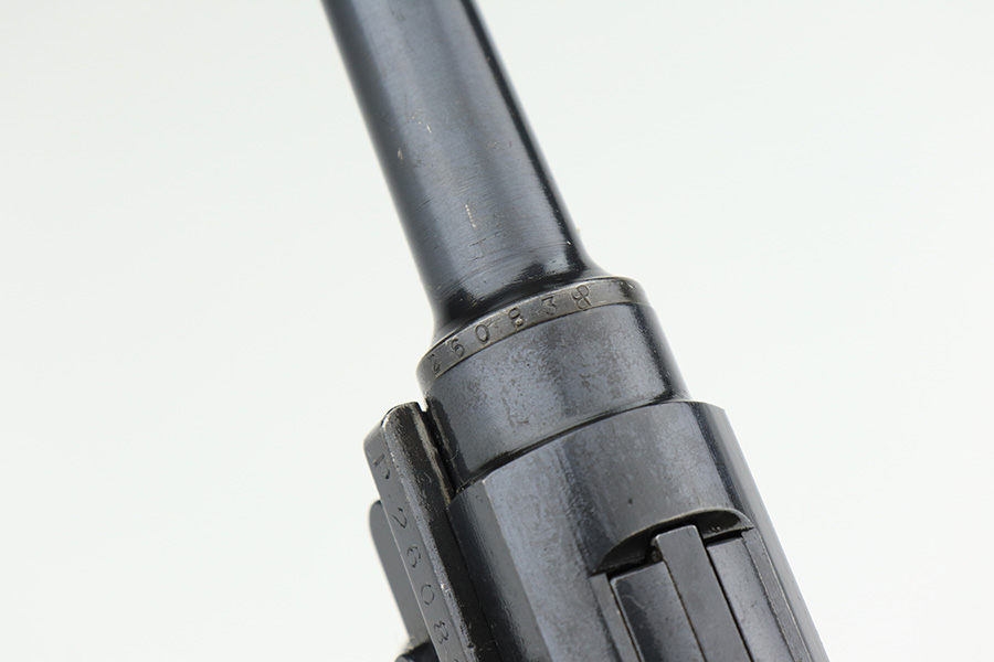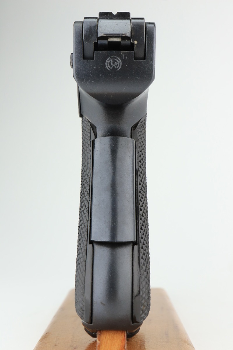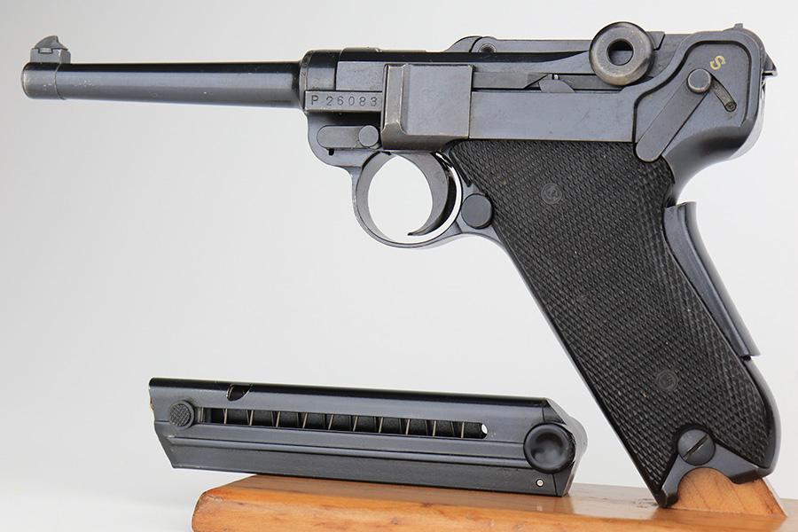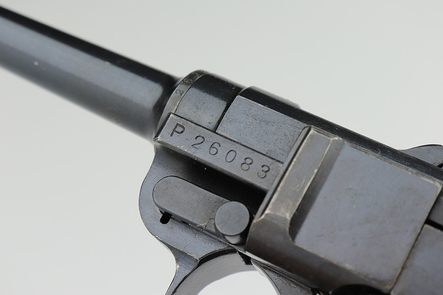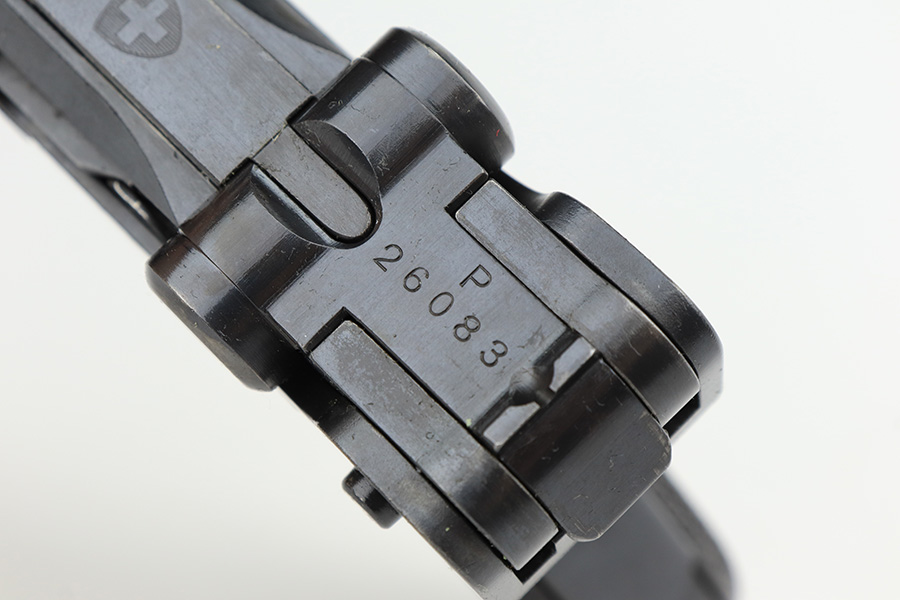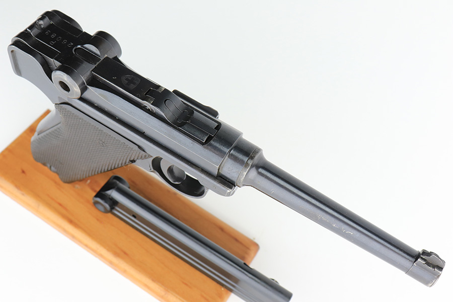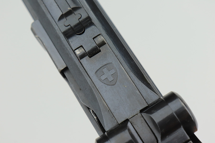 2/22/23 – This is a very nice example of a matching and original Swiss Bern Model 1929 Luger. Matching numbers on frame, barrel, sideplate and toggle. The Model 1929 featured several upgrades and updates from the previous iterations, such as the closed grip safety, and these are dated in the frame recess. This one was made in December of 1942. The P-prefix to the serial indicates this was made for private purchase. Original black bakelite grips are in great condition with no major defects. Minty bore. The blue rates at around 97% with just minor edge and surface wear, but no major spots of bluing loss. Magazine has some flaking on the base.
