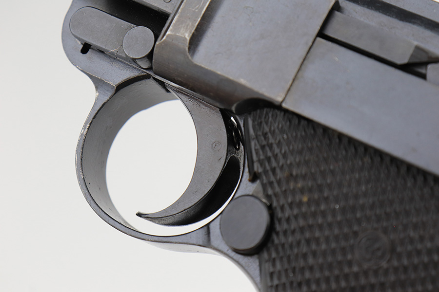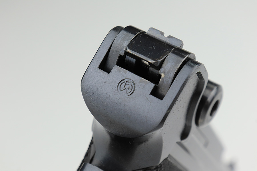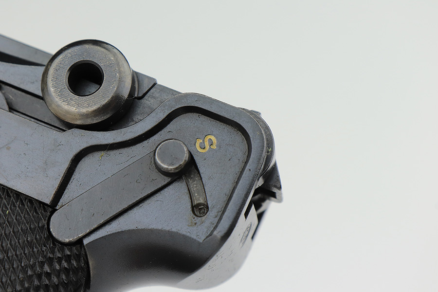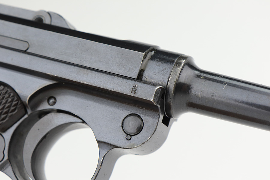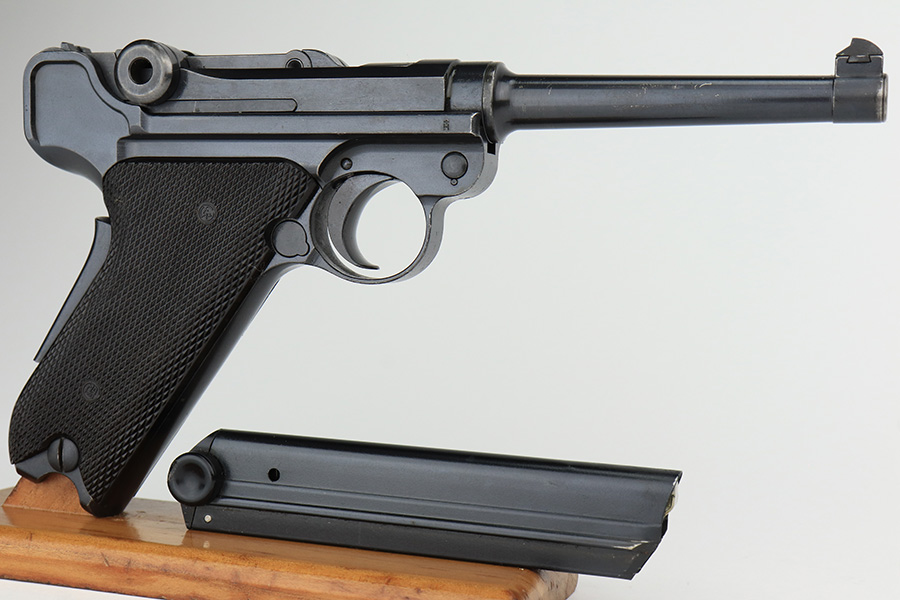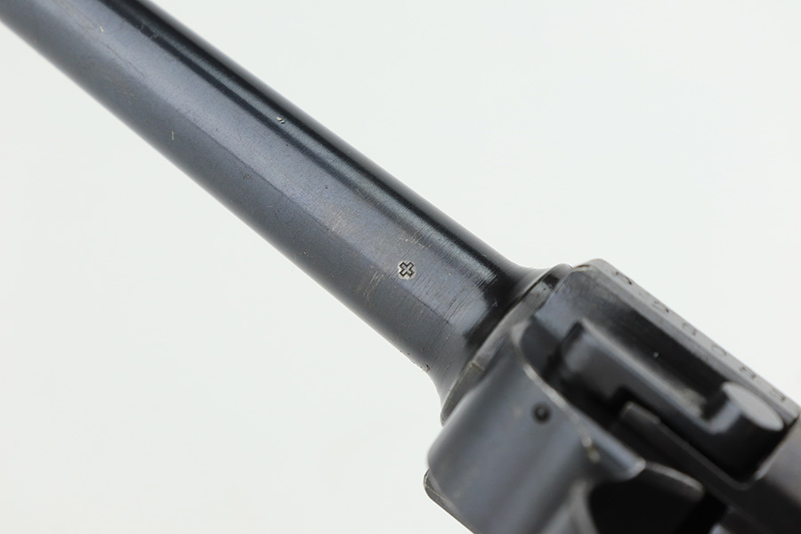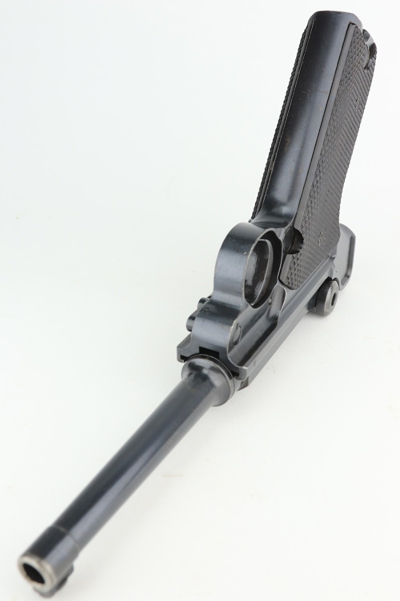2/22/23 – This is a very nice example of a matching and original Swiss Bern Model 1929 Luger. Matching numbers on frame, barrel, sideplate and toggle. The Model 1929 featured several upgrades and updates from the previous iterations, such as the closed grip safety, and these are dated in the frame recess. This one was made in December of 1942. The P-prefix to the serial indicates this was made for private purchase. Original black bakelite grips are in great condition with no major defects. Minty bore. The blue rates at around 97% with just minor edge and surface wear, but no major spots of bluing loss. Magazine has some flaking on the base.