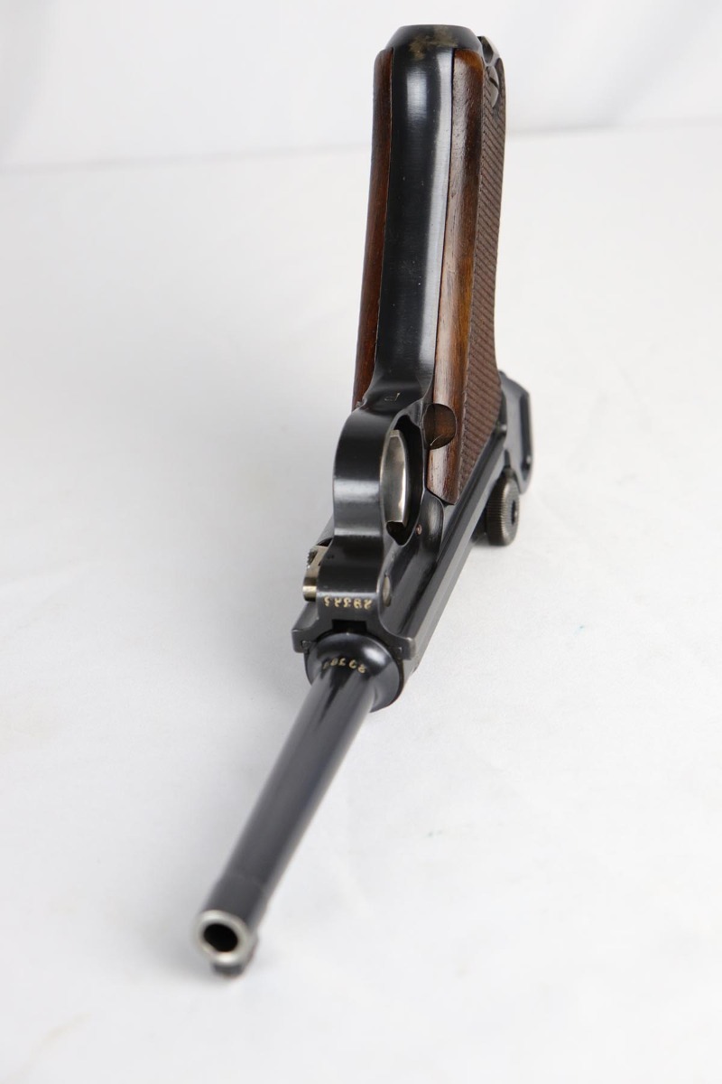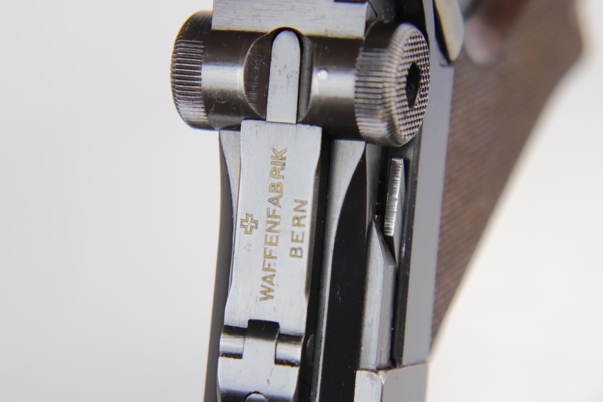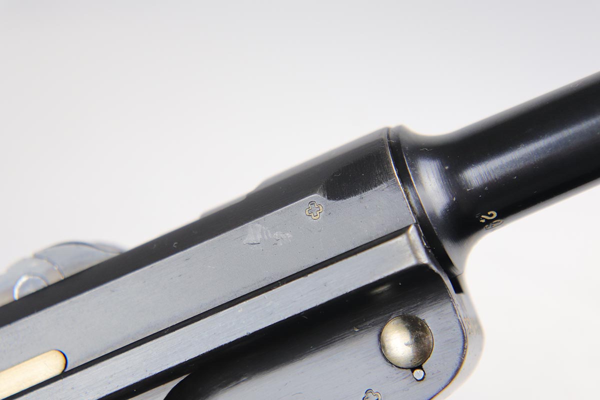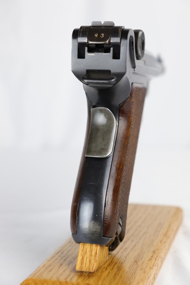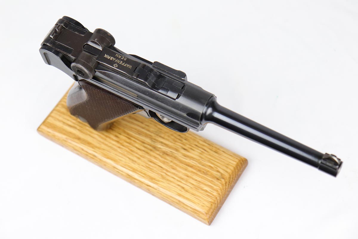 5/25/18 – Switzerland was the first country to adopt the Luger as a military sidearm with its contract purchase of the Model 1900 from DWM. Once WWI started DWM could no longer supply Switzerland with Lugers so the Swiss firm of Waffenfabrik Bern produced its own version of the Model 1906. This pistol is one of the Swiss made copies of the German Model 1906. Approximately 17,000 of these pistols were manufactured for the Swiss military and were most likely produced between 1918 and 1933. This Luger has fixed sights, with a blank chamber and the top of the toggle marked with a Geneva Cross over “WAFFENFABRIK / BREN”. The right side of the barrel extension has a small Geneva Cross with the reverse having a boxed “+ / M” Colonel Muhlemann proof and a “BP”. Full serial number on barrel and front of frame with a small Geneva Cross on the barrel.   The finish on this one rates at about 95% with some thinning to the sideplate, grip safety and bottom of front strap.  The grips are unique in that they are checkered with smooth borders on the front and rear edges and are numbered to the gun.  Minty bore.