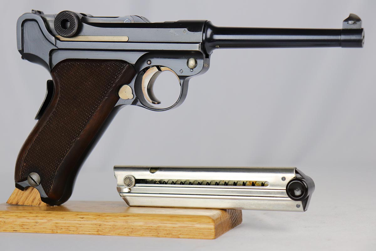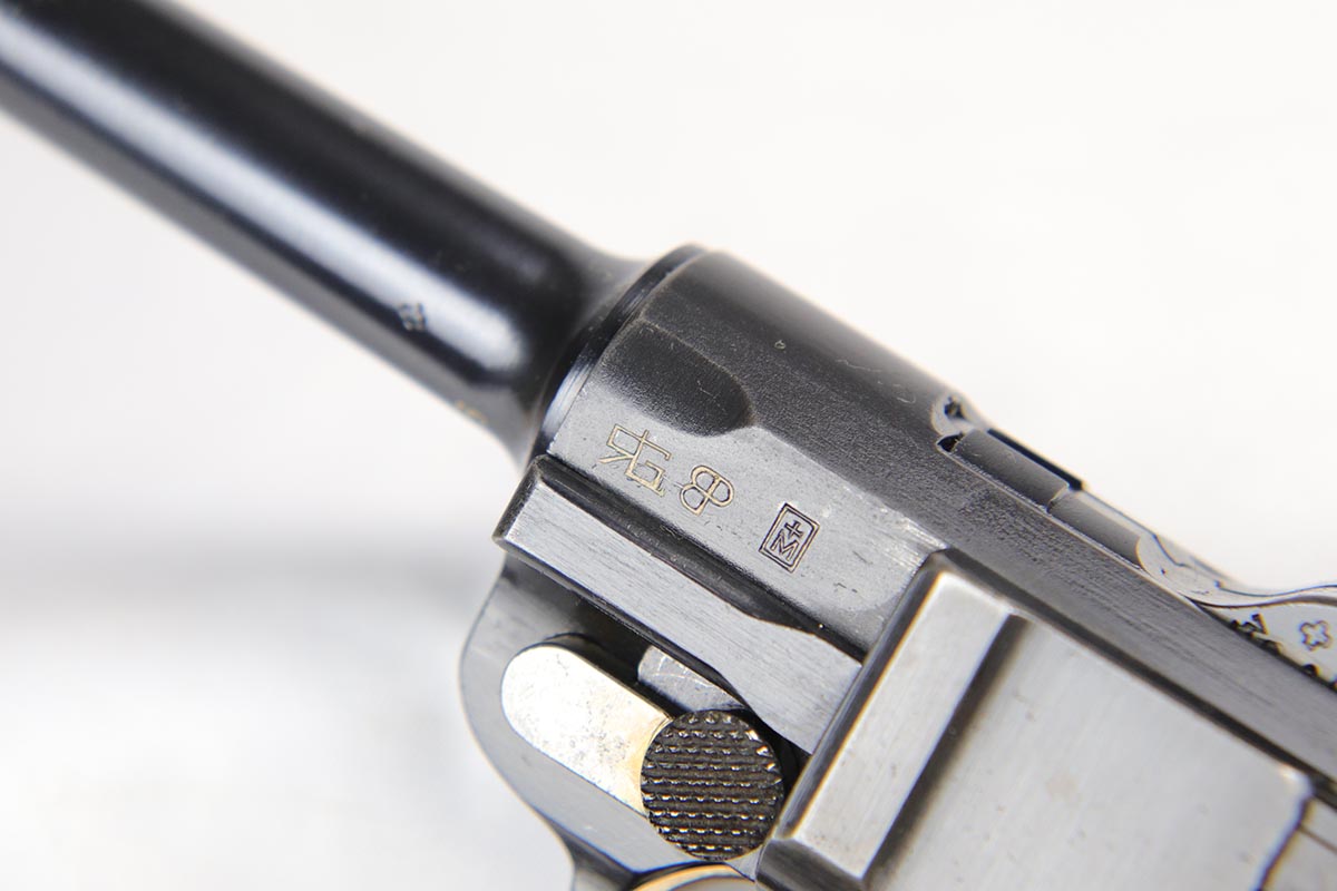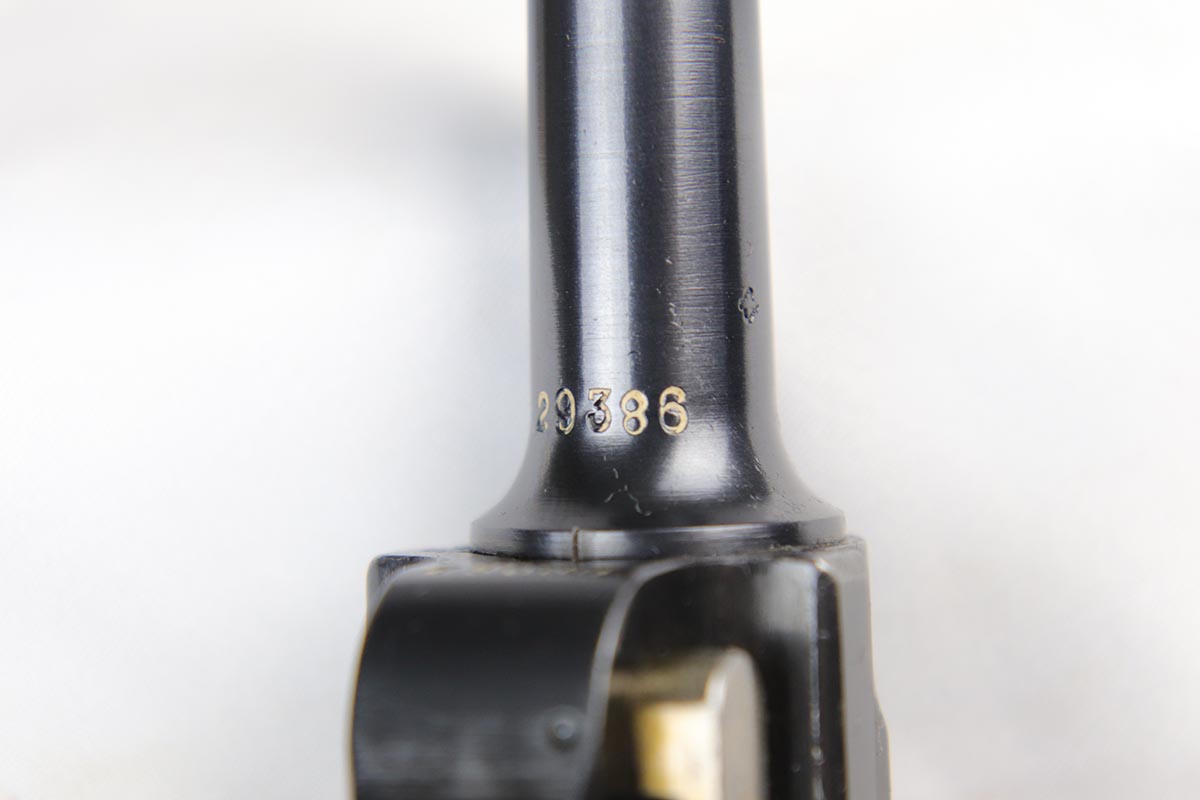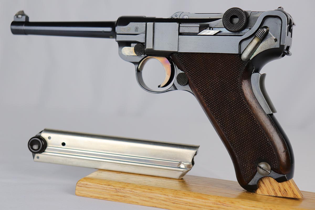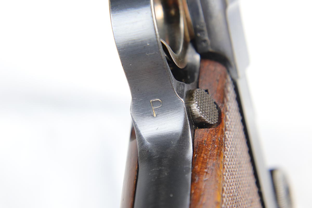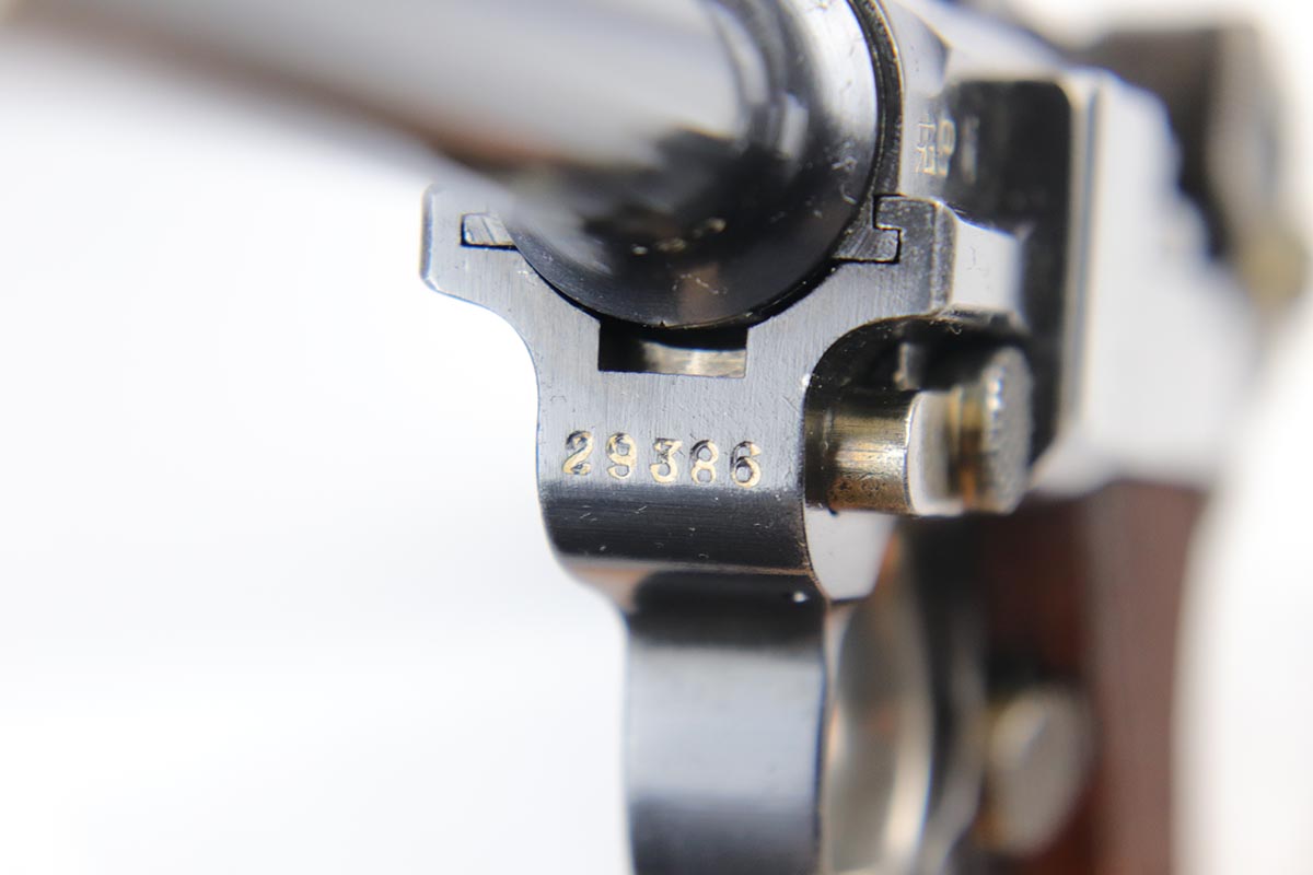 5/25/18 – Switzerland was the first country to adopt the Luger as a military sidearm with its contract purchase of the Model 1900 from DWM. Once WWI started DWM could no longer supply Switzerland with Lugers so the Swiss firm of Waffenfabrik Bern produced its own version of the Model 1906. This pistol is one of the Swiss made copies of the German Model 1906. Approximately 17,000 of these pistols were manufactured for the Swiss military and were most likely produced between 1918 and 1933. This Luger has fixed sights, with a blank chamber and the top of the toggle marked with a Geneva Cross over “WAFFENFABRIK / BREN”. The right side of the barrel extension has a small Geneva Cross with the reverse having a boxed “+ / M” Colonel Muhlemann proof and a “BP”. Full serial number on barrel and front of frame with a small Geneva Cross on the barrel.   The finish on this one rates at about 95% with some thinning to the sideplate, grip safety and bottom of front strap.  The grips are unique in that they are checkered with smooth borders on the front and rear edges and are numbered to the gun.  Minty bore.