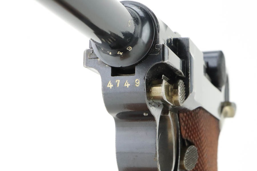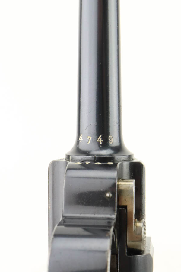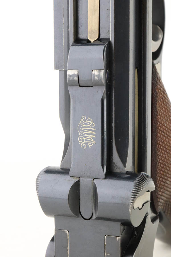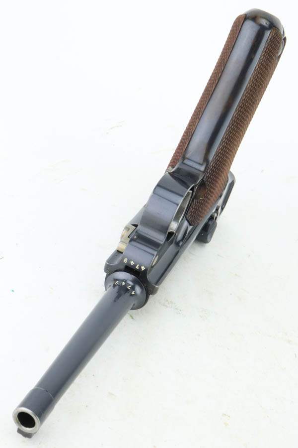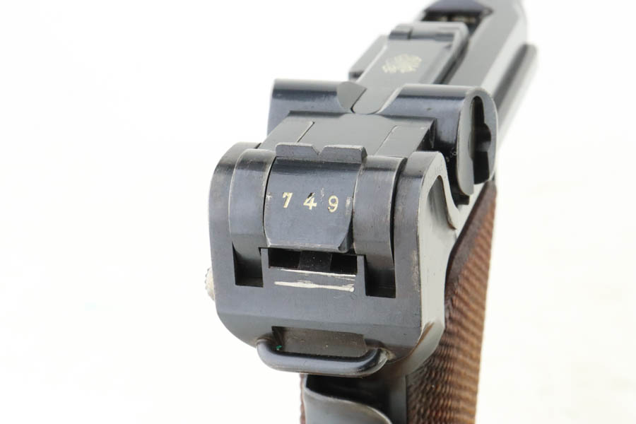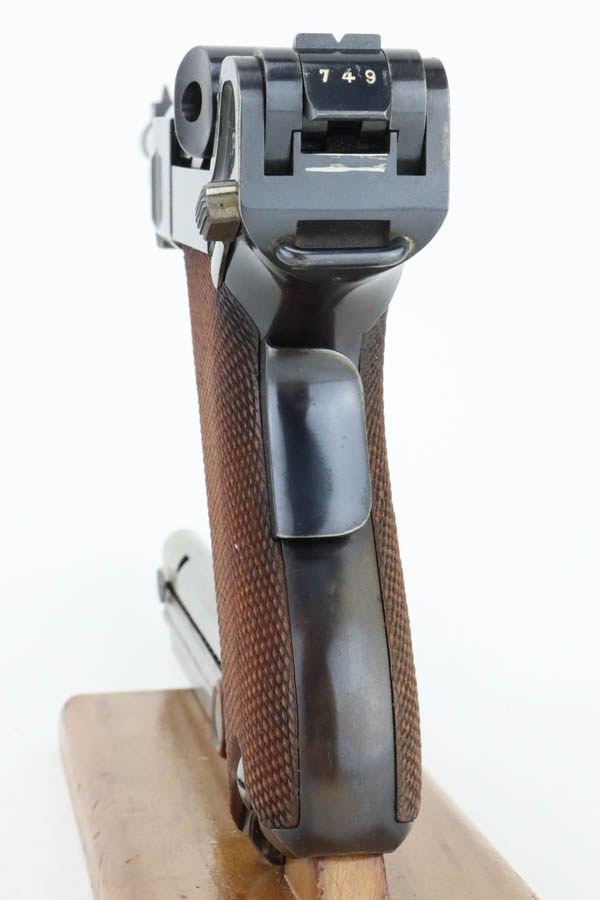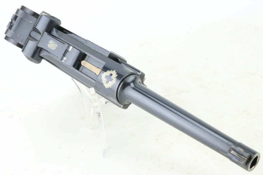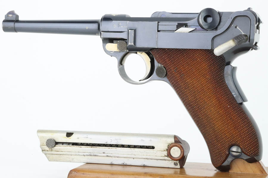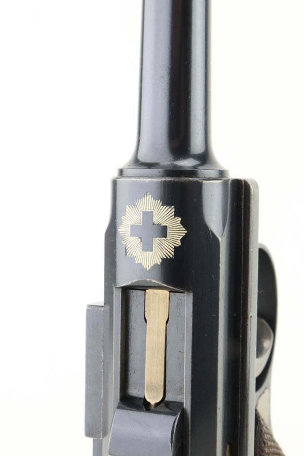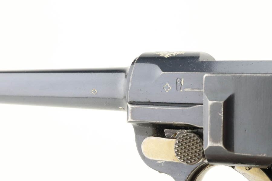 5/29/24 – This is a very nice example of an early Swiss contract DWM Luger. It’s a Model 1900 variation with dish toggle and wide trigger guard All matching, Swiss cross in sunburst over chamber, and Swiss cross markings throughout. It is all matching and has retained about 95% of its bluing. While there is very little actual finish loss, there is spotty brown patina on the grip straps. Fitted with minty matching-numbered wood grips. Comes with a proper Swiss magazine. Minty bore.