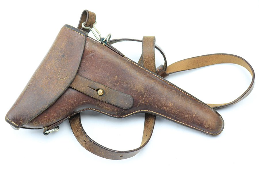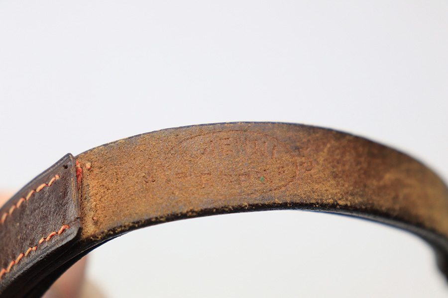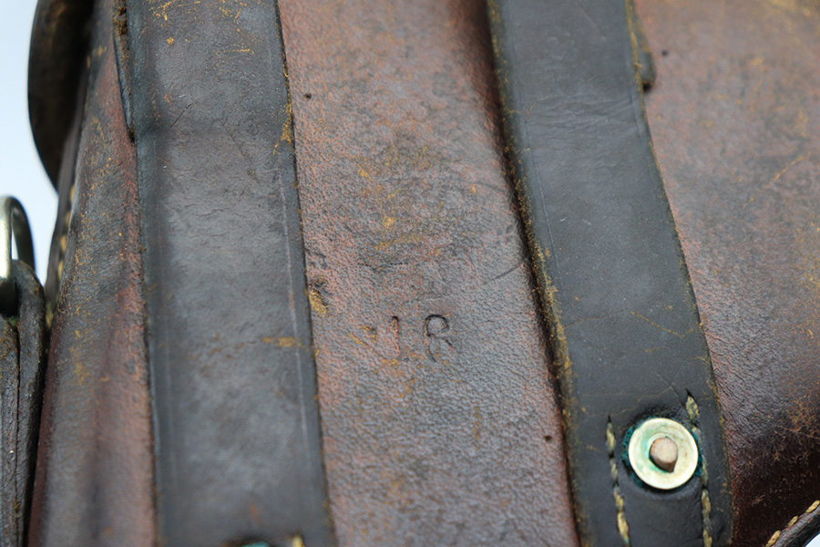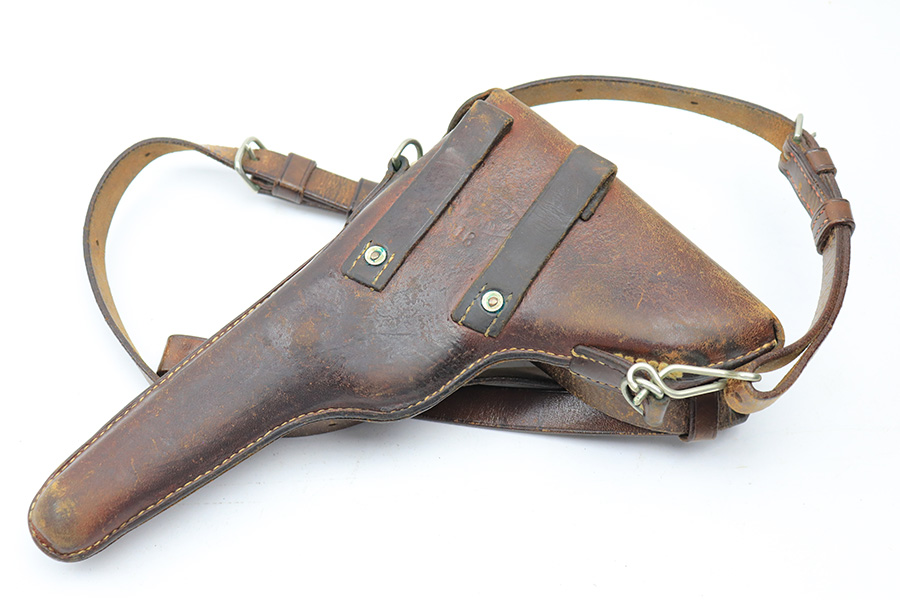12/28/22 – This is an original Swiss Luger holster from 1916. The holster is maker stamped on the back leather with a “16” date stamp underneath. The maker stamp is faint and hard to decipher. There’s another maker stamp on the shoulder strap, which is also faint and hard to read. The interior lid is stamped with a faint Swiss logo. The leather is in good condition with some surface scuffing and mild wrinkling throughout. Normal signs of aging and previous use are also present. The back belt loops have been reinforced with rivets. Nice, original stitching throughout.