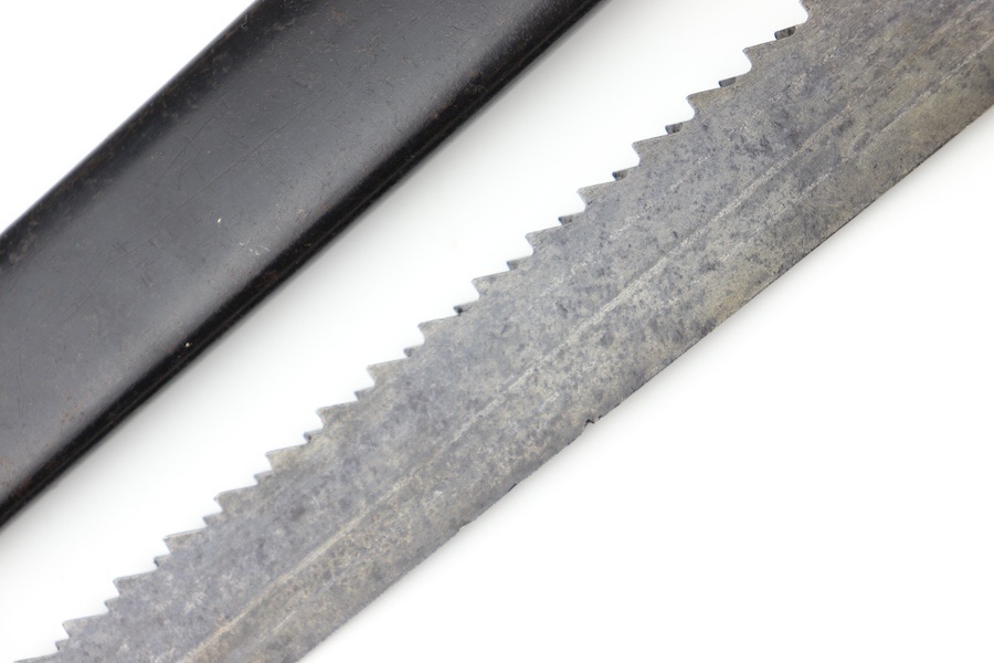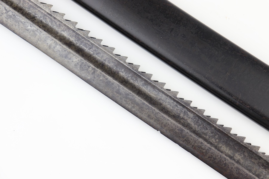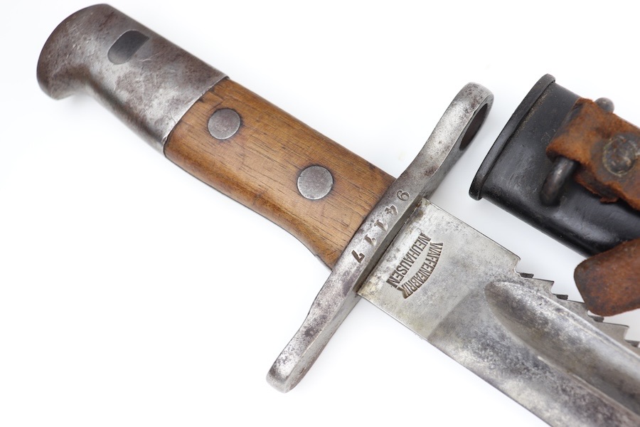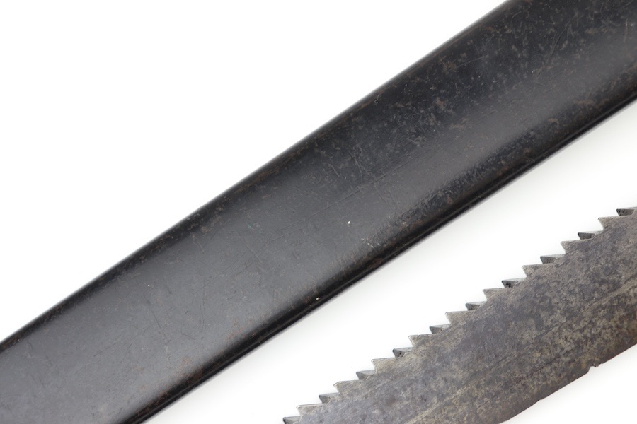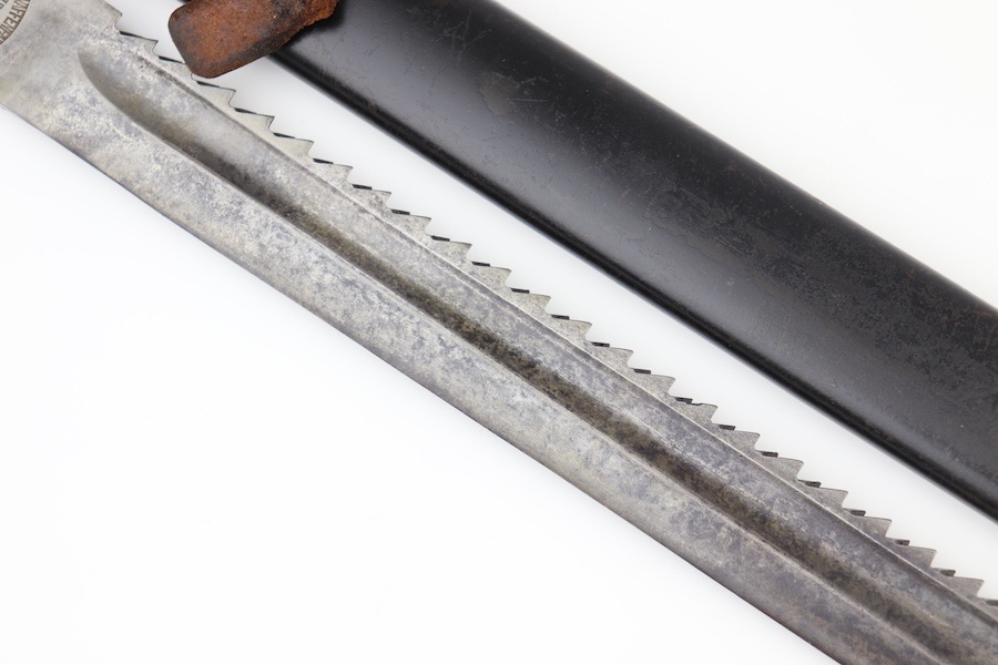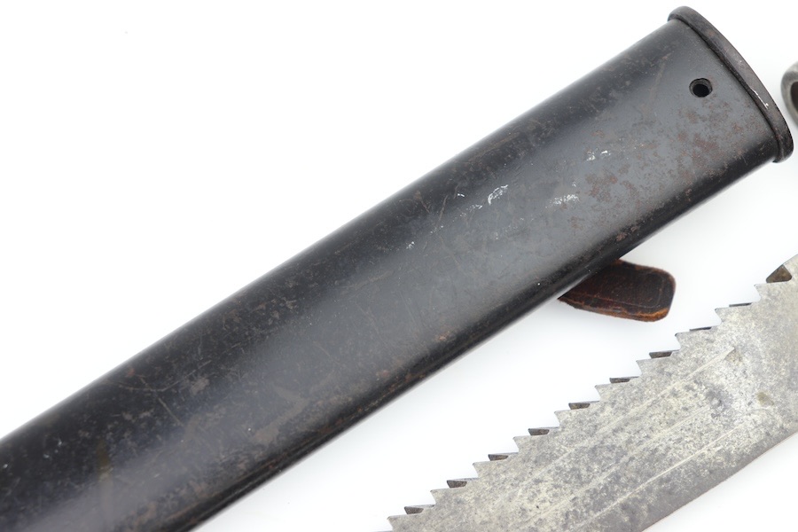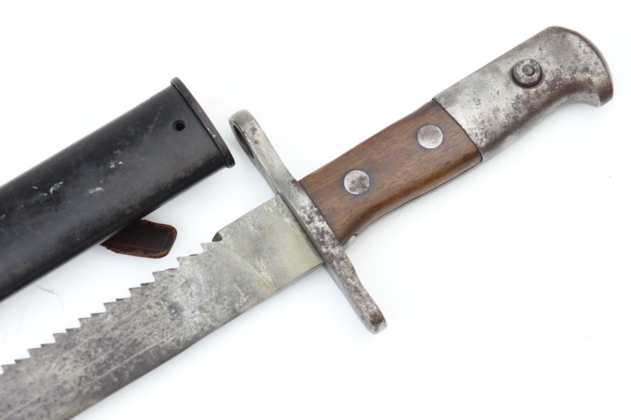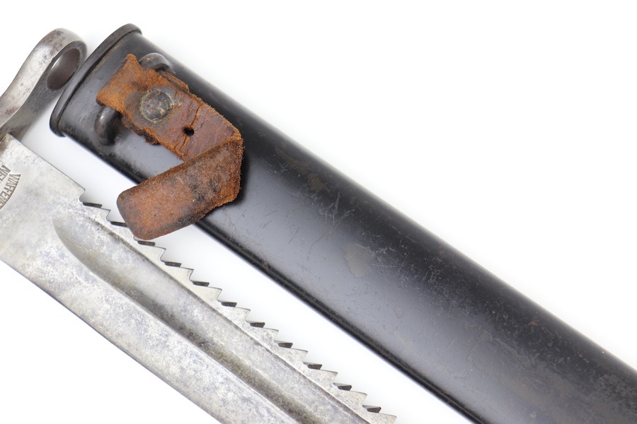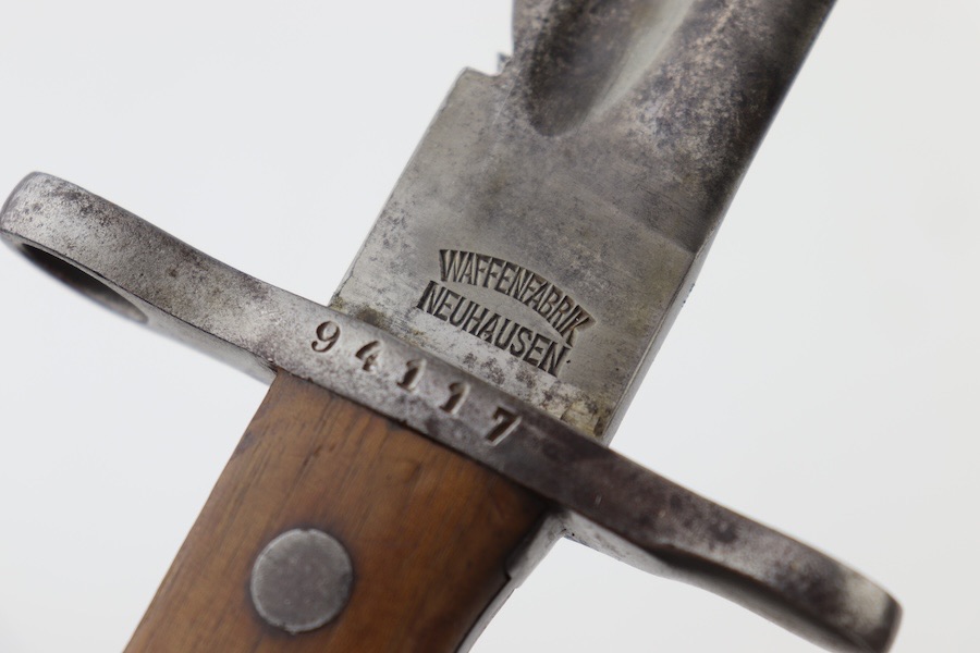 12/22/23 – This is an original M1914 Sawback Bayonet. This bayonet was issued with the K31 rifle during the WW2 era. The blade is in great overall condition, but there is a darker discoloration on the surface of the blade. The edge has not been sharpened. The maker stamp on the ricasso reads Waffenfabrik Neuhausen; just below is the serial number on the cross guard, 94117. Wood grips show minor aging with no major problems. The scabbard is without dents, rust, or pitting.
