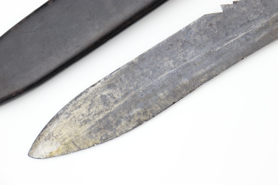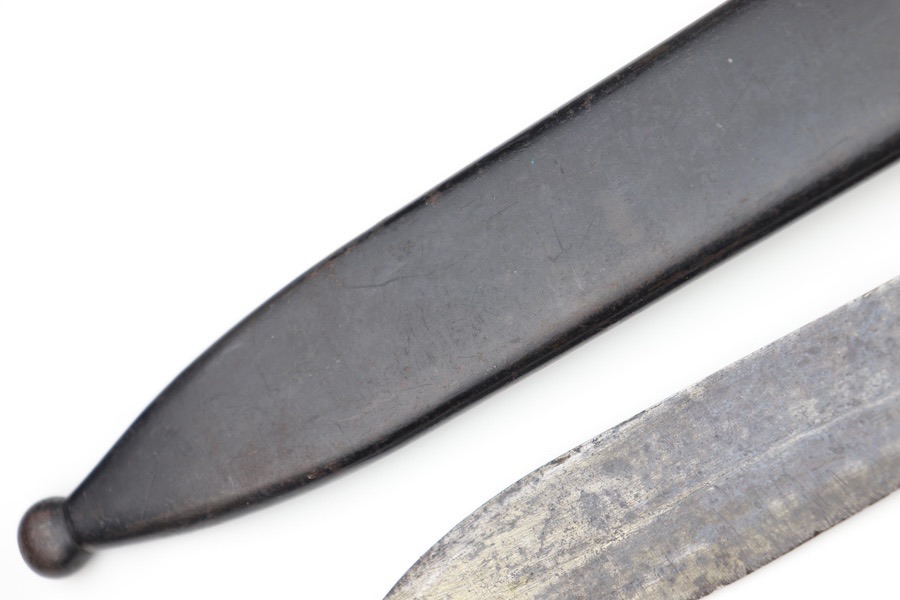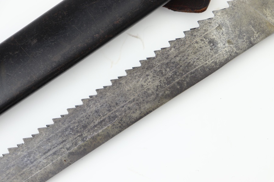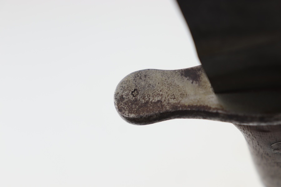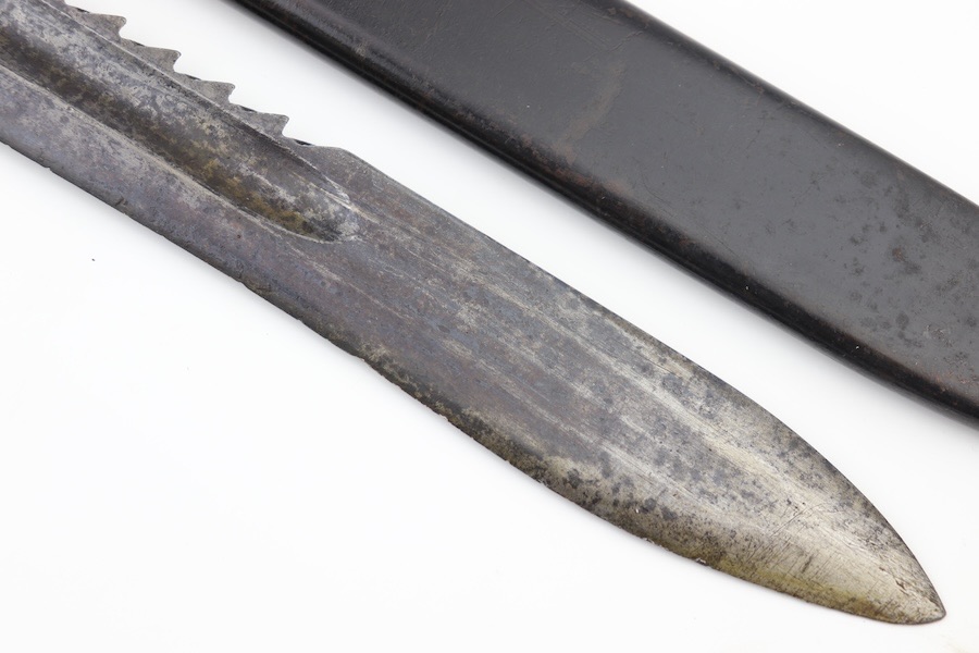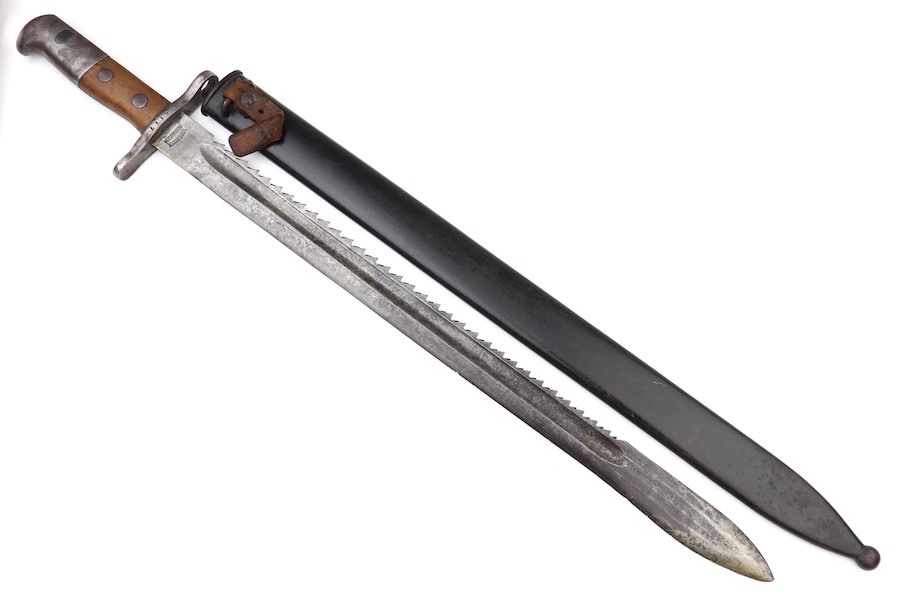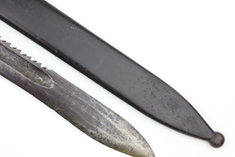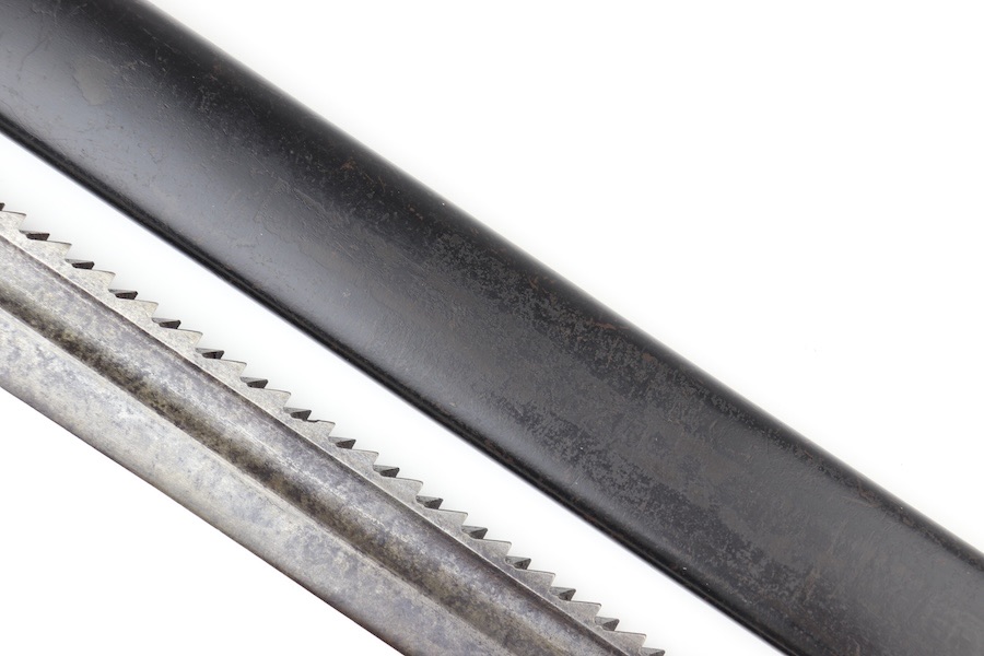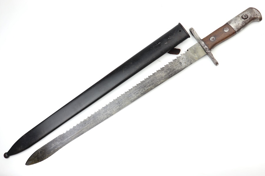 12/22/23 – This is an original M1914 Sawback Bayonet. This bayonet was issued with the K31 rifle during the WW2 era. The blade is in great overall condition, but there is a darker discoloration on the surface of the blade. The edge has not been sharpened. The maker stamp on the ricasso reads Waffenfabrik Neuhausen; just below is the serial number on the cross guard, 94117. Wood grips show minor aging with no major problems. The scabbard is without dents, rust, or pitting.