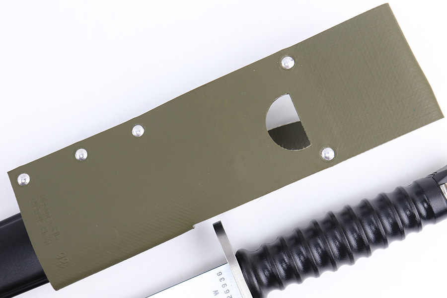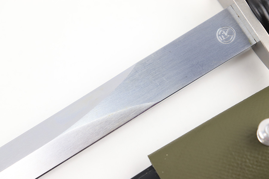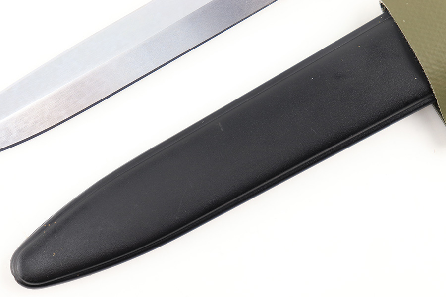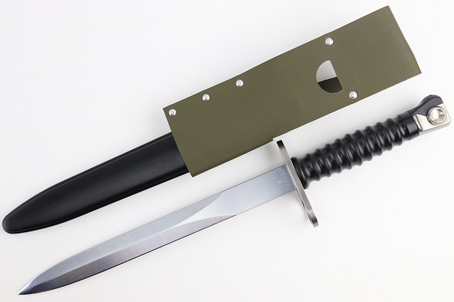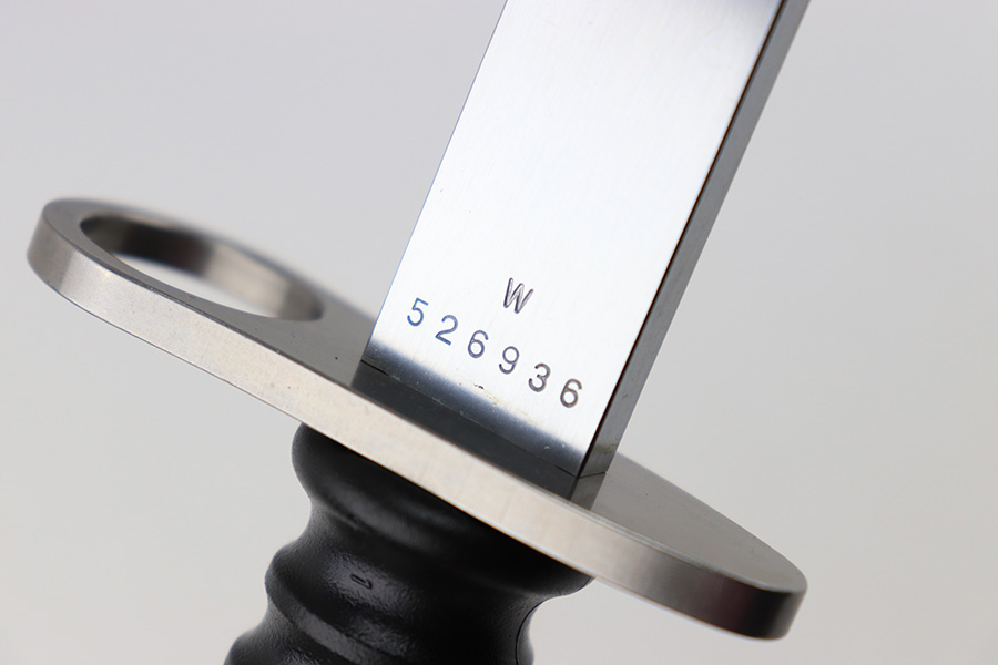8/21/23 – This is a mint, unissued condition M57 Swiss rifle bayonet by Wenger. The bayonet comes with an original scabbard and olive green colored frog. The bayonet blade is very clean with a serial number stamped on one side of the blade base, and a Wenger maker stamp on the other side. There are no other markings. The frog is made from a rubberized / canvas cloth material. Very clean overall with virtually no wear of note.