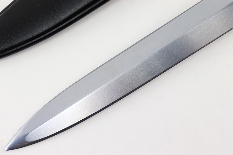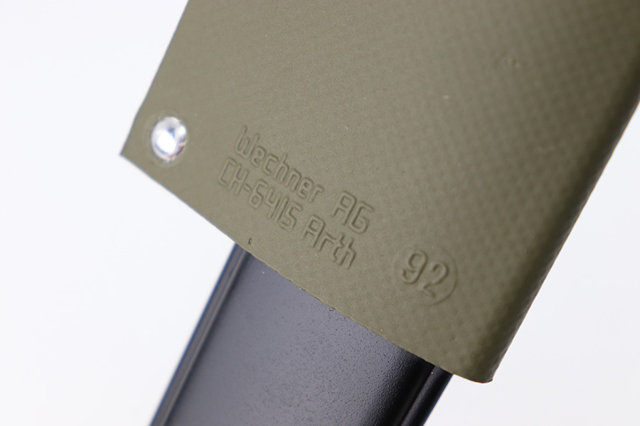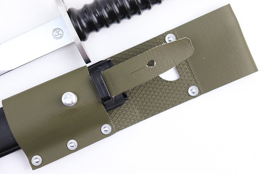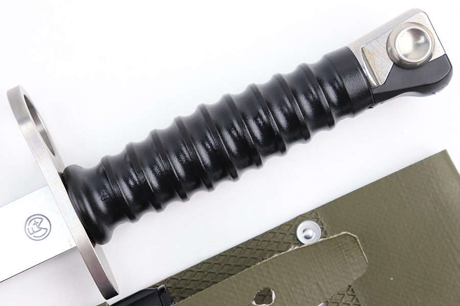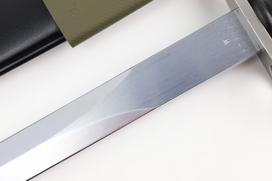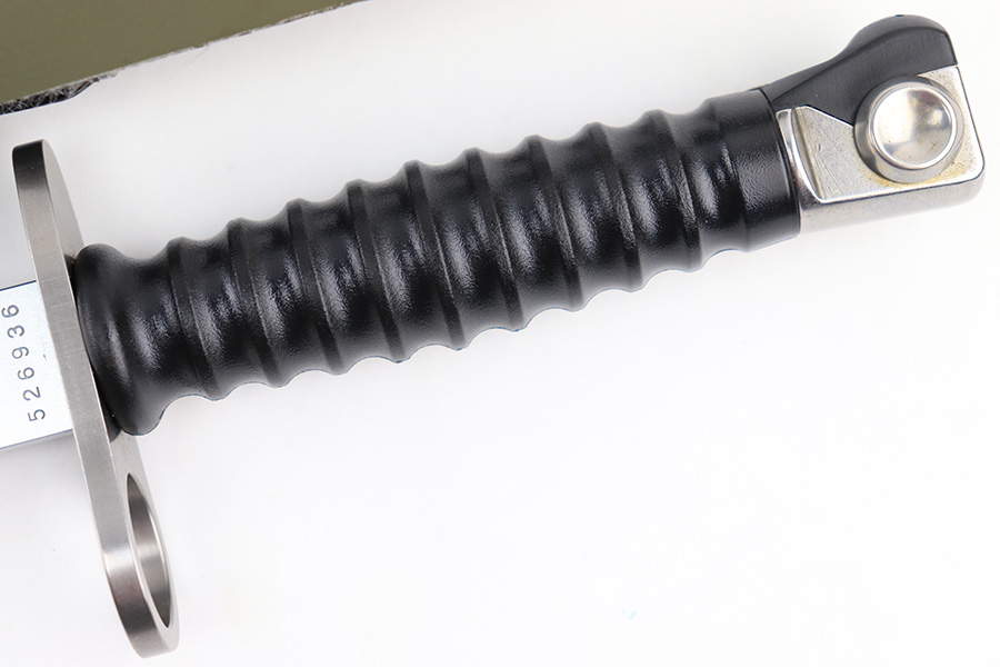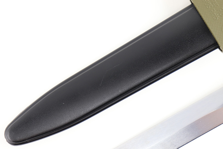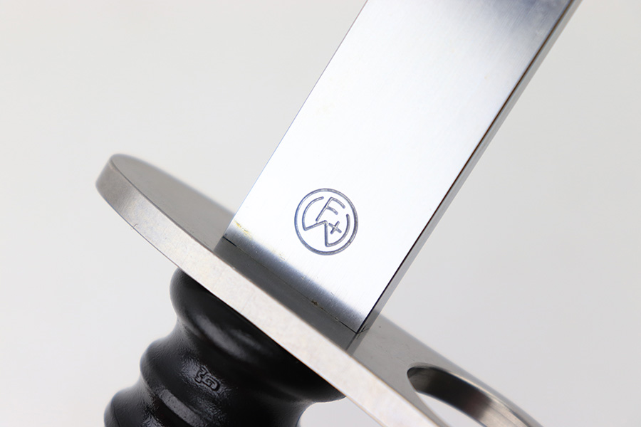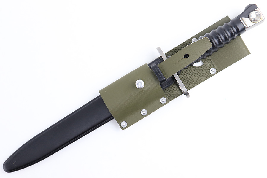 8/30/23 – This is a mint, unissued condition M57 Swiss rifle bayonet by Wenger. The bayonet comes with an original scabbard and olive green colored frog. The bayonet blade is very clean with a serial number stamped on one side of the blade base, and a Wenger maker stamp on the other side. There are no other markings. The frog is made from a rubberized / canvas cloth material. Very clean overall with some very mild scabbard rub wear. Note that the item received is not the exact bayonet shown in photos but one in similar condition and configuration.