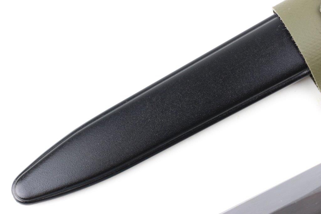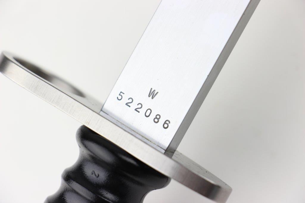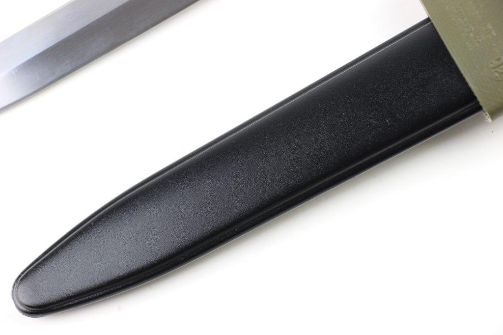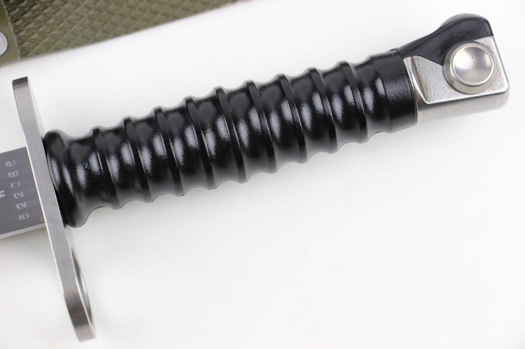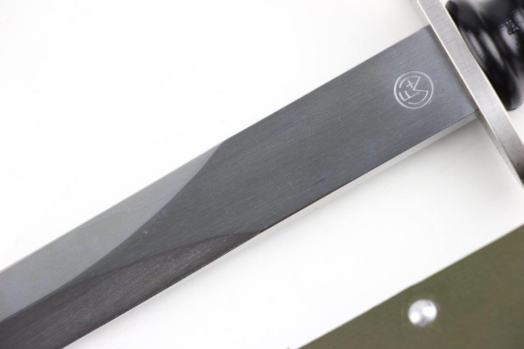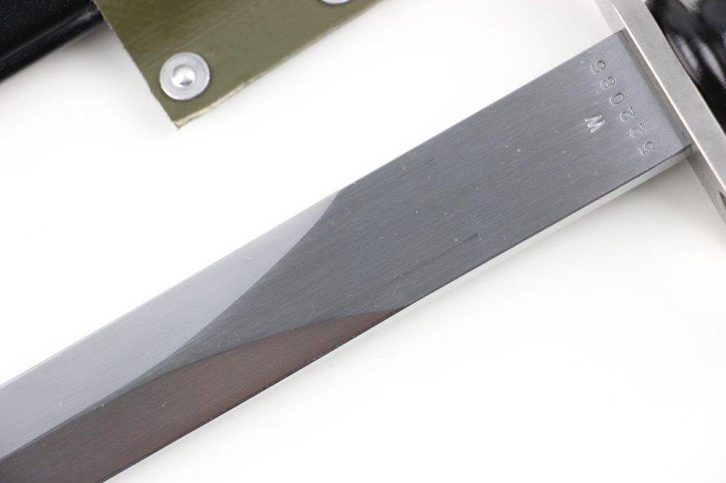 6/16/24 – This is a mint, unissued condition M57 Swiss rifle bayonet by Wenger. The bayonet comes with an original scabbard and olive green colored frog. The bayonet blade is very clean with a serial number stamped on one side of the blade base, and a Wenger maker stamp on the other side (FW+). There are no other markings. The frog is made from a rubberized / canvas cloth material. Very clean overall with some mild scabbard rub wear.
