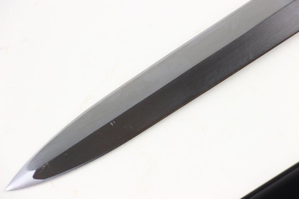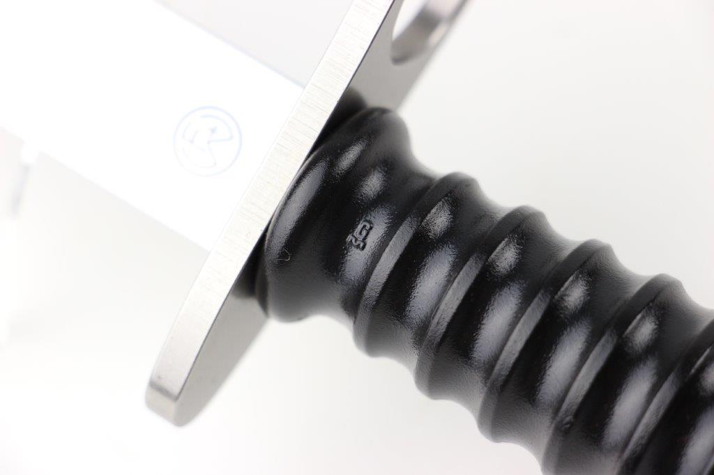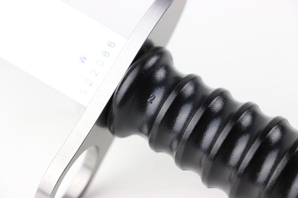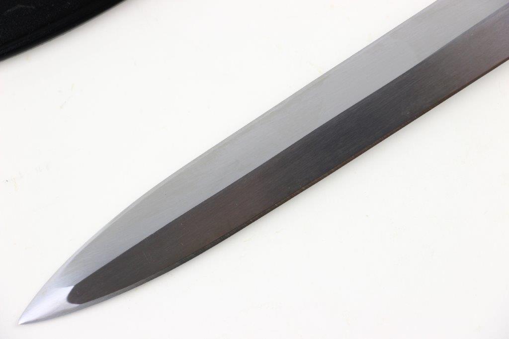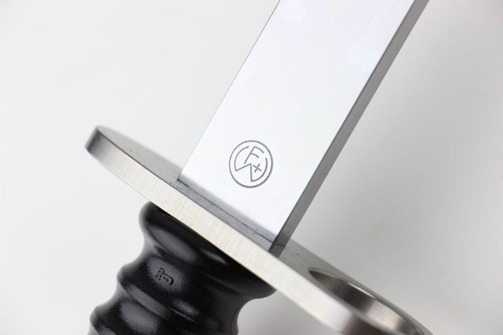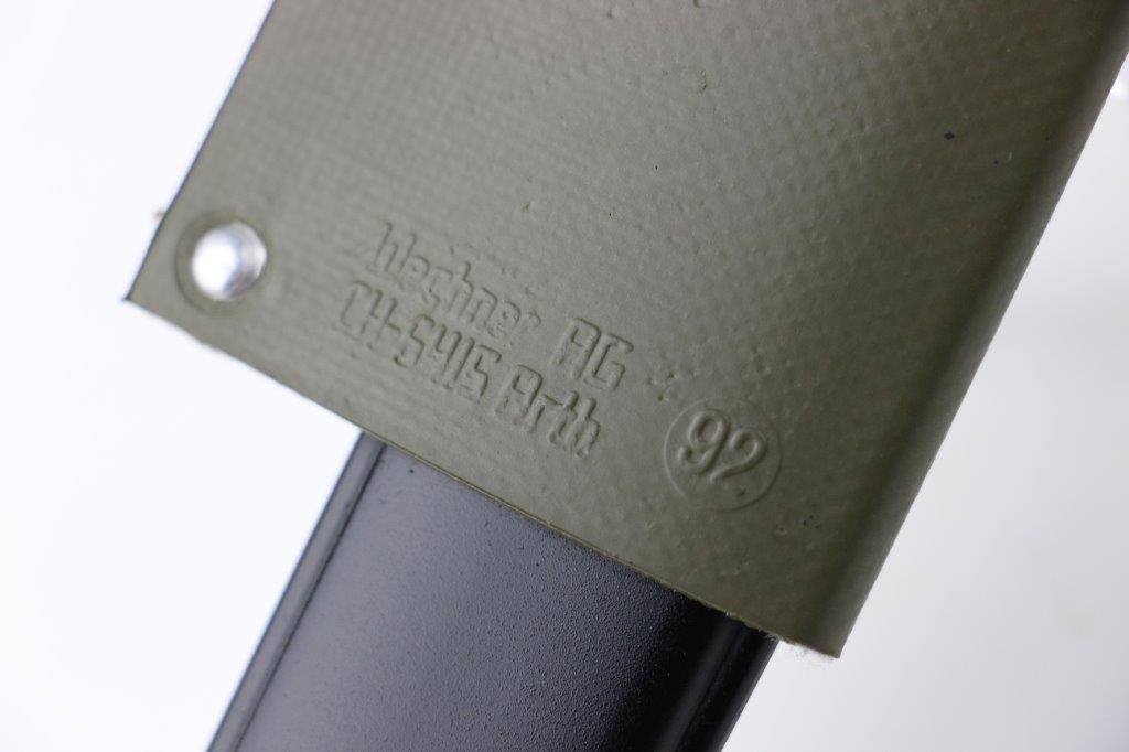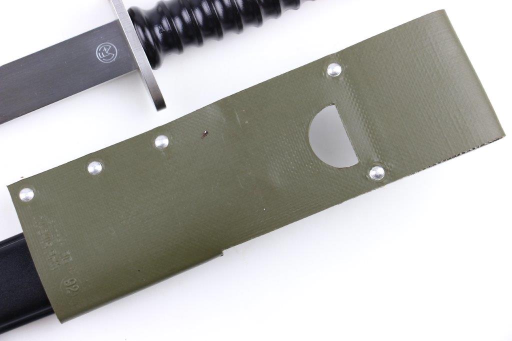 6/16/24 – This is a mint, unissued condition M57 Swiss rifle bayonet by Wenger. The bayonet comes with an original scabbard and olive green colored frog. The bayonet blade is very clean with a serial number stamped on one side of the blade base, and a Wenger maker stamp on the other side (FW+). There are no other markings. The frog is made from a rubberized / canvas cloth material. Very clean overall with some mild scabbard rub wear.