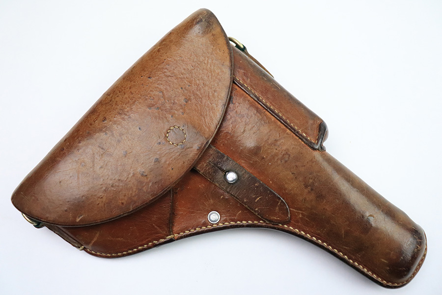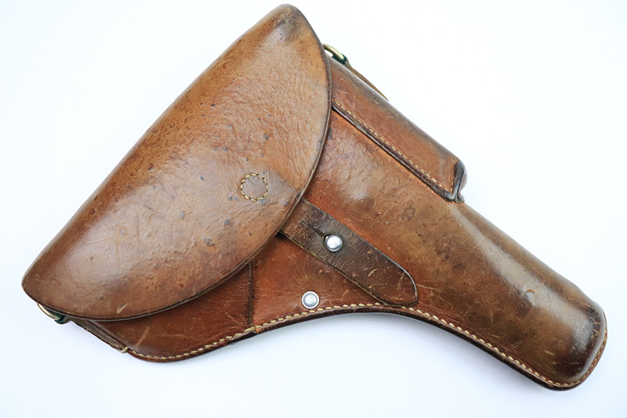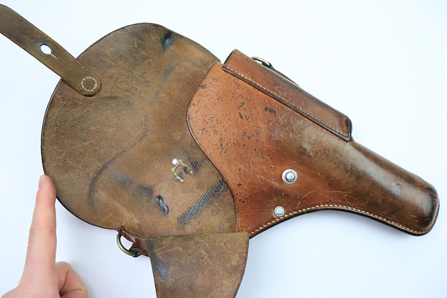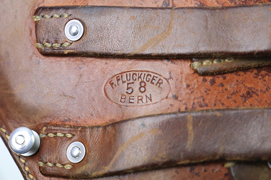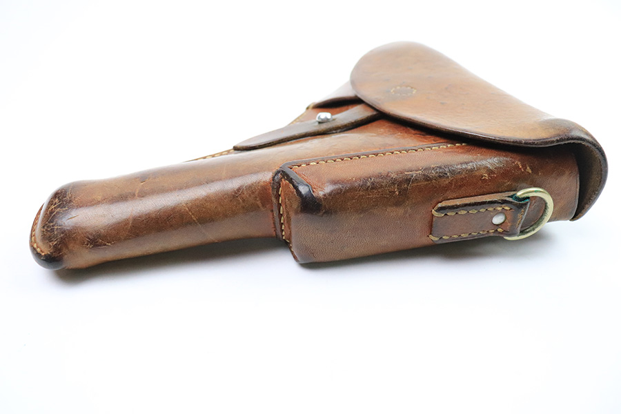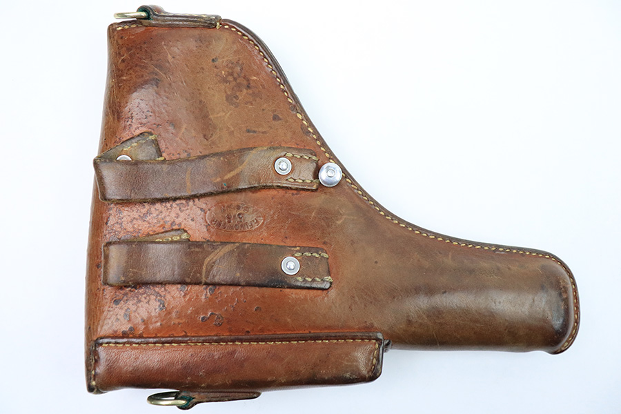 11/28/22 – This is a Swiss P49 leather holster. The holster is in great condition with all original leather and stitching intact. The exterior leather has some mild surface wear from use and aging. The back leather is maker stamped and dated 1958. The interior leather is fairly clean but shows signs of previous use. Light pliability and great overall condition.