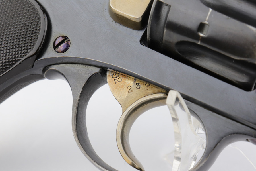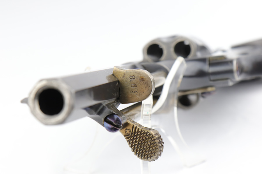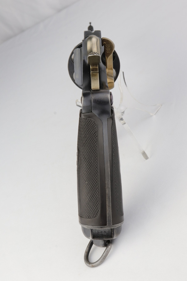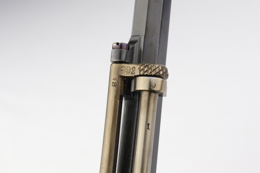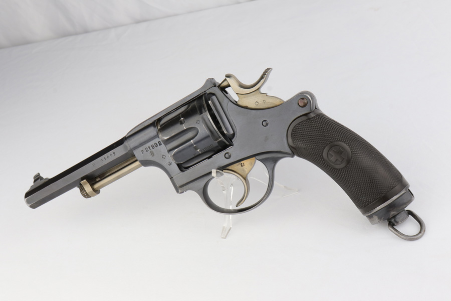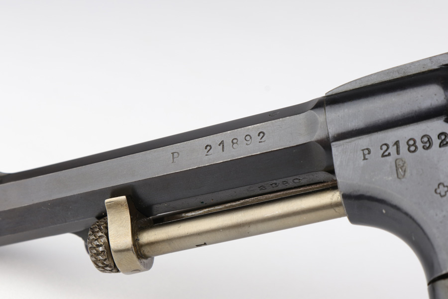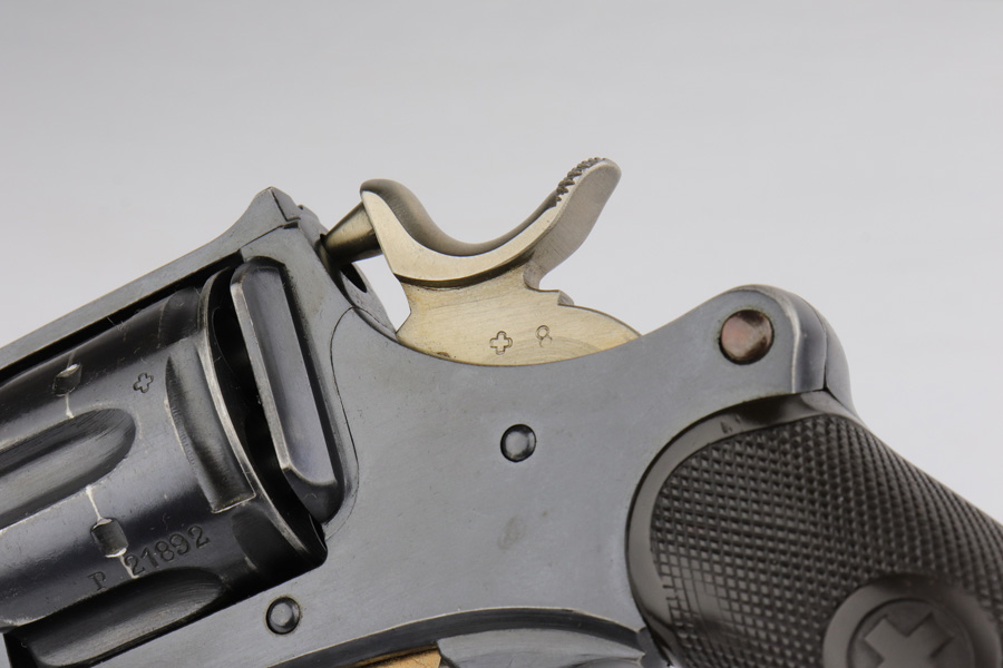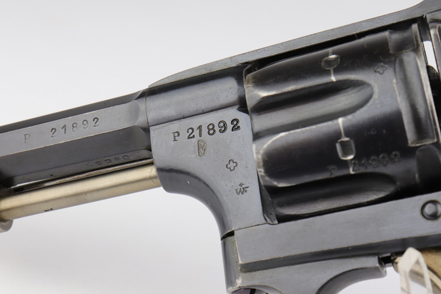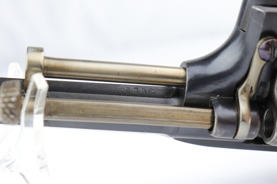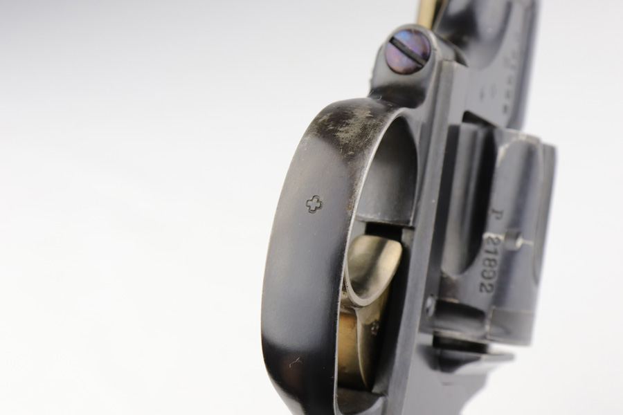 3/25/19 – This is a great example of an antique Swiss Schmidt-Rubin Model 1882 revolver with rare shoulder stock/holster combo. Very few of these beautiful guns were issued with detachable shoulder stock/holster combinations, with an ingenious attachment point on the bottom of the grip. The shoulder stock iron slides into the recess in the grip and locks in place, instantly turning the revolver into a carbine. This particular revolver is a very uncommonly seen private purchase variation, that was initially made for private purchases by the Swiss Army officers, as evidenced by the P prefix to the serial numbers on the frame and the barrel – not to be confused with the large “P” proof that was added to the frame of the guns that were released from the military to the retiring officers. The P prefix on this revolver is actually a part of the serial number and was applied by the factory during the manufacture. Such marked revolvers are extremely rare. The holster-stock combo was also a private purchase item, recommended as an accessory to the Swiss officers, and was not issued by the military, which accounts for its scarcity. The gun is all original with about 94-95% of its original blue remaining, with some finish loss on the cylinder, trigger guard and bottom of the frame. Small parts strawed and screws are fire blued. Grips are checkered horn/Bakelite with a Swiss cross on each side. Mint bore! No import marks! The holster stock combo is in nice shape as well with no defects, but with some wear to the leather as one would expect from a 135 year old accessory. The Swiss military cartouche is still visible on the flap. The shoulder straps are intact. This is a scarce antique set that makes for an impressive display with a shoulder stock attached!