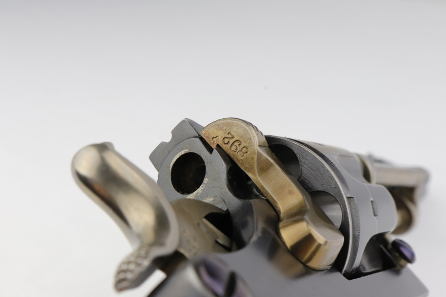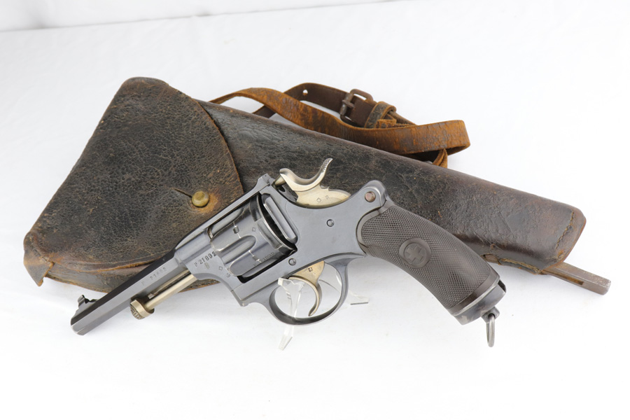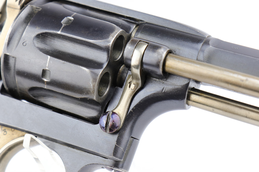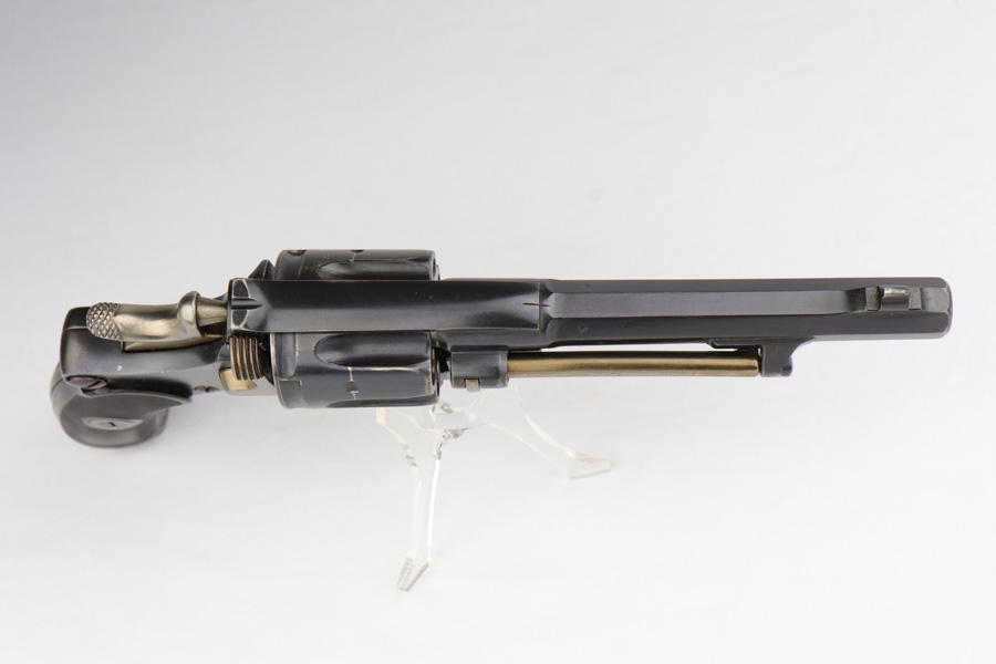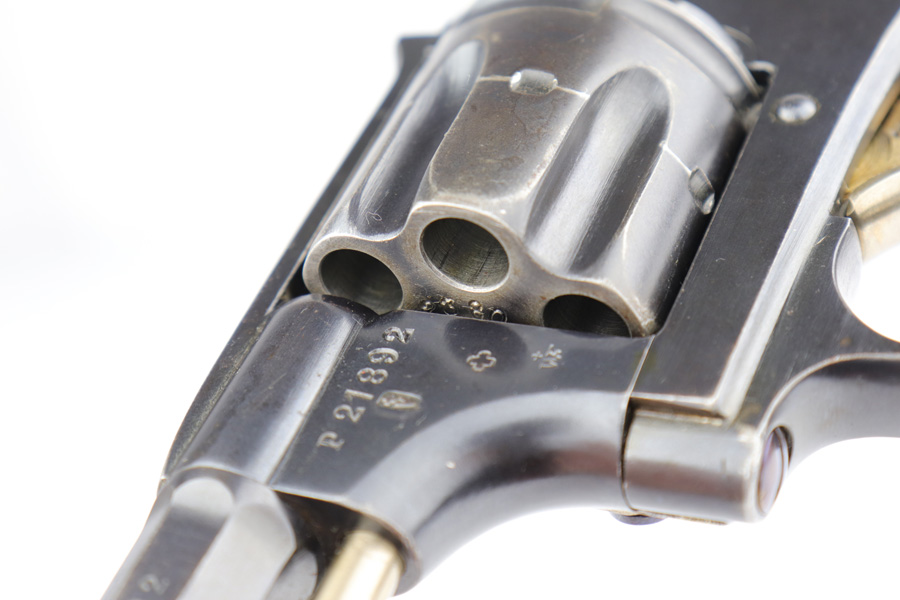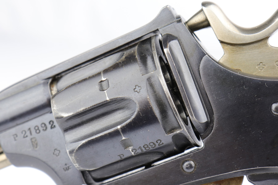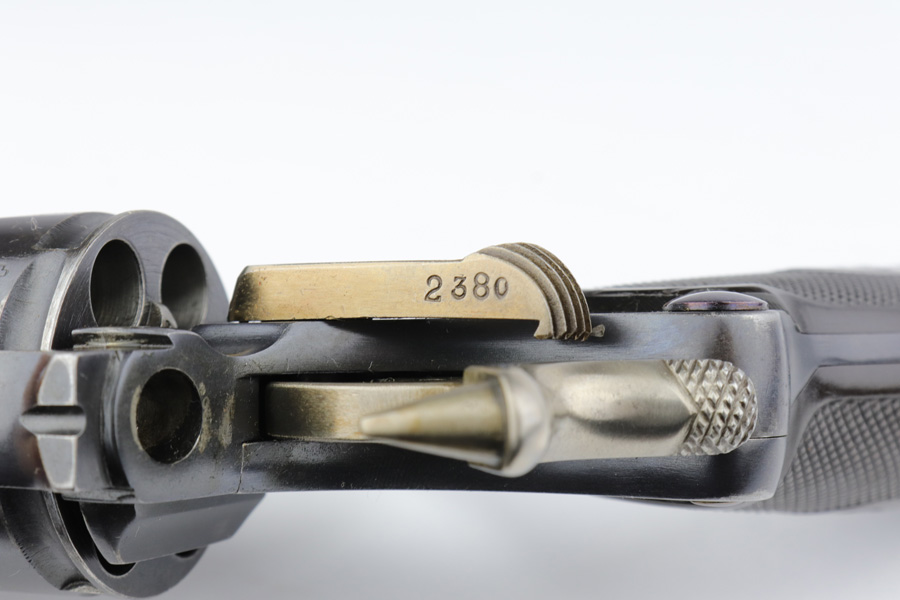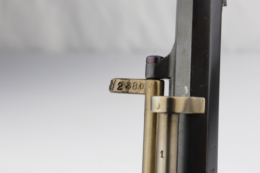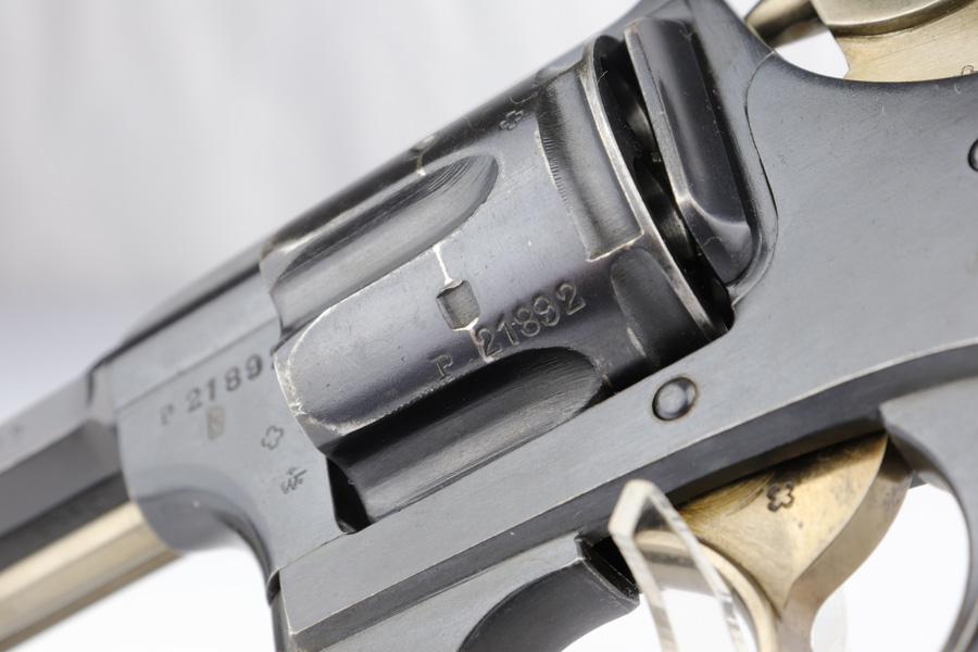 3/25/19 – This is a great example of an antique Swiss Schmidt-Rubin Model 1882 revolver with rare shoulder stock/holster combo. Very few of these beautiful guns were issued with detachable shoulder stock/holster combinations, with an ingenious attachment point on the bottom of the grip. The shoulder stock iron slides into the recess in the grip and locks in place, instantly turning the revolver into a carbine. This particular revolver is a very uncommonly seen private purchase variation, that was initially made for private purchases by the Swiss Army officers, as evidenced by the P prefix to the serial numbers on the frame and the barrel – not to be confused with the large “P” proof that was added to the frame of the guns that were released from the military to the retiring officers. The P prefix on this revolver is actually a part of the serial number and was applied by the factory during the manufacture. Such marked revolvers are extremely rare. The holster-stock combo was also a private purchase item, recommended as an accessory to the Swiss officers, and was not issued by the military, which accounts for its scarcity. The gun is all original with about 94-95% of its original blue remaining, with some finish loss on the cylinder, trigger guard and bottom of the frame. Small parts strawed and screws are fire blued. Grips are checkered horn/Bakelite with a Swiss cross on each side. Mint bore! No import marks! The holster stock combo is in nice shape as well with no defects, but with some wear to the leather as one would expect from a 135 year old accessory. The Swiss military cartouche is still visible on the flap. The shoulder straps are intact. This is a scarce antique set that makes for an impressive display with a shoulder stock attached!