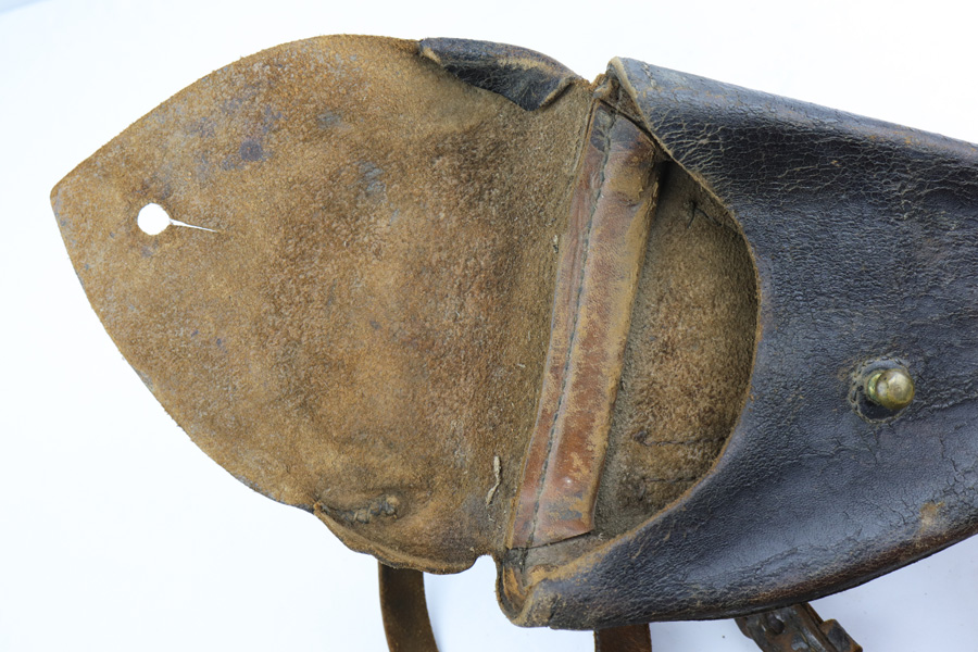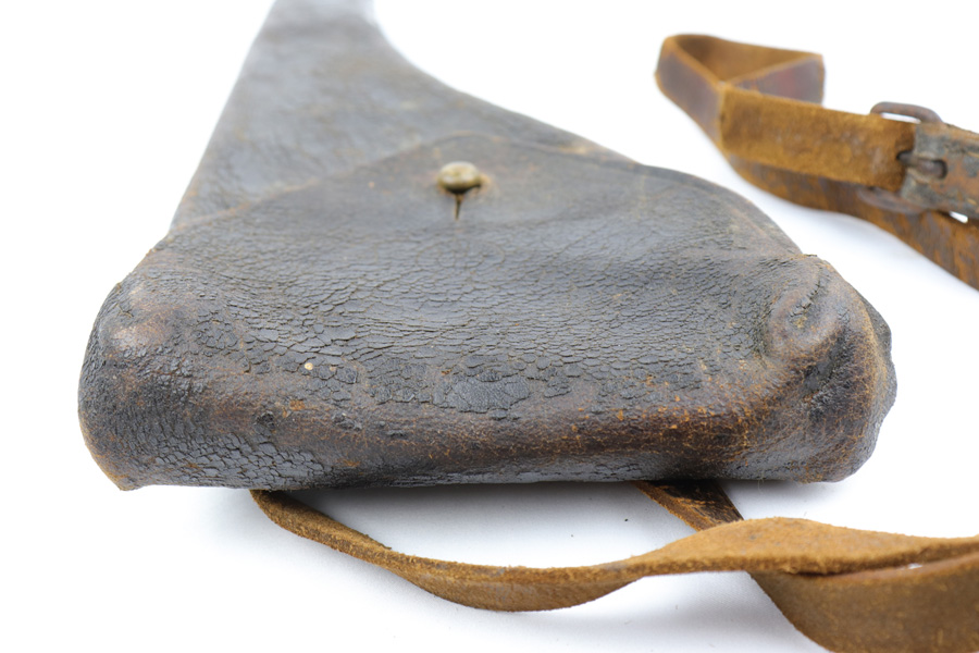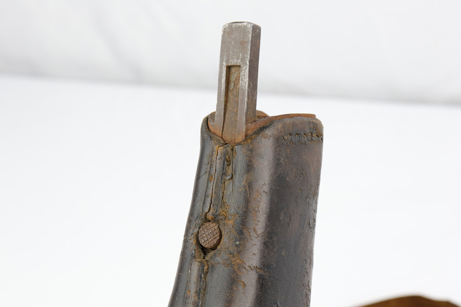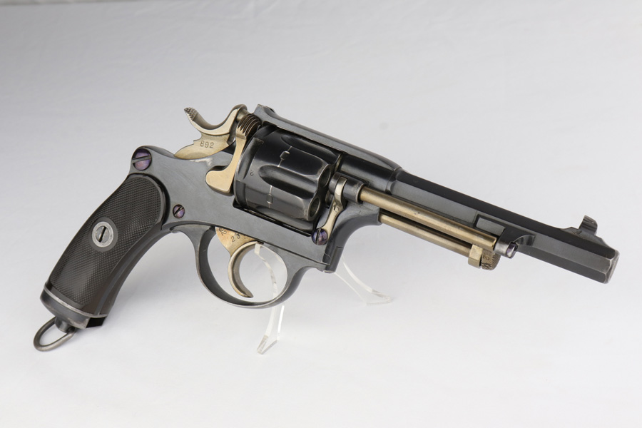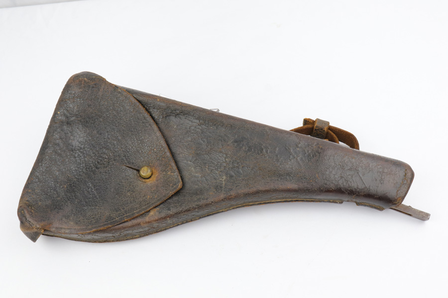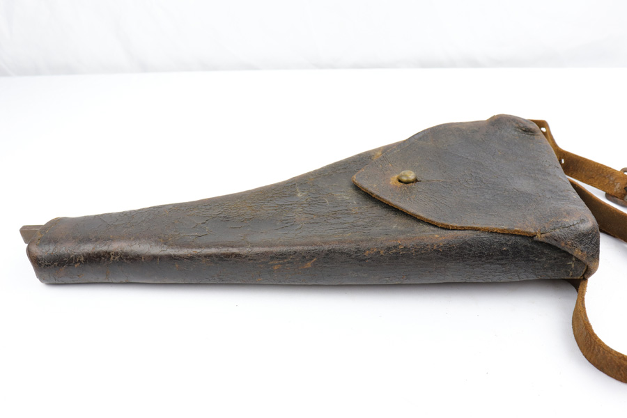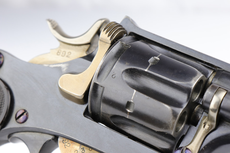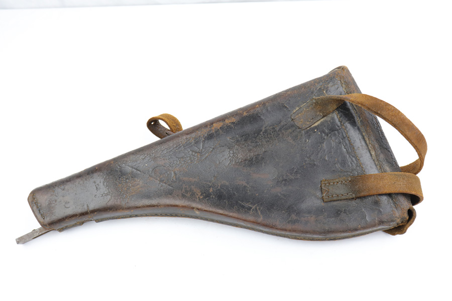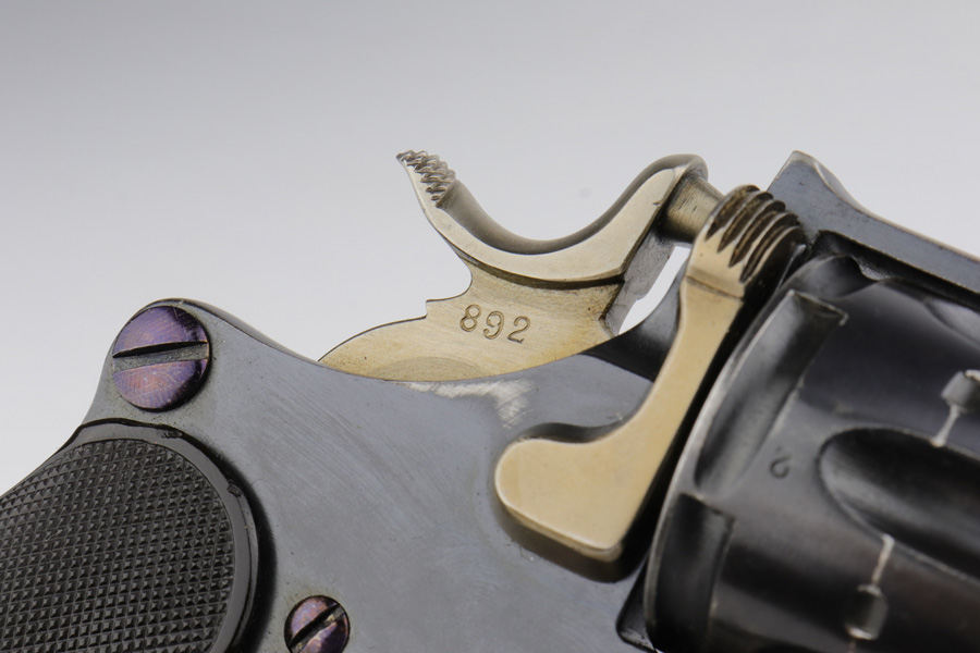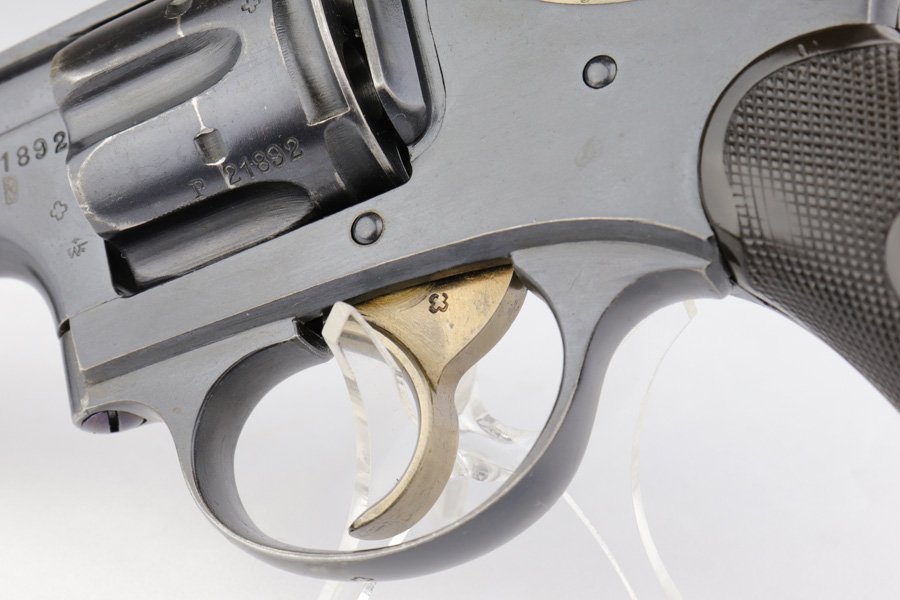 3/25/19 – This is a great example of an antique Swiss Schmidt-Rubin Model 1882 revolver with rare shoulder stock/holster combo. Very few of these beautiful guns were issued with detachable shoulder stock/holster combinations, with an ingenious attachment point on the bottom of the grip. The shoulder stock iron slides into the recess in the grip and locks in place, instantly turning the revolver into a carbine. This particular revolver is a very uncommonly seen private purchase variation, that was initially made for private purchases by the Swiss Army officers, as evidenced by the P prefix to the serial numbers on the frame and the barrel – not to be confused with the large “P” proof that was added to the frame of the guns that were released from the military to the retiring officers. The P prefix on this revolver is actually a part of the serial number and was applied by the factory during the manufacture. Such marked revolvers are extremely rare. The holster-stock combo was also a private purchase item, recommended as an accessory to the Swiss officers, and was not issued by the military, which accounts for its scarcity. The gun is all original with about 94-95% of its original blue remaining, with some finish loss on the cylinder, trigger guard and bottom of the frame. Small parts strawed and screws are fire blued. Grips are checkered horn/Bakelite with a Swiss cross on each side. Mint bore! No import marks! The holster stock combo is in nice shape as well with no defects, but with some wear to the leather as one would expect from a 135 year old accessory. The Swiss military cartouche is still visible on the flap. The shoulder straps are intact. This is a scarce antique set that makes for an impressive display with a shoulder stock attached!