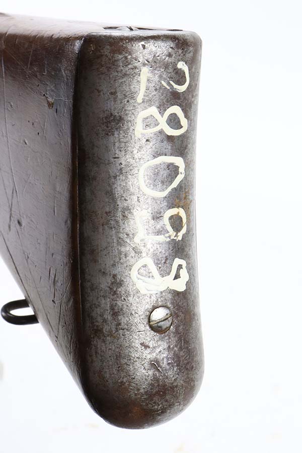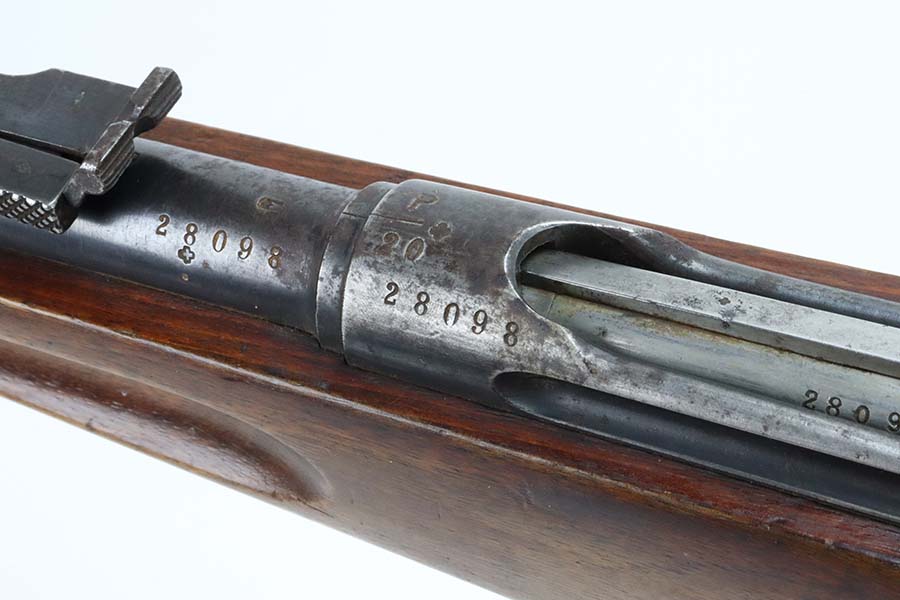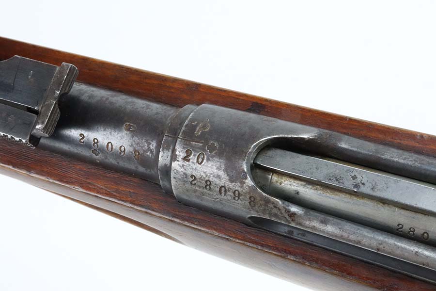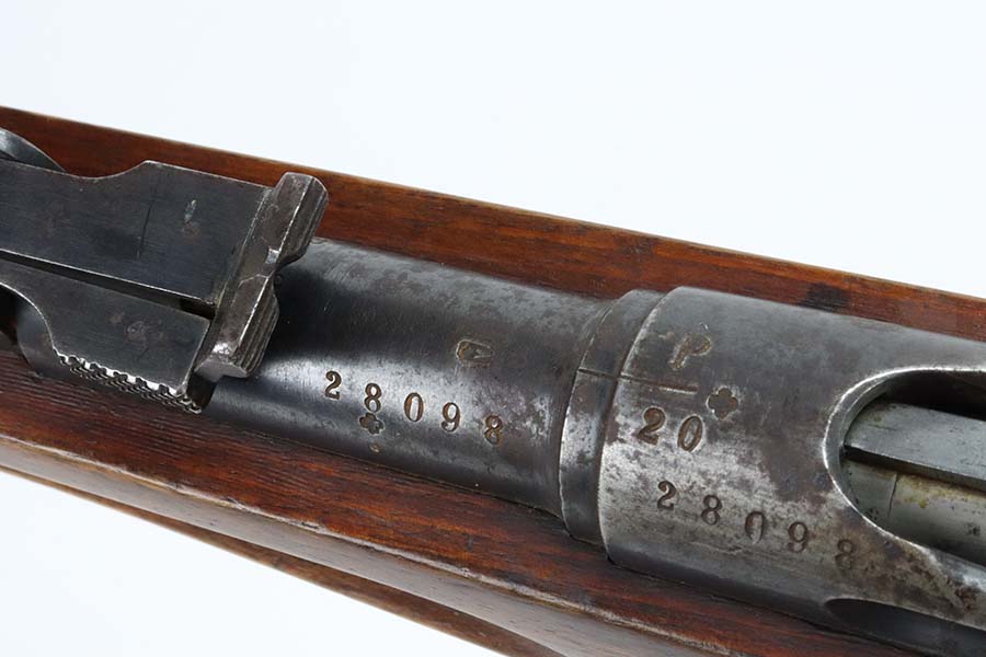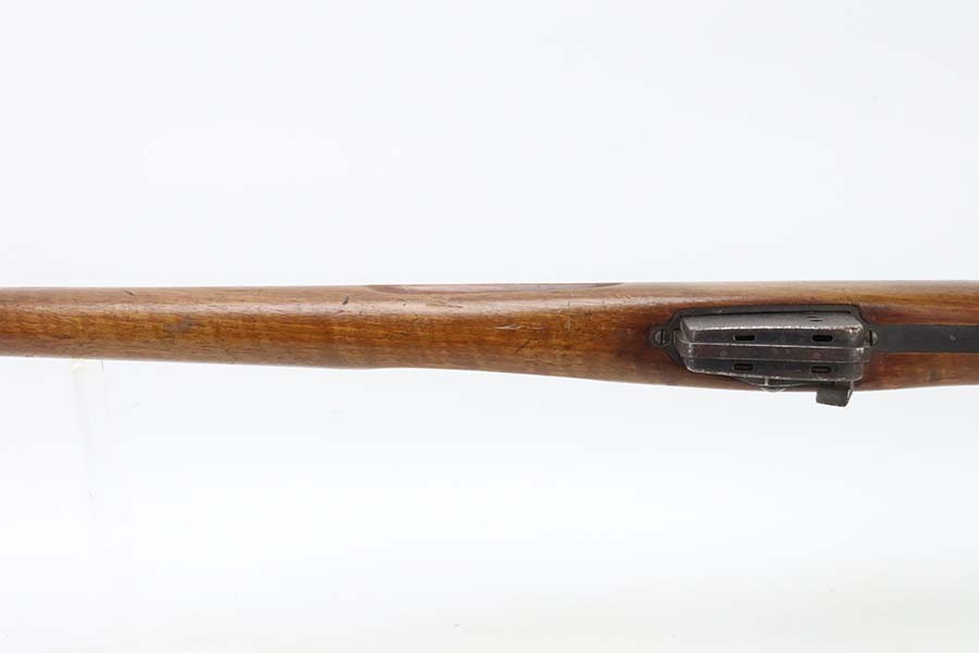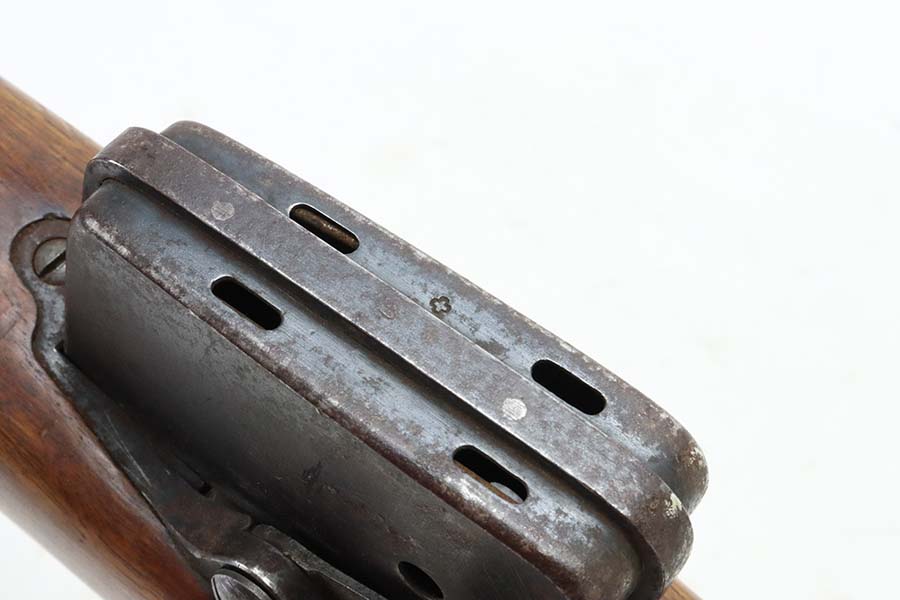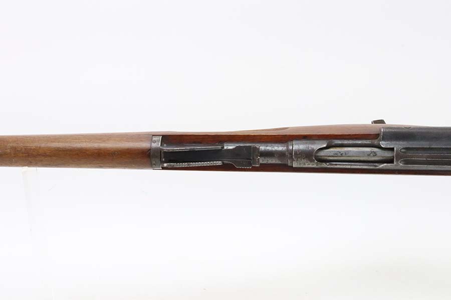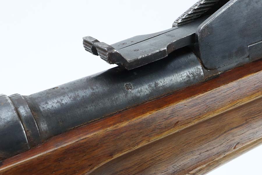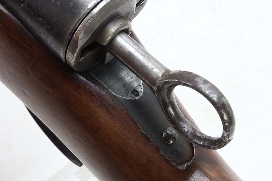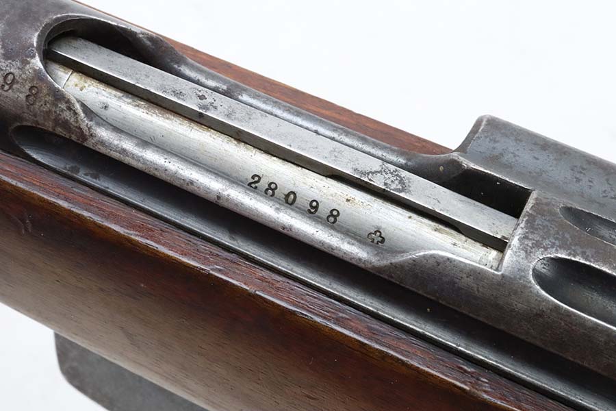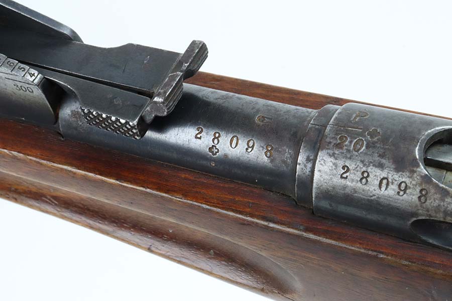 07/18/2024 – For sale is a Swiss Model 1889 Schmidt Rubin rifle made in 1892. These rifles were one of the first in the world to chamber a small bore rifle cartridge prior to the widespread use of smokeless powder. In 1882, the Swiss would create a cartridge that was a .308 caliber bullet paperpatched in the case to try and reduce lead fowling. The rifle itself is in good condition but there is significant oxidation throughout the metal and a lot of the wear on areas, like the barrel, has its bluing worn away. The stock is in good condition but there are many dents and scratches from use. The rifle has matching serial numbers on the bolt, magazine, receiver, and barrel. The plastic on the bolt handle is mostly in tact but has 3 numbers that do not match the serial number. The top plastic is also cracked and there is some old rust on the handle. The bore is very bright with great rifling. The safety loop/ring is cracked in the back.