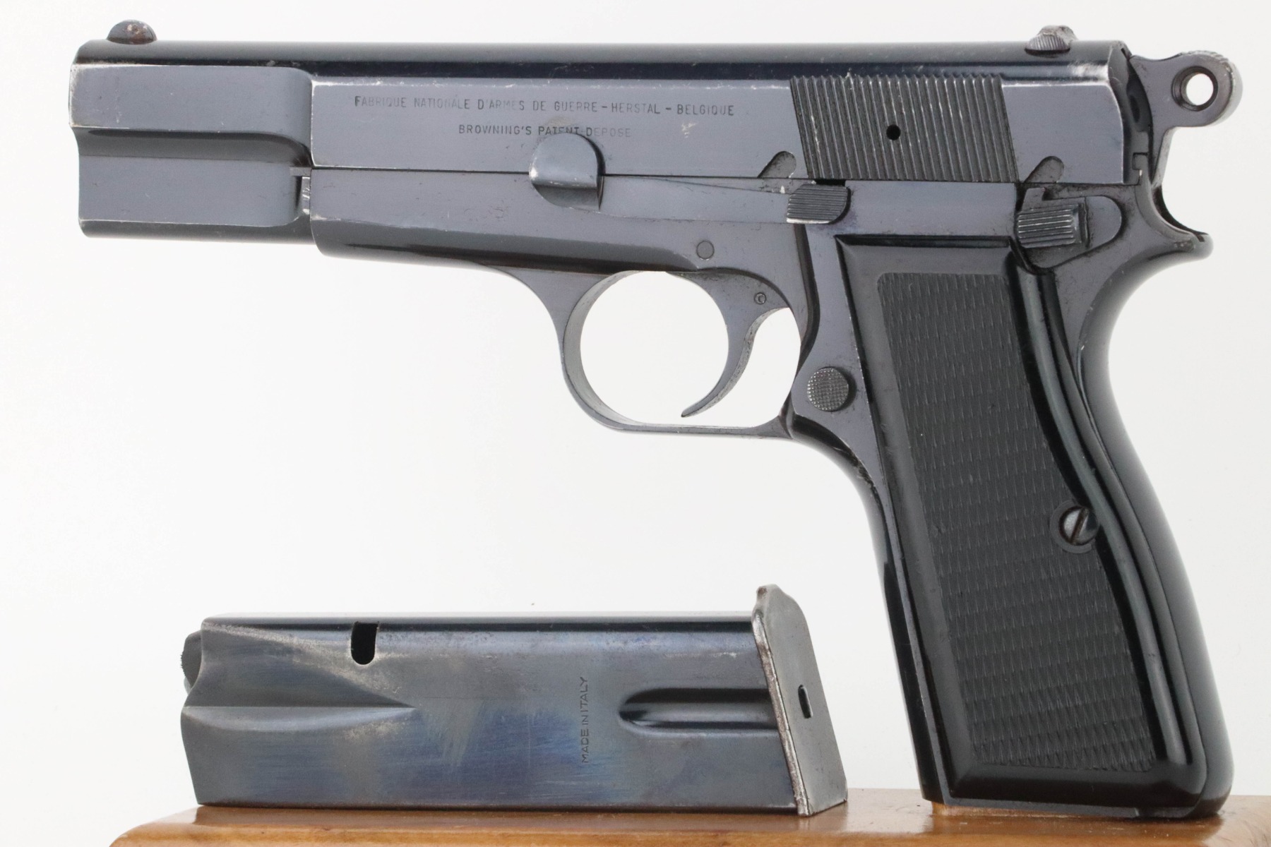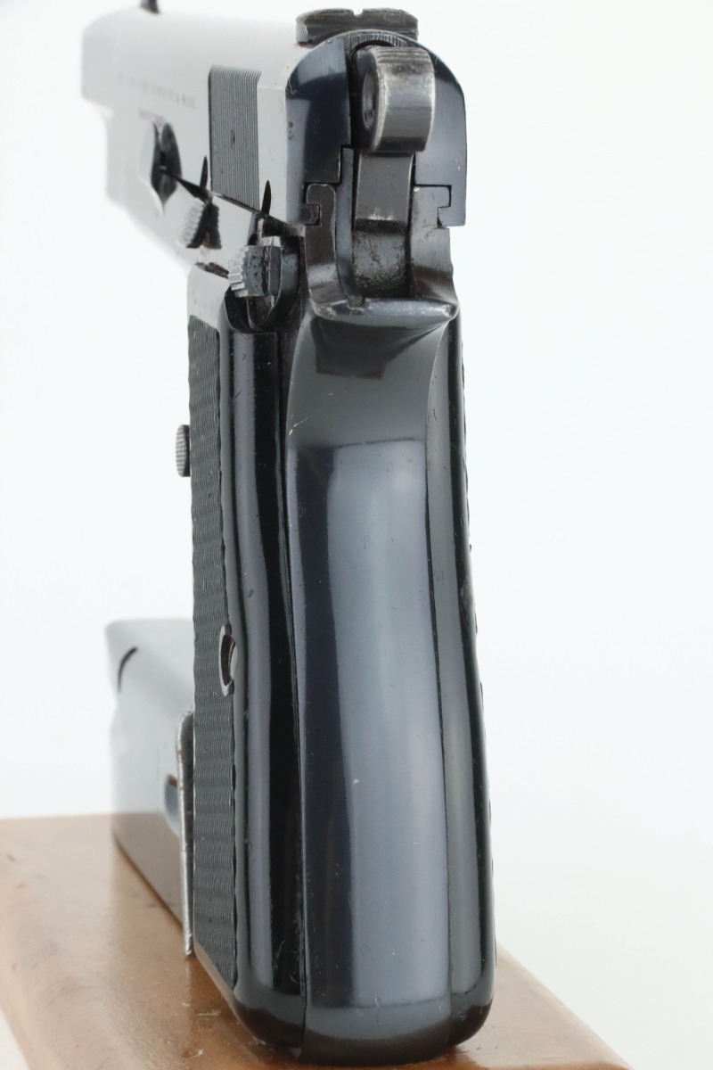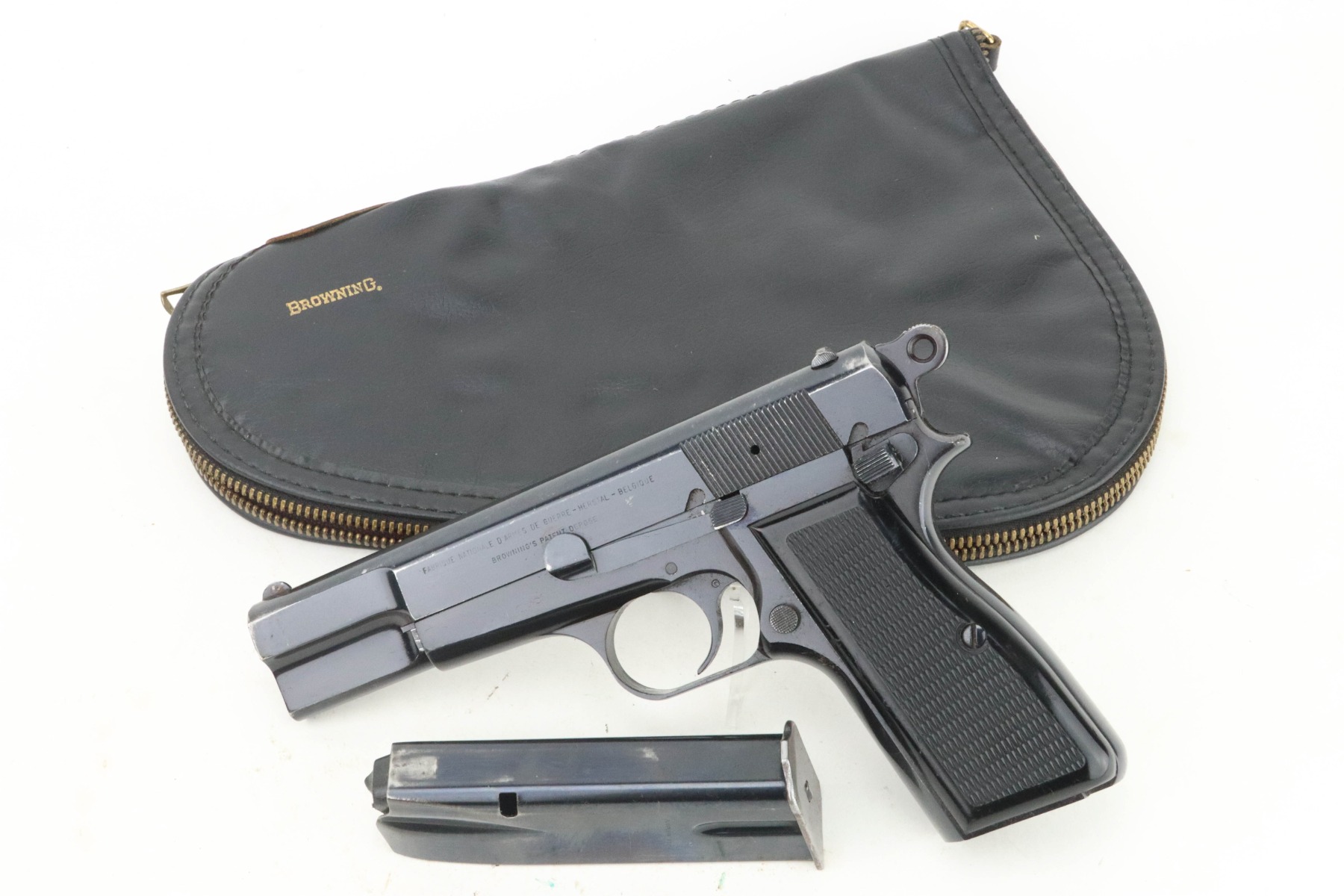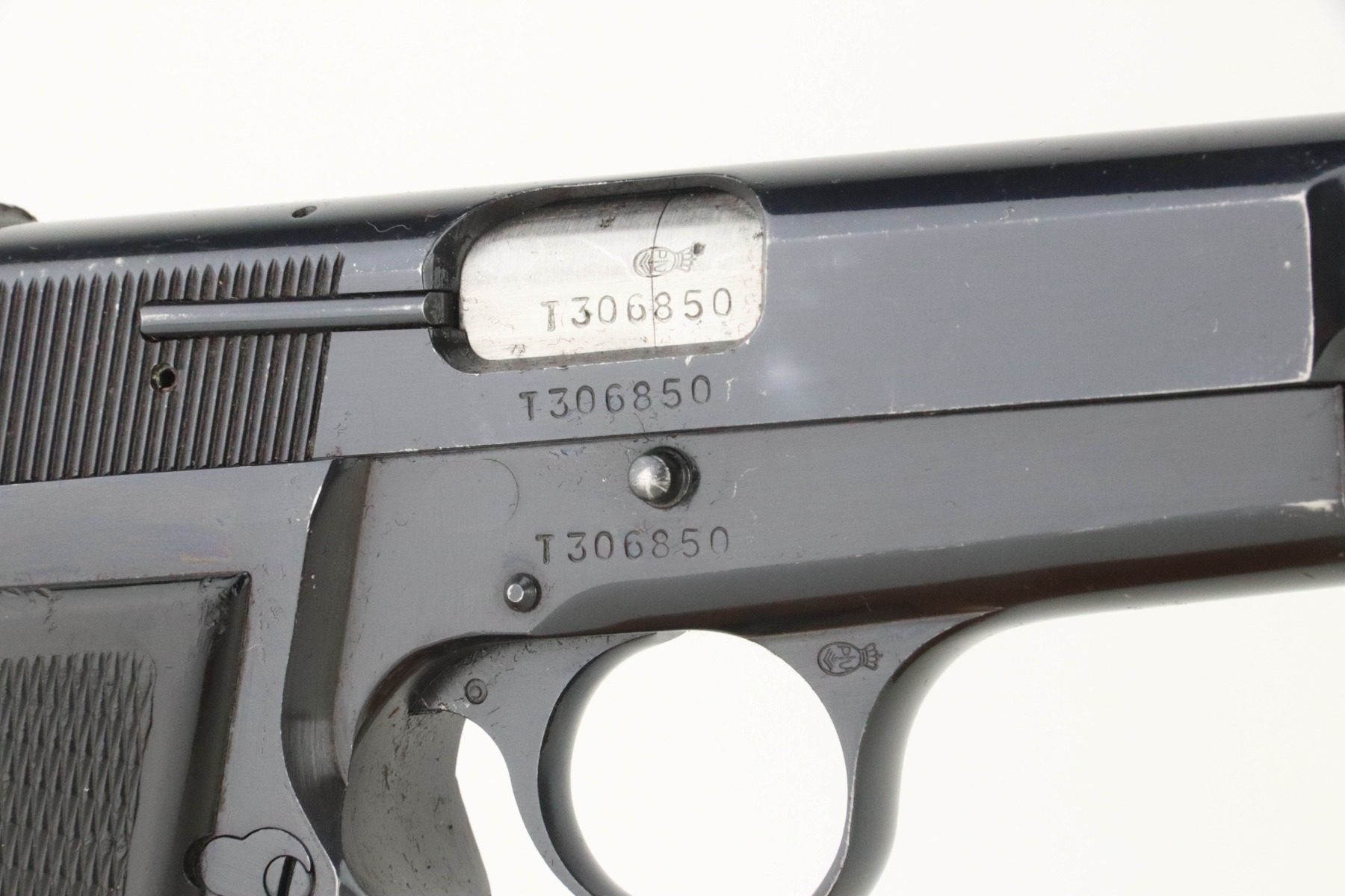 10/16/24 – This is a Browning Hi Power with a T-Series serial manufactured in about 1970. The “T Series” guns are regarded by collectors as being the last run of FN’s high polish guns with a quality factory fit and finish. All matching with an import mark on the butt of the frame. The finish on this one rates about 93-94%. There is general high edge wear, some light spotty wear on the top of the slide, and tiny surface scratches and marks throughout. Comes with one proper magazine and a Browning black leather soft case. The bore has great rifling, but there is some minor frosting in the grooves.