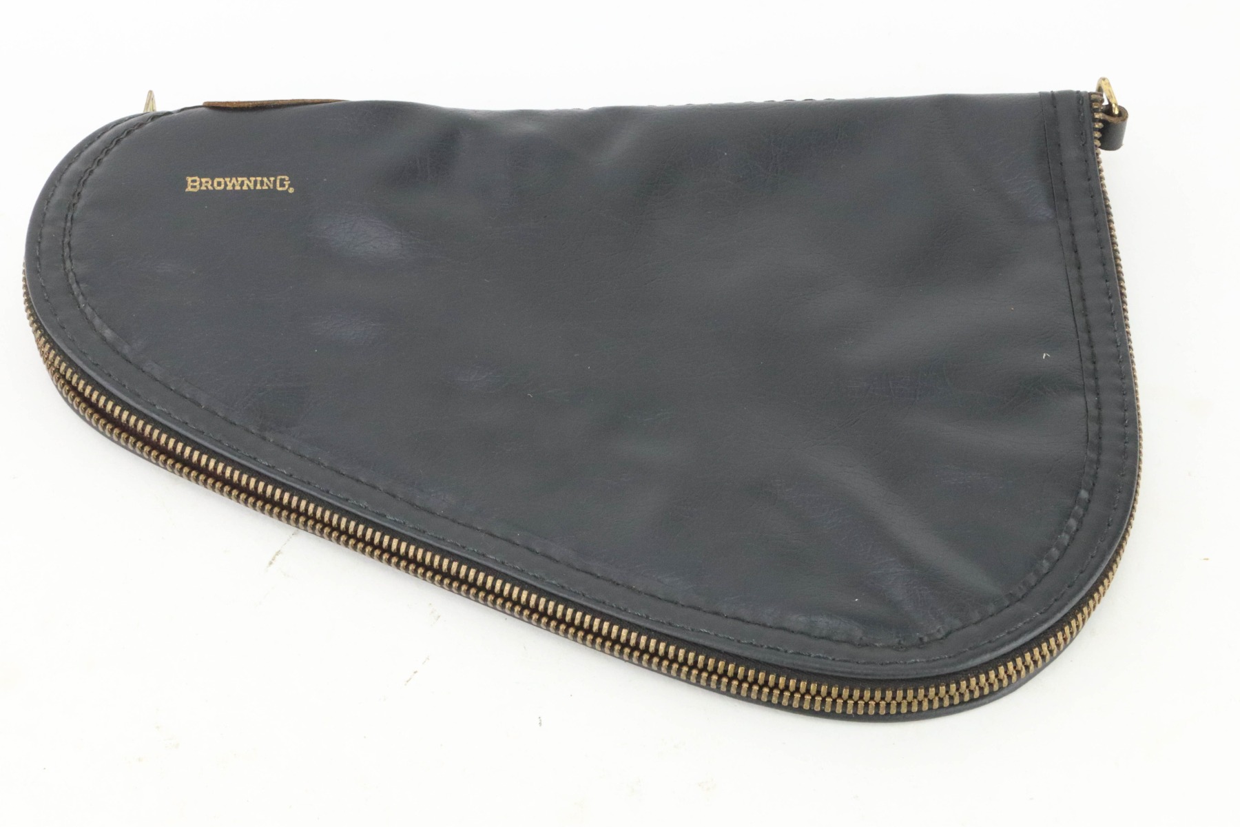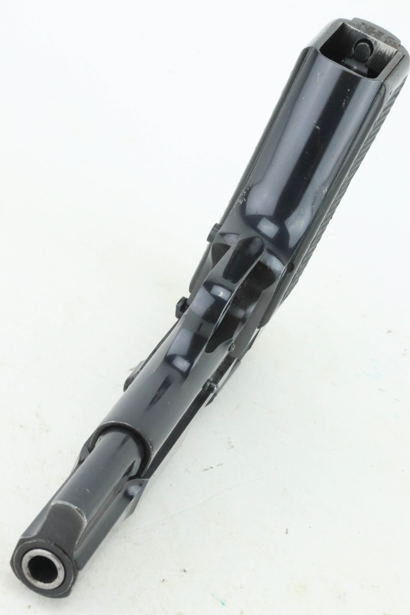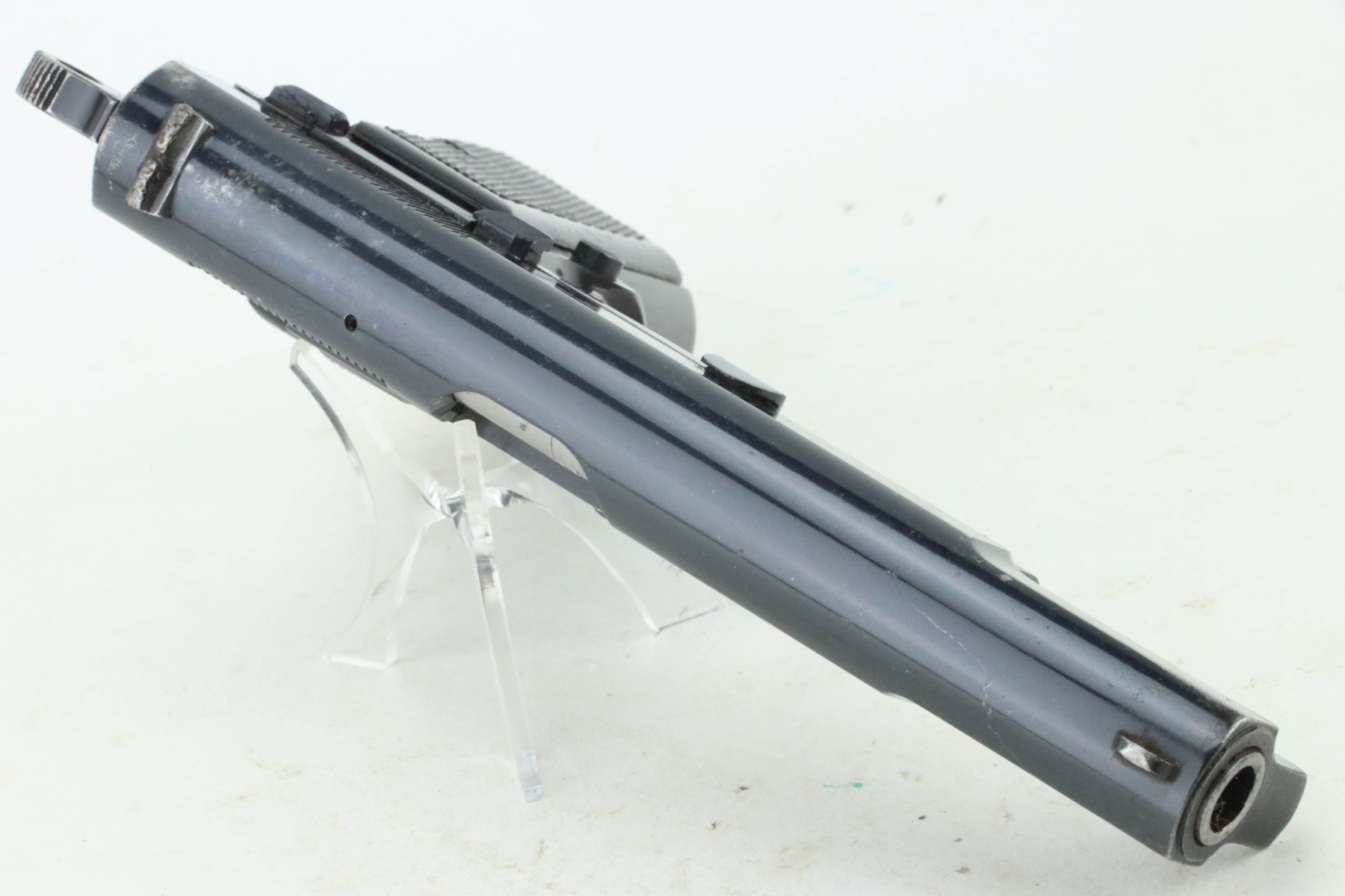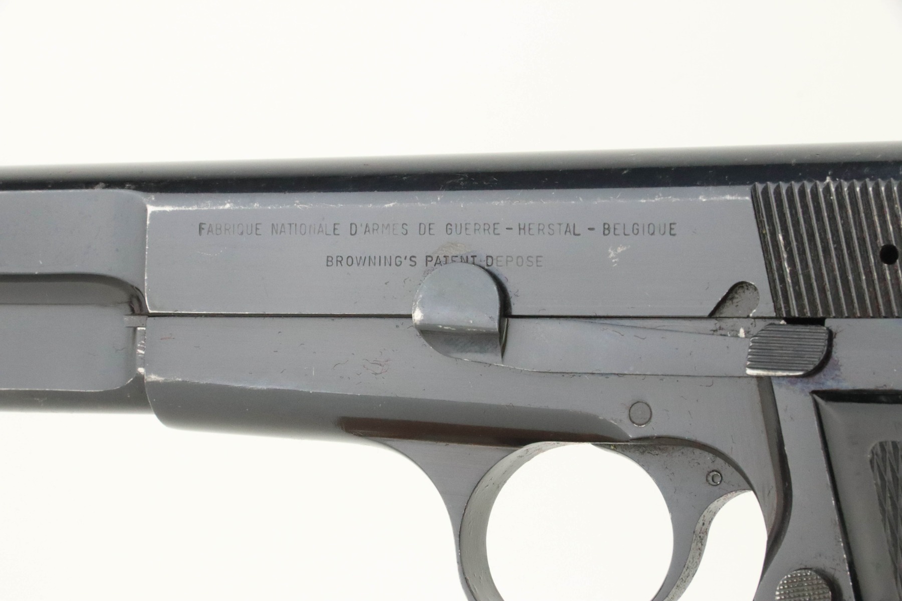 10/16/24 – This is a Browning Hi Power with a T-Series serial manufactured in about 1970. The “T Series” guns are regarded by collectors as being the last run of FN’s high polish guns with a quality factory fit and finish. All matching with an import mark on the butt of the frame. The finish on this one rates about 93-94%. There is general high edge wear, some light spotty wear on the top of the slide, and tiny surface scratches and marks throughout. Comes with one proper magazine and a Browning black leather soft case. The bore has great rifling, but there is some minor frosting in the grooves.