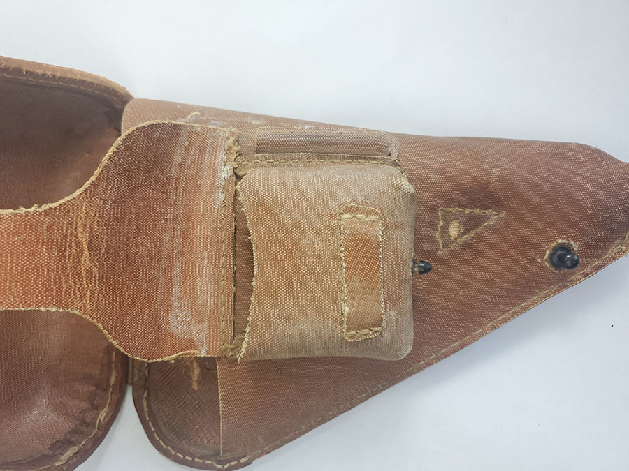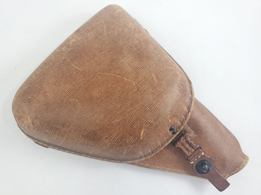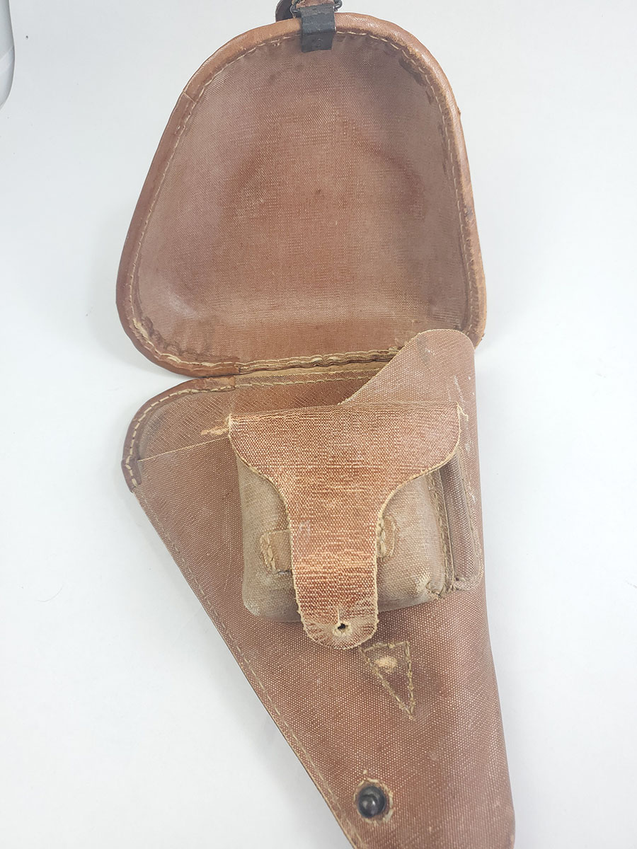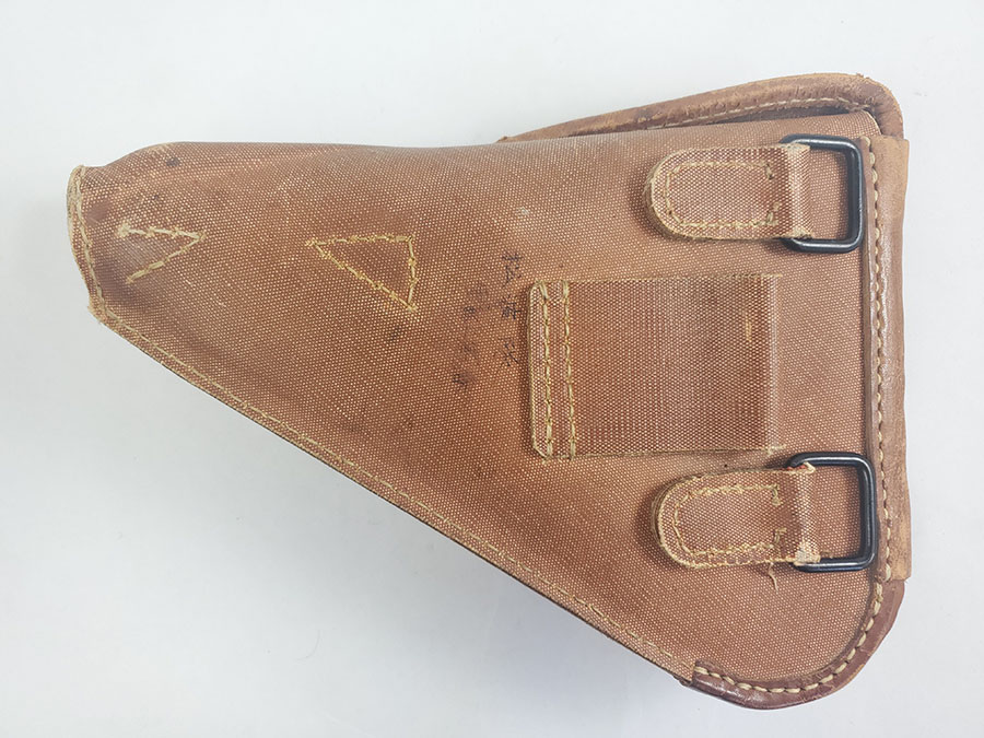 5/21/20 – This is an original Type 14 Nambu holster. The holster is a later wartime production with rubberized canvas material along with some leather parts. The stitching is all original and in tact. The holster has some exterior scuffs, but very nice shape and great condition overall. There’s some Japanese markings on the back of the holster. A very clean collector piece.