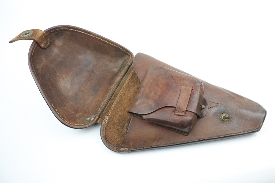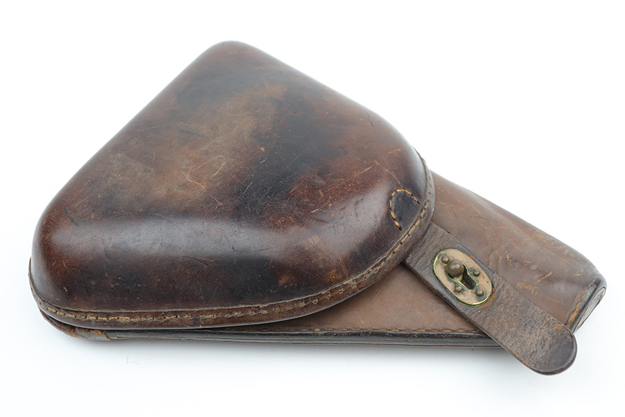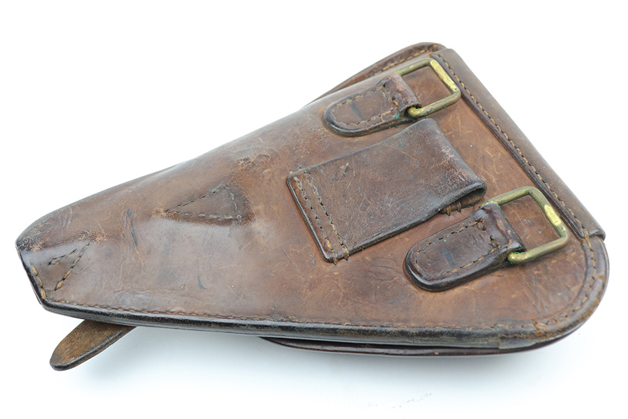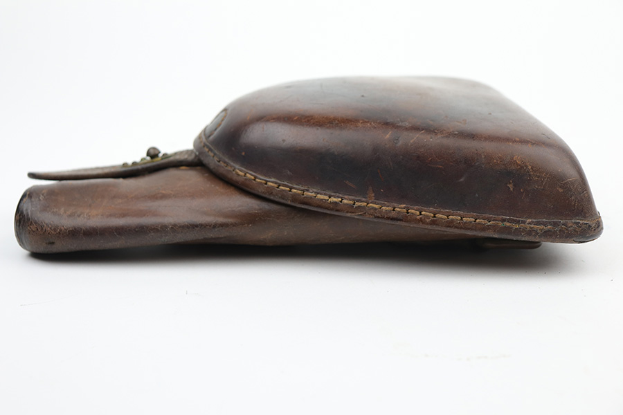 10/20/21 – This is an original Type 14 Nambu holster from WW2. Earlier leather construction with brass fittings. The leather has some mild surface wear and scuffing but no serious damage. All original stitching is in tact. No notable markings or stamps.