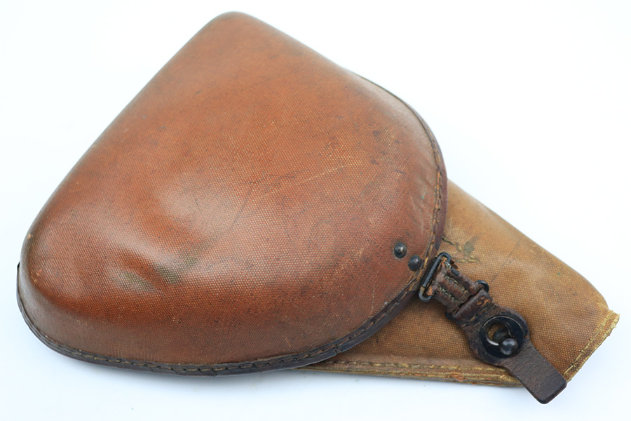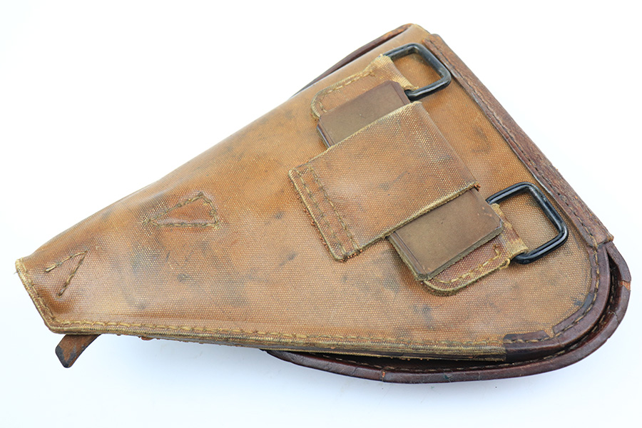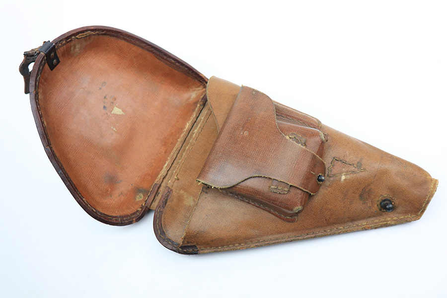 12/1/21 – This is an original WW2 wartime production Type 14 Nambu holster. Made from rubberized canvas and leather material. The holster has nice shape with some normal signs of use and aging. No excessive damage or stitching issues. The stitching appears all original. The interior lid is stamped with Japanese characters.