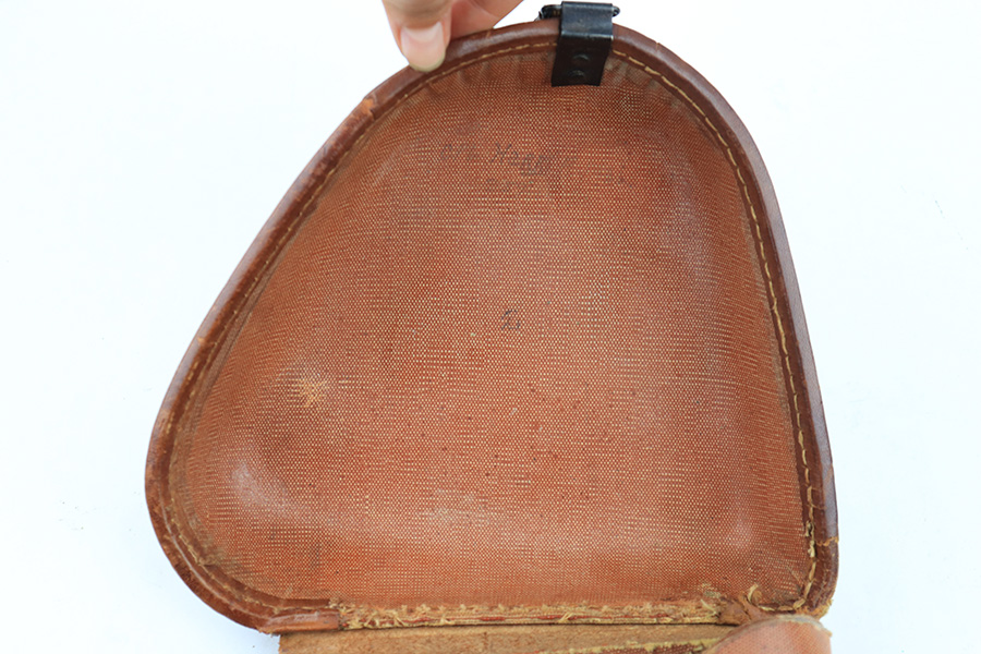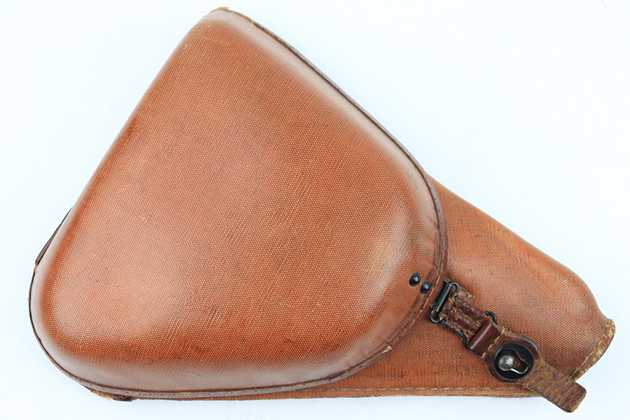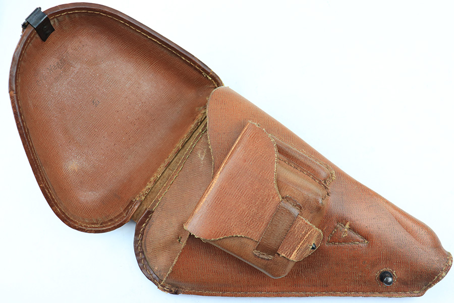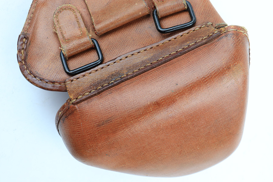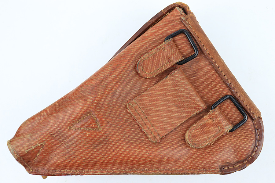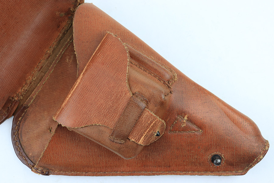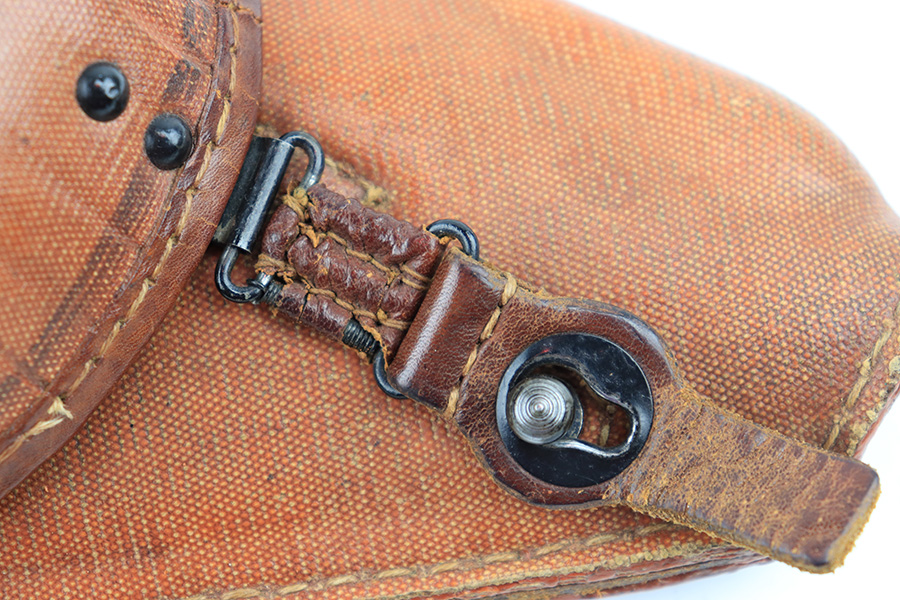 7/26/23 – This is an original WW2 wartime production Type 14 Nambu holster. This “clamshell” style holster is made from rubberized canvas material, which is indicative of later wartime production as the Japanese were running low on leather. This example is in excellent overall condition with minimal surface staining and light aging wear throughout. The rubberized canvas material is hard and firm throughout. No stitching issues.