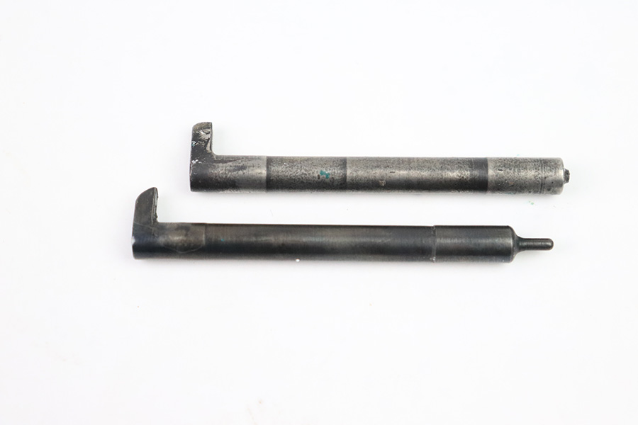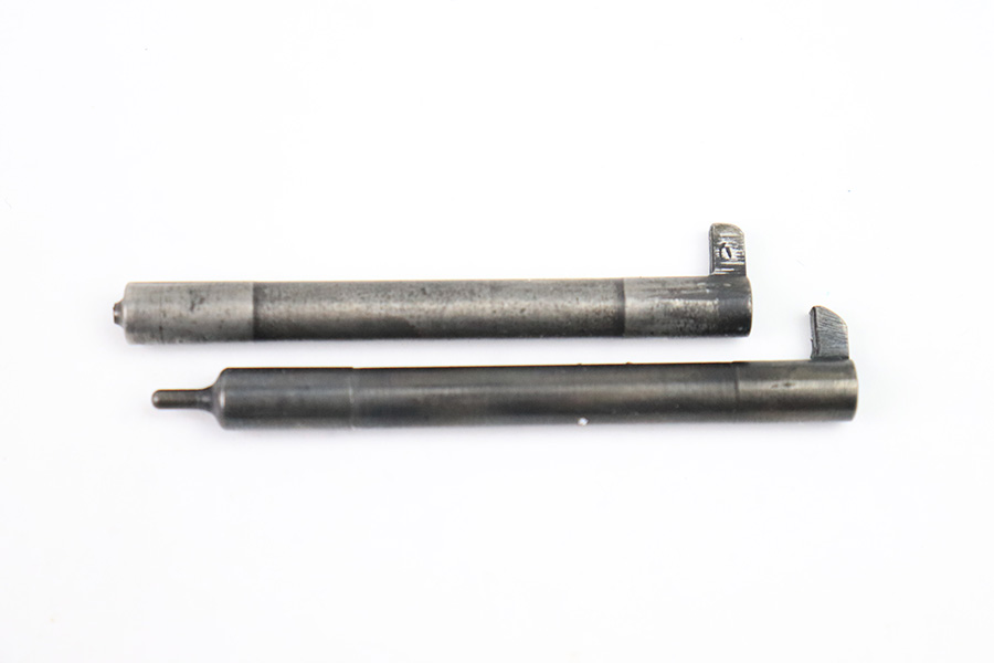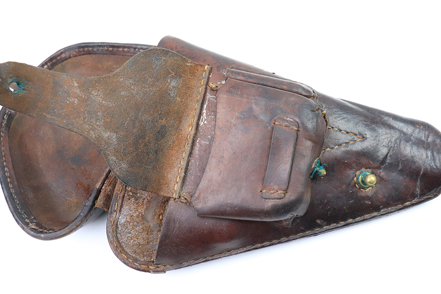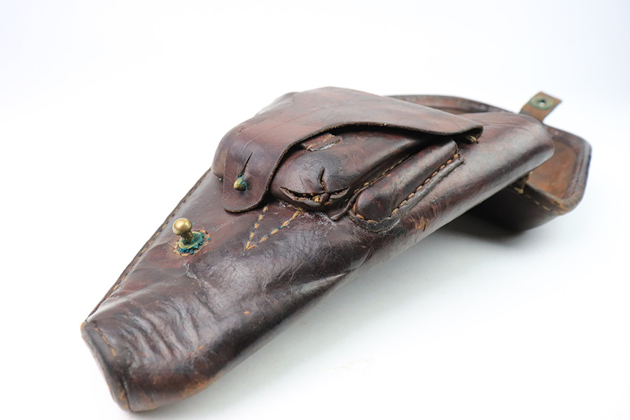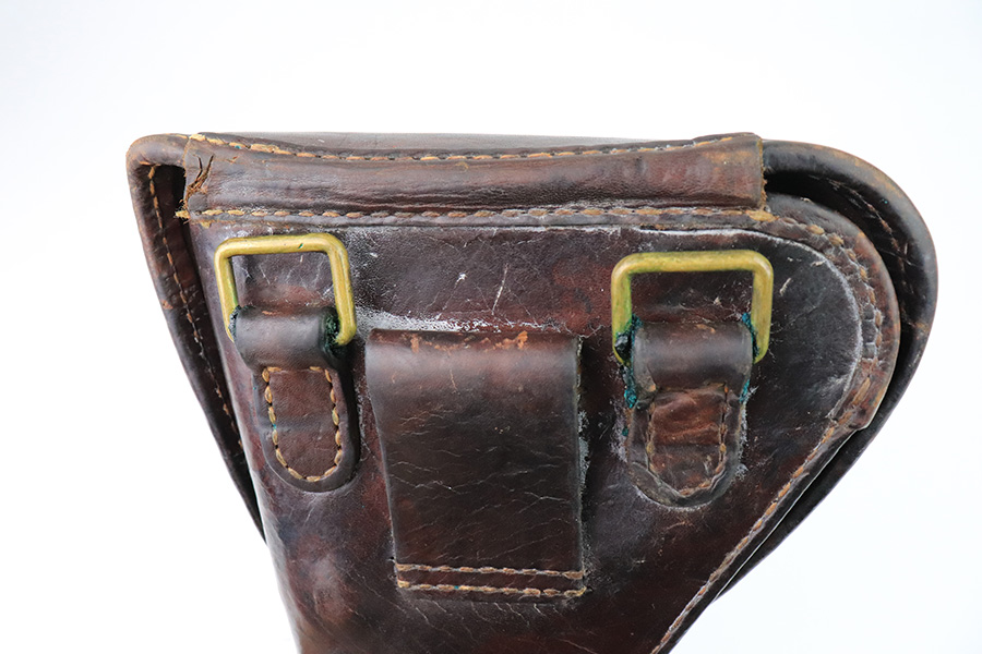 12/21/22 – This is an original WW2 production Type 14 Nambu leather holster. The holster comes with two original WW2 production firing pins, but one has a broken tip (as shown). The holster has some honest wear throughout the leather leaving it an aged look with some typical surface wrinkling and pliability. The front ammo pouch has a hole and cracked area of leather on the bottom right corner – shown in photos. The stitching is all original and in tact. No visible markings or stamps. All brass fixtures.