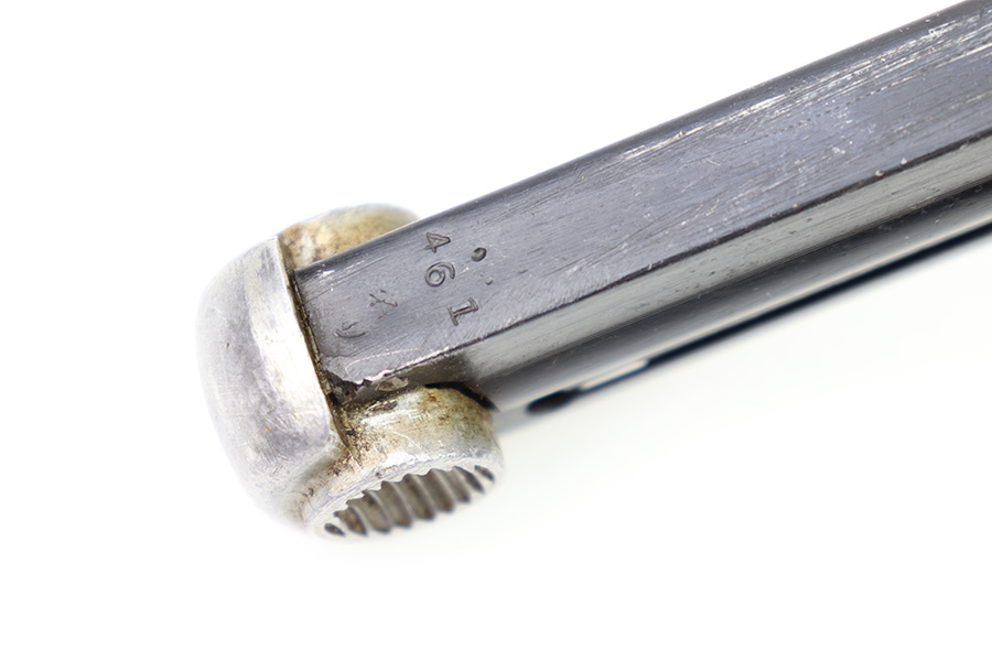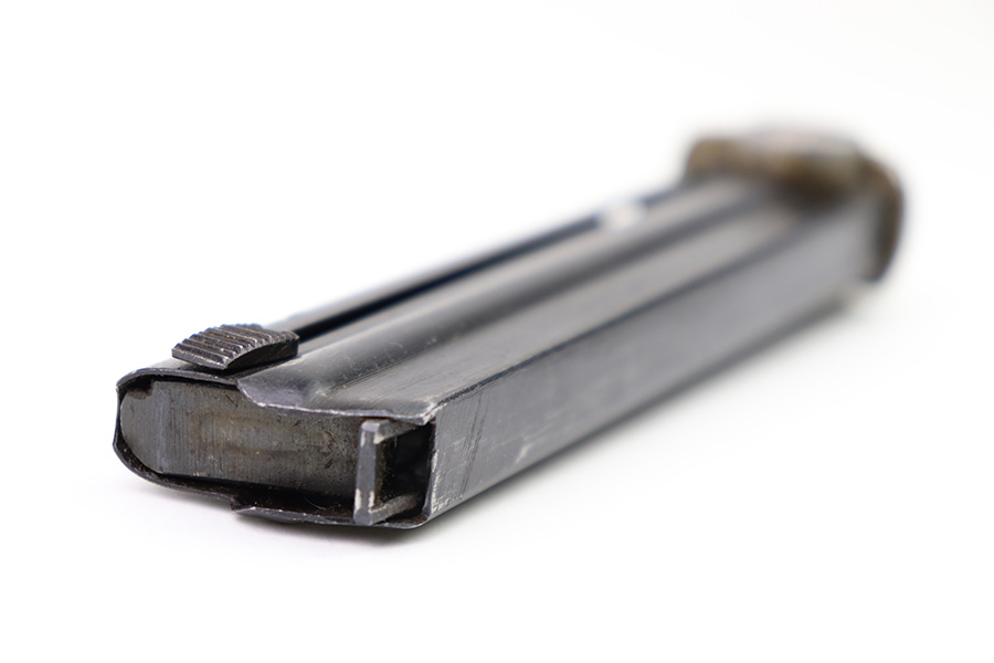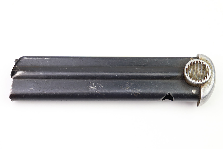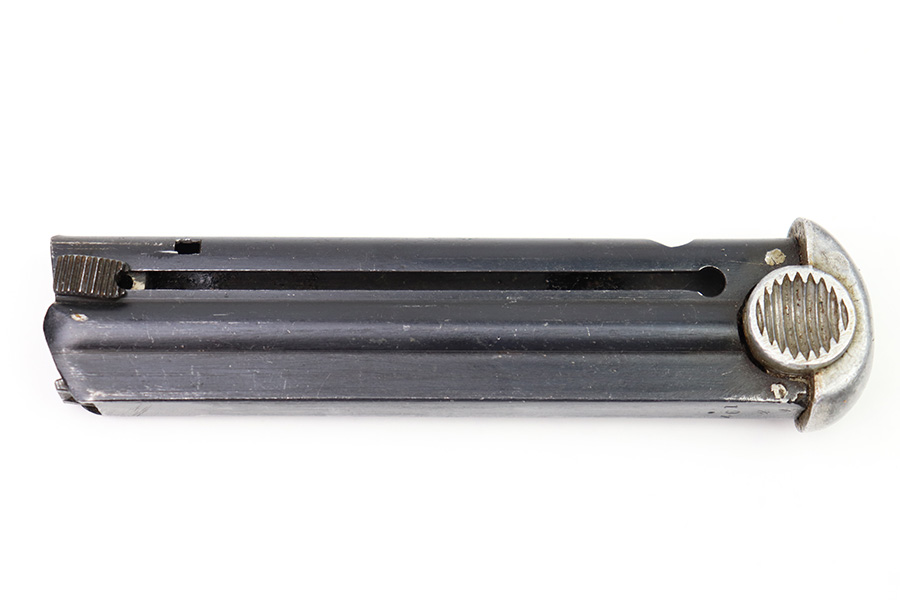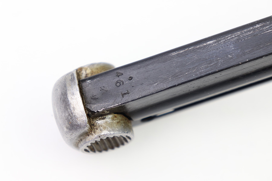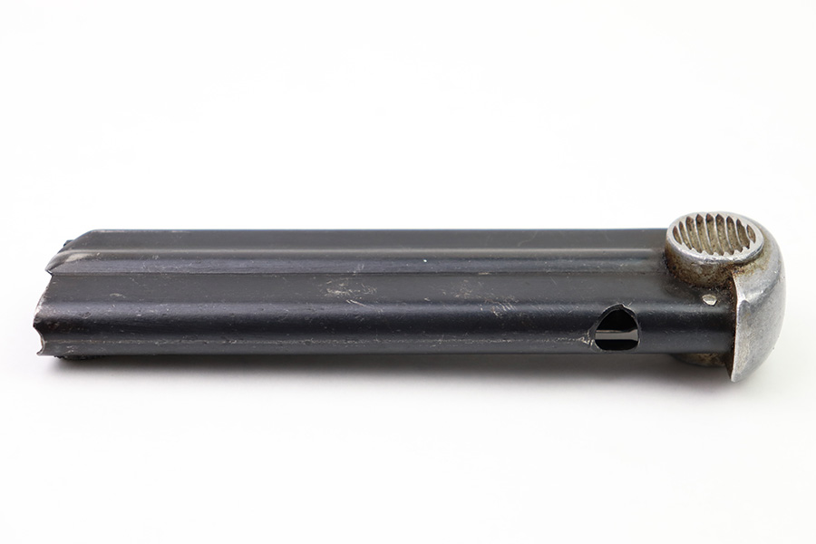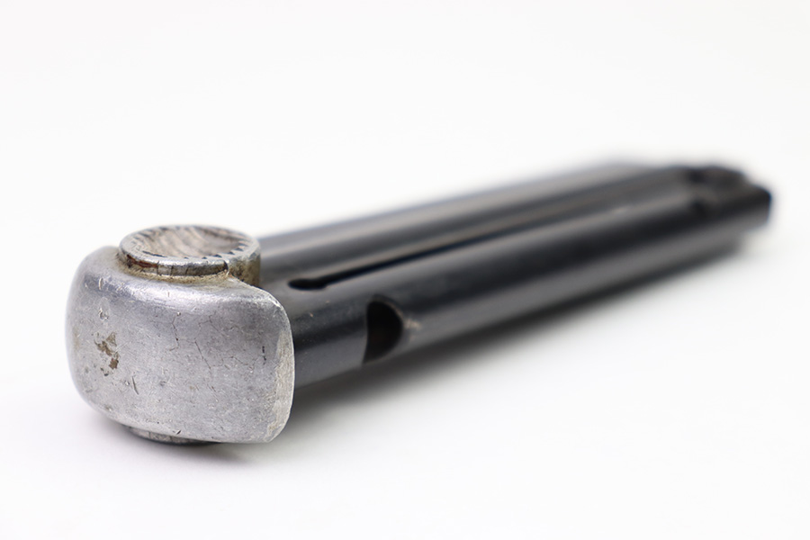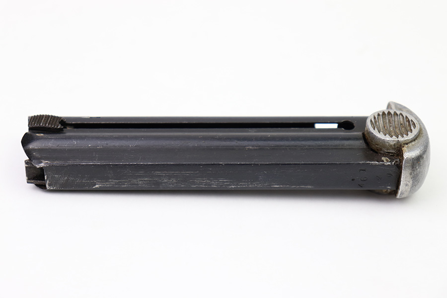 8/3/22 – This is an original Type 14 Nambu magazine from WW2. Wartime production with a blued tube and aluminum base. There’s minimal finish loss, and no rust or pitting. The spring is strong and fully functional. Serial numbered 461 on the spine.