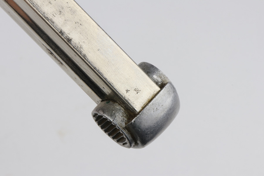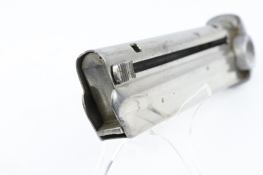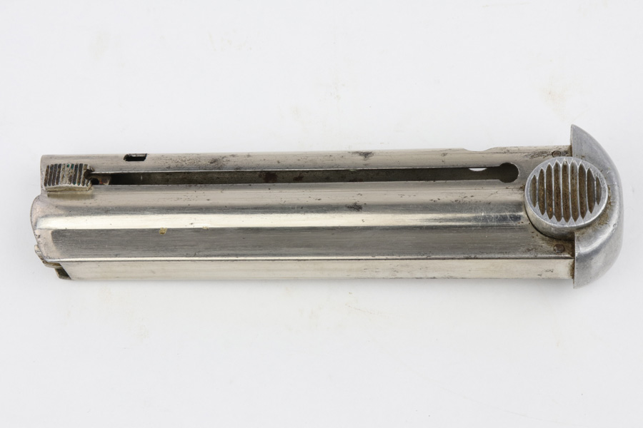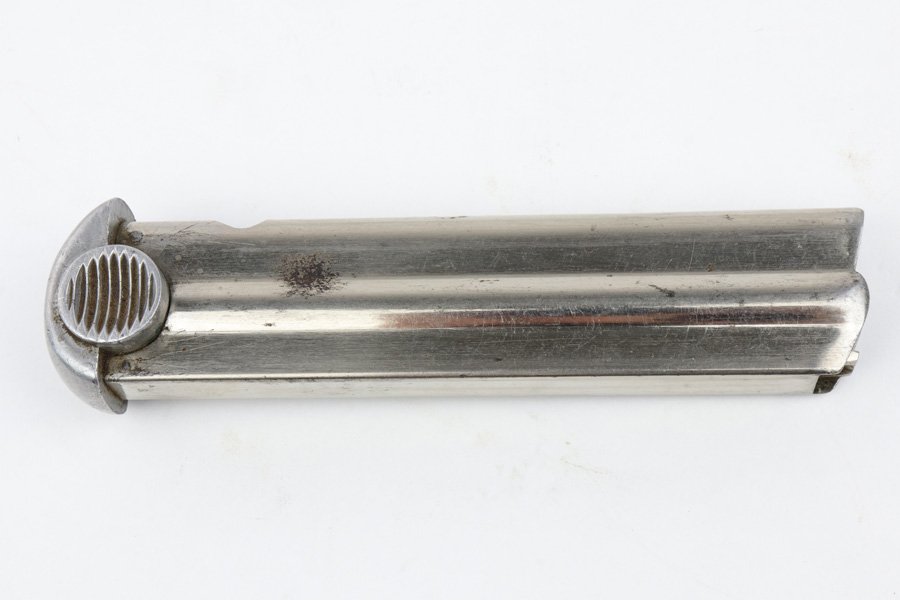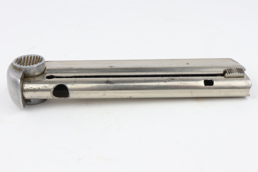 6/21/19 – This is an original, early nickle finished T14 Nambu magazine. This is a rare, desirable magazine not just because it’s early but also there’s no serial number on the spine. Collectors like these because they “match” just about any gun. There’s some light surface wear / oxidation on the metal but overall this magazine is excellent and fully functional.