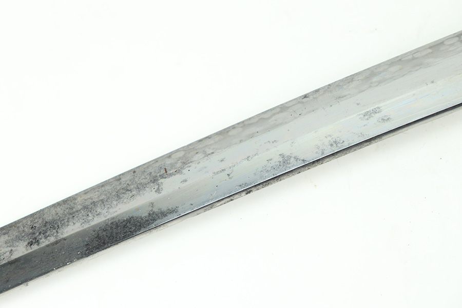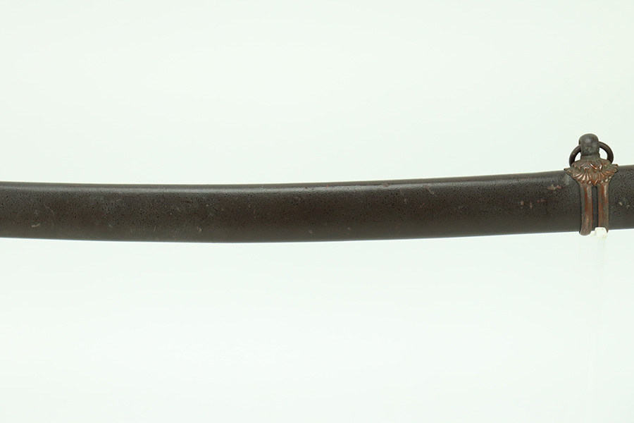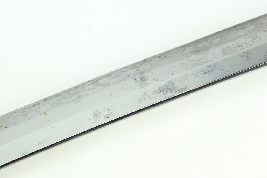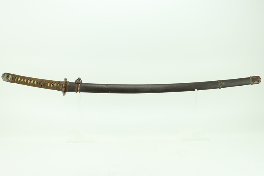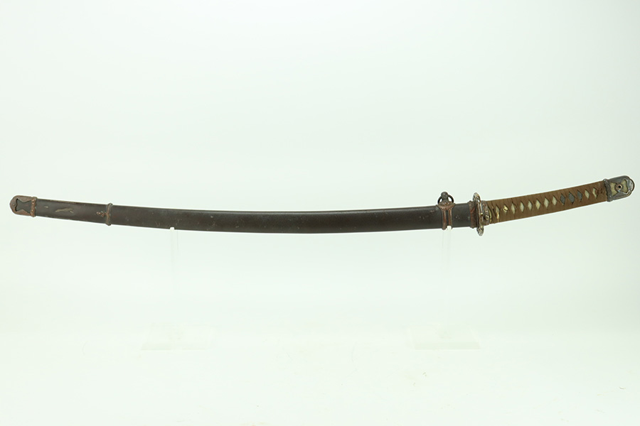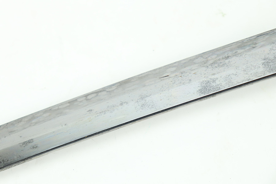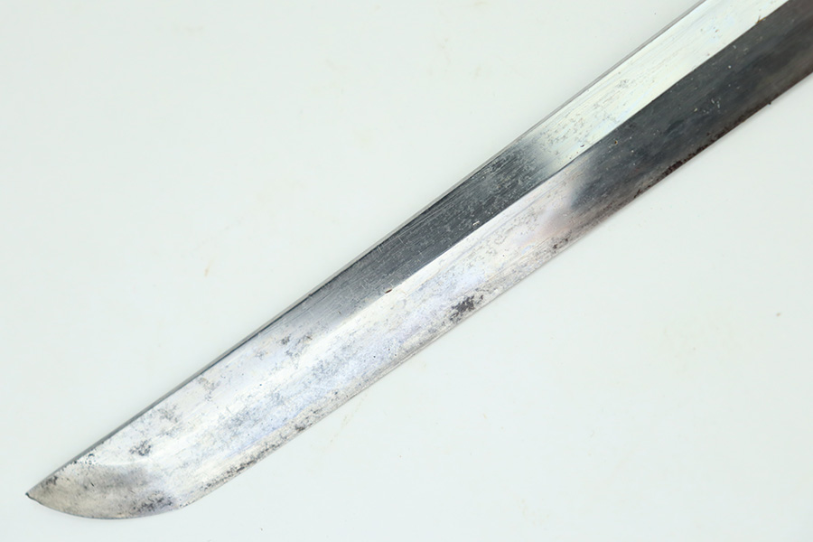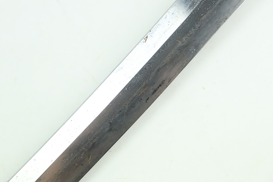1/30/24 – This is an original WW2 production Japanese Army T98 Officer sword. The sword is a factory-made example with standard Army fittings, handle, and sheath. The blade edge measures about 27.25 inches long with light surface oxidation throughout. The tempered edge is still visible, but there’s dark surface discoloration throughout this area. The edge has some mild speckling and a few pin-pricks near the tip. The tip is slightly bent, but still intact. Towards the tip of the blade there’s a heavier concentration of discoloration and some light areas of pitting. The tsuba is a later wartime example with original washers, but the fit is slightly loose. There’s about 1/4 inch of wiggle room throughout the fittings. The handle has a typical brown cloth wrap and intact ray skin. There’s a few small cracks in the ray skin on one side, and along the front rounded edge of the handle. The mekugi appears to be replacement and is very snug within the hilt of the blade. Marked with Japanese writing on both sides of the tang.