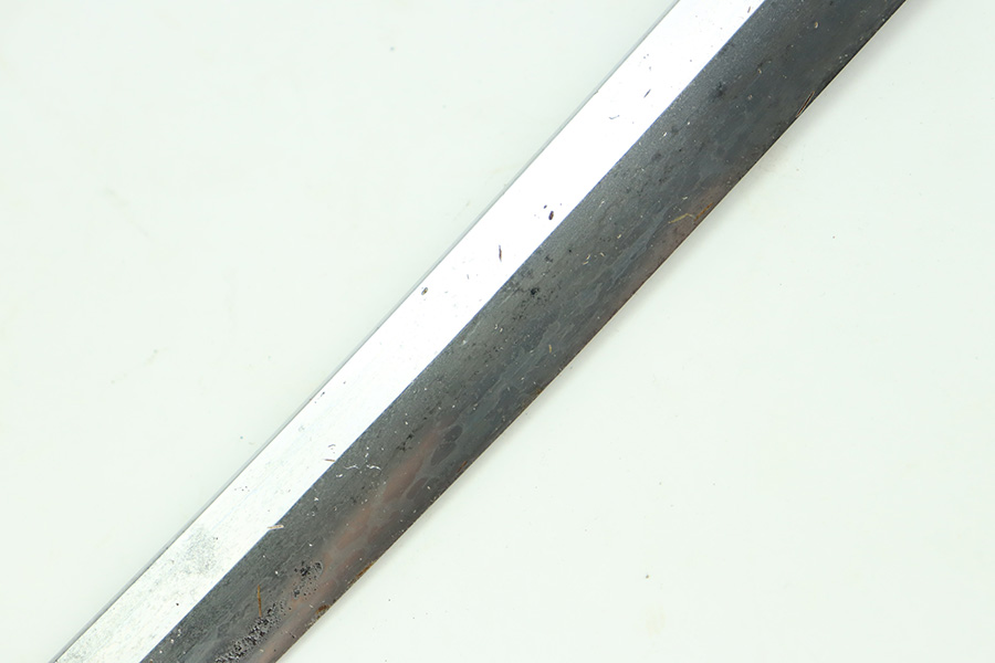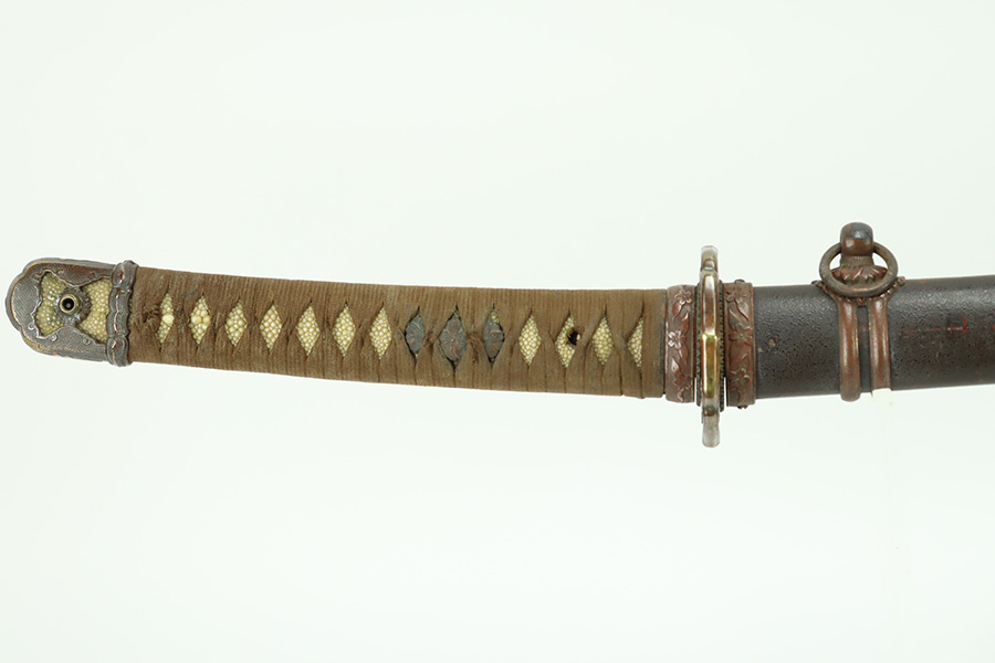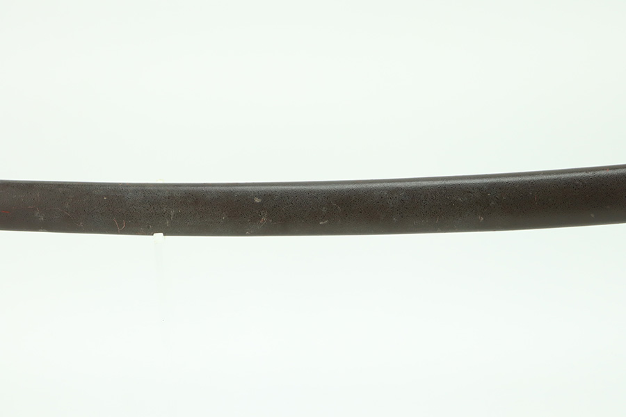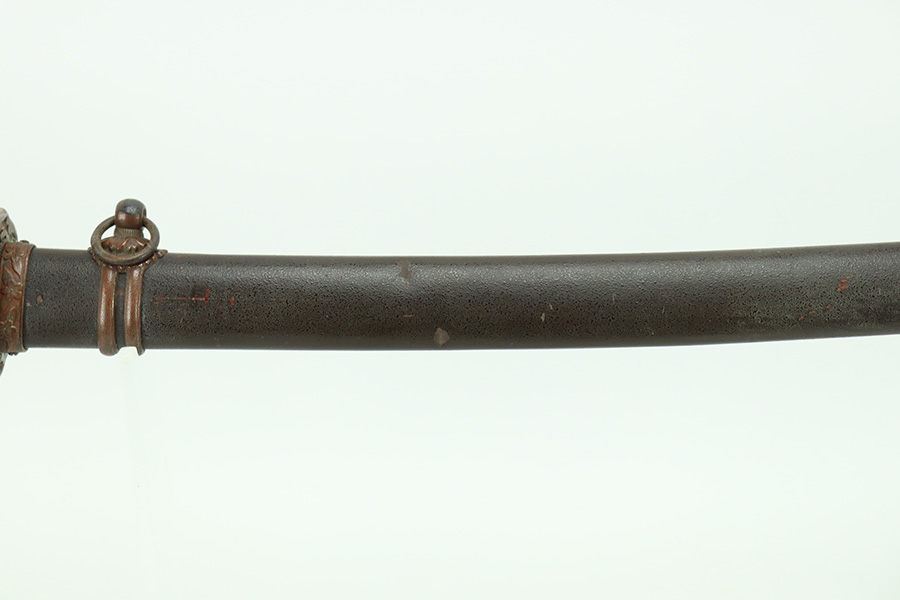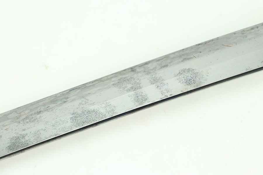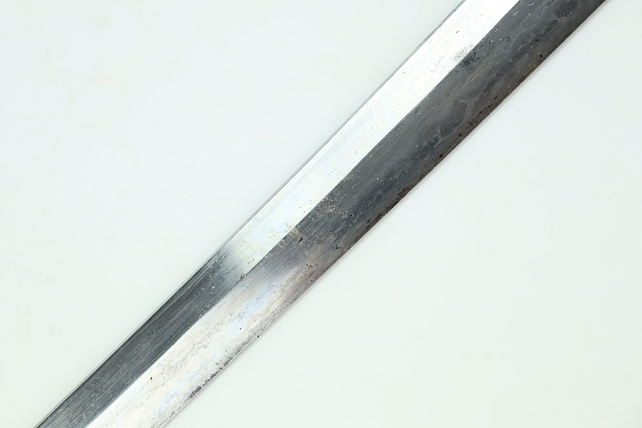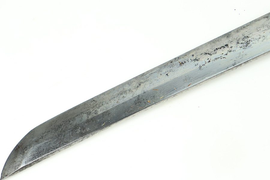 1/30/24 – This is an original WW2 production Japanese Army T98 Officer sword. The sword is a factory-made example with standard Army fittings, handle, and sheath. The blade edge measures about 27.25 inches long with light surface oxidation throughout. The tempered edge is still visible, but there’s dark surface discoloration throughout this area. The edge has some mild speckling and a few pin-pricks near the tip. The tip is slightly bent, but still intact. Towards the tip of the blade there’s a heavier concentration of discoloration and some light areas of pitting. The tsuba is a later wartime example with original washers, but the fit is slightly loose. There’s about 1/4 inch of wiggle room throughout the fittings. The handle has a typical brown cloth wrap and intact ray skin. There’s a few small cracks in the ray skin on one side, and along the front rounded edge of the handle. The mekugi appears to be replacement and is very snug within the hilt of the blade. Marked with Japanese writing on both sides of the tang.