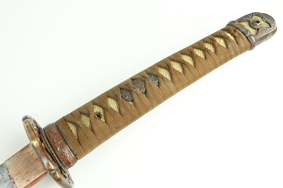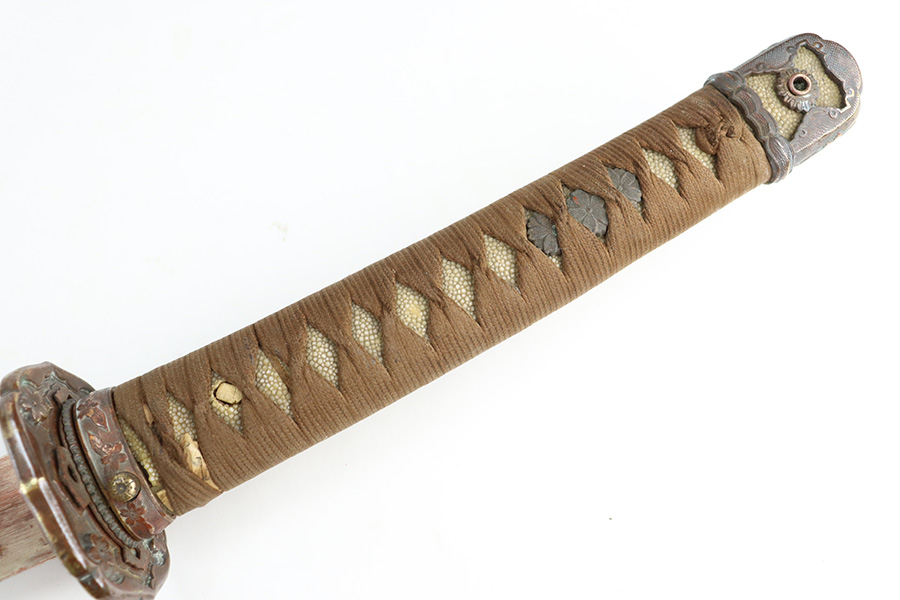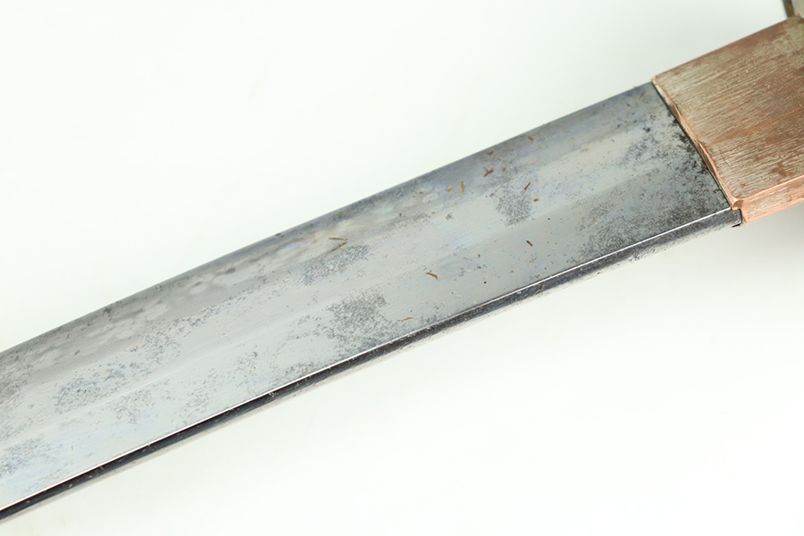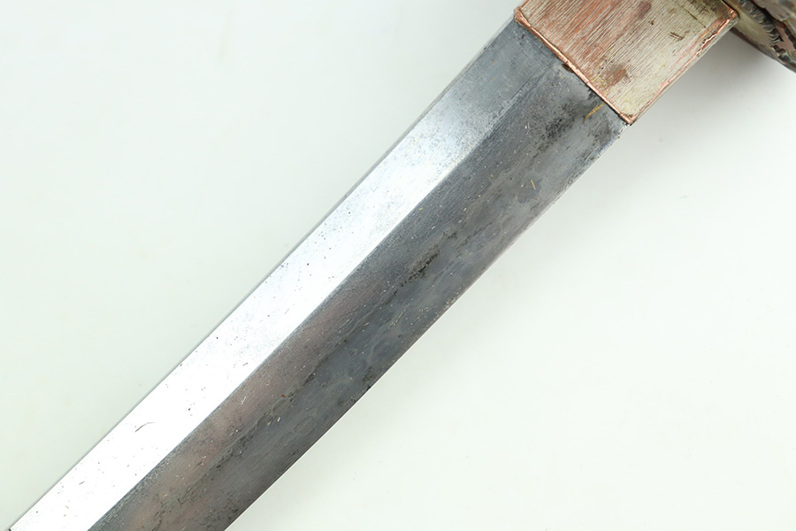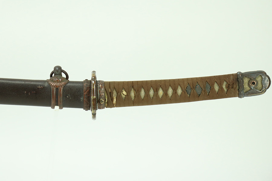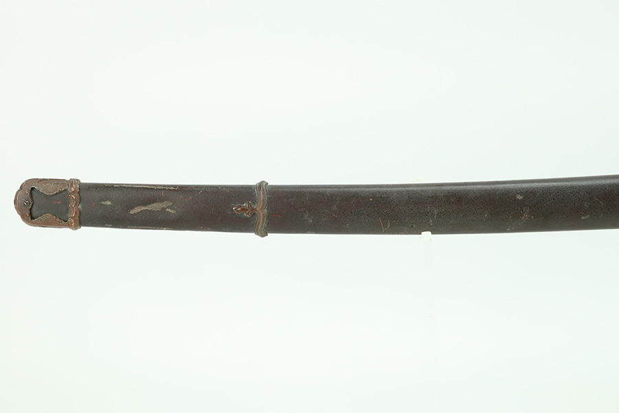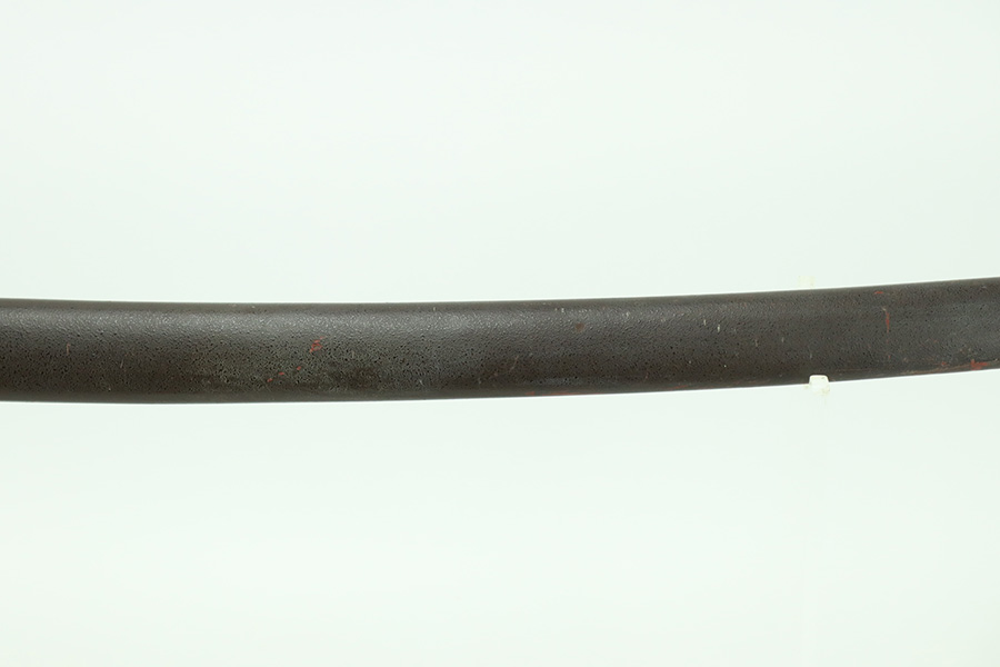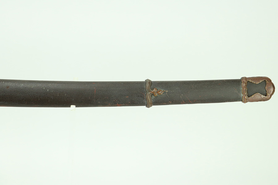 1/30/24 – This is an original WW2 production Japanese Army T98 Officer sword. The sword is a factory-made example with standard Army fittings, handle, and sheath. The blade edge measures about 27.25 inches long with light surface oxidation throughout. The tempered edge is still visible, but there’s dark surface discoloration throughout this area. The edge has some mild speckling and a few pin-pricks near the tip. The tip is slightly bent, but still intact. Towards the tip of the blade there’s a heavier concentration of discoloration and some light areas of pitting. The tsuba is a later wartime example with original washers, but the fit is slightly loose. There’s about 1/4 inch of wiggle room throughout the fittings. The handle has a typical brown cloth wrap and intact ray skin. There’s a few small cracks in the ray skin on one side, and along the front rounded edge of the handle. The mekugi appears to be replacement and is very snug within the hilt of the blade. Marked with Japanese writing on both sides of the tang.