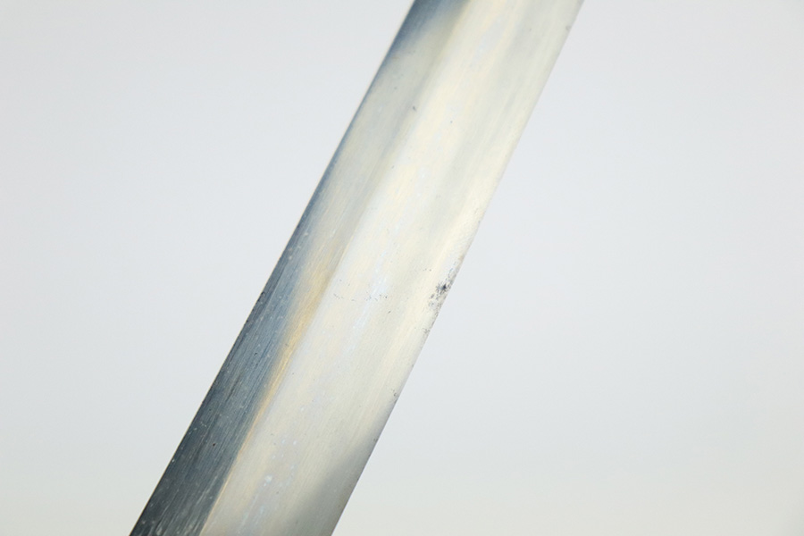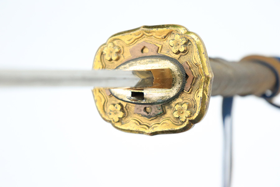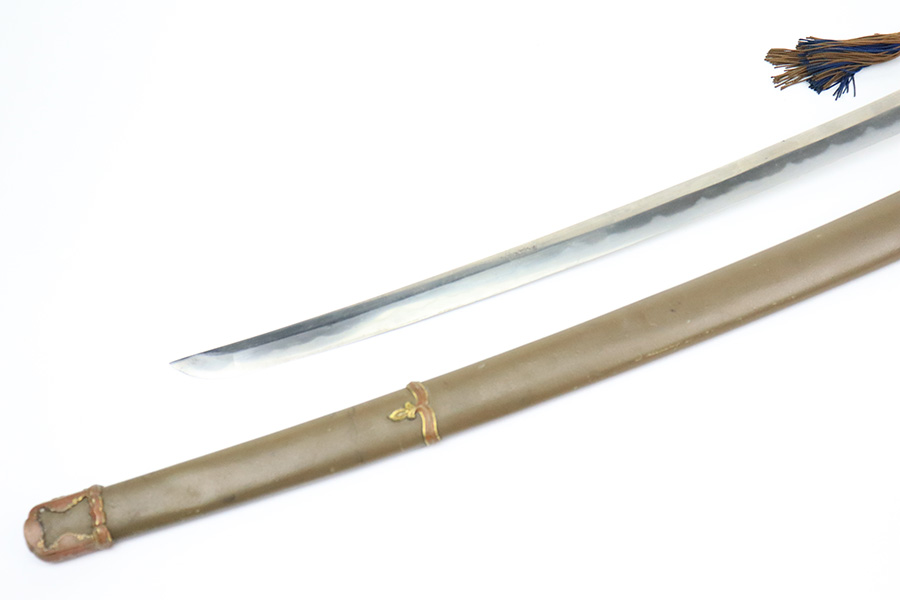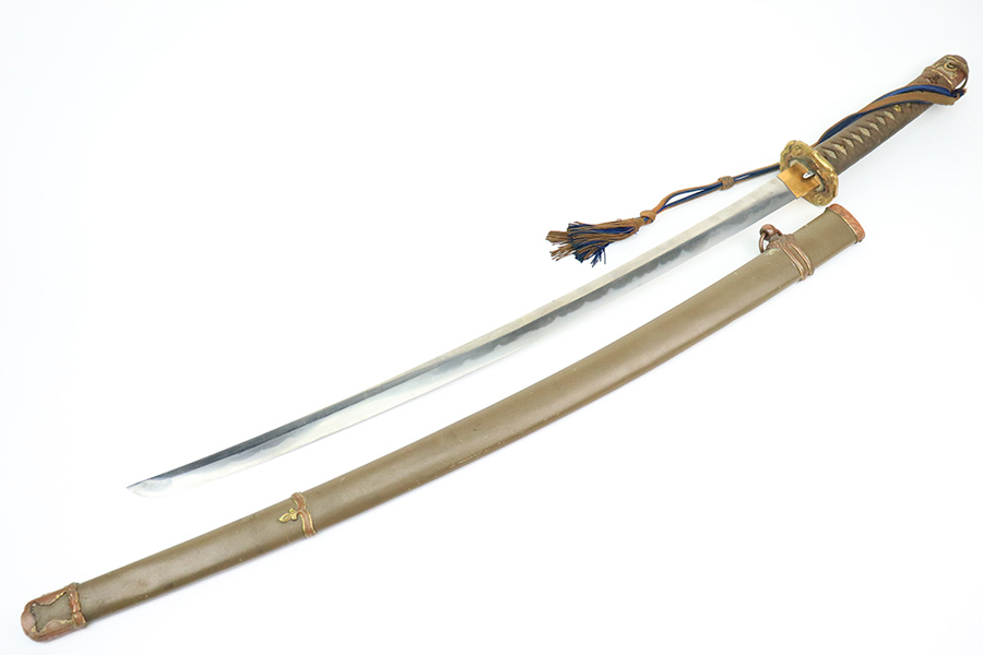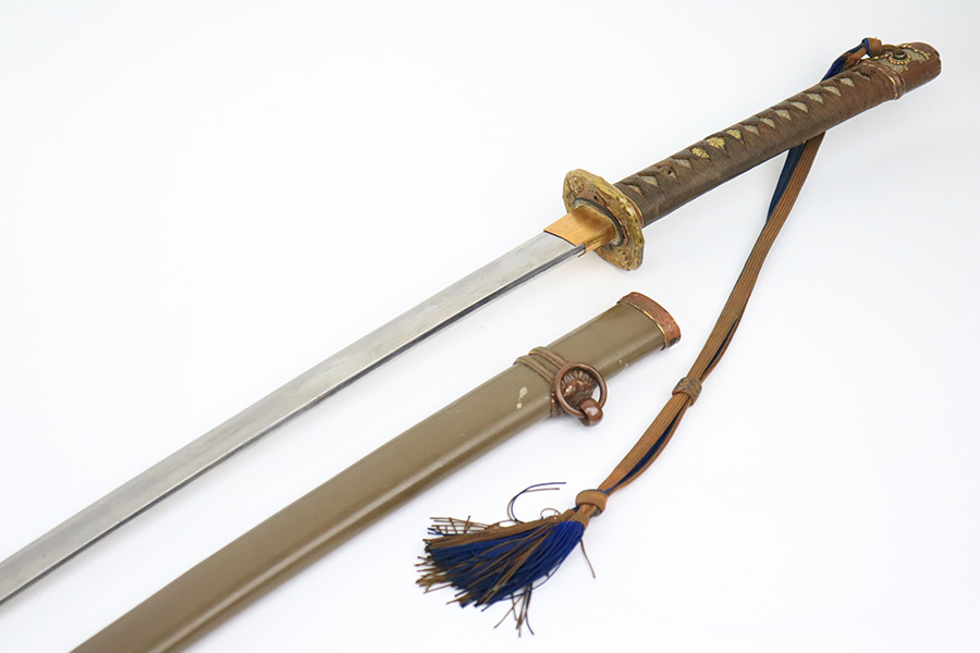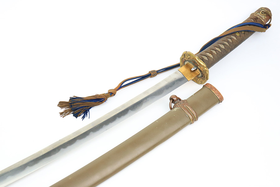 8/1/22 – This is an original Type 98 Japanese Officer Sword. The sword comes with an original scabbard and an Army Officer Tassel. The blade is factory made with nice natural patina on the hilt. The blade has a tempered edge and no chips or imperfections along the edge. There is some mild speckling and light areas of discoloration and surface patina along the edge however. The fittings and handle have handling wear and surface aging but no major issues. Some of the fittings are numbered as shown. The tassel is a nice brown and blue color with no notable flaws.