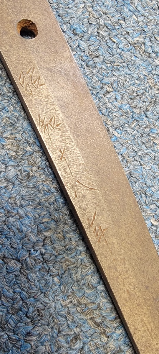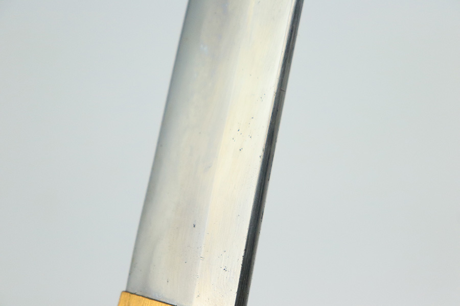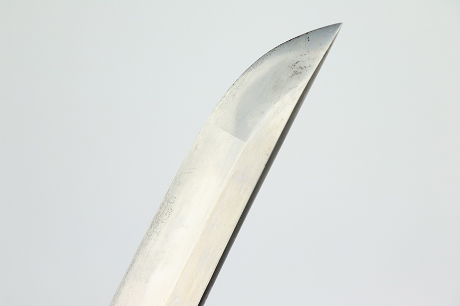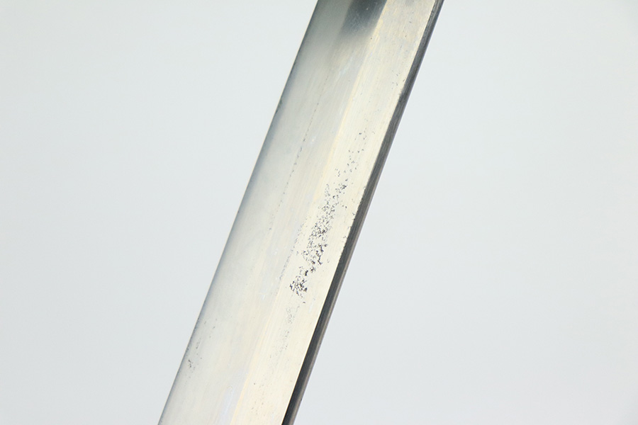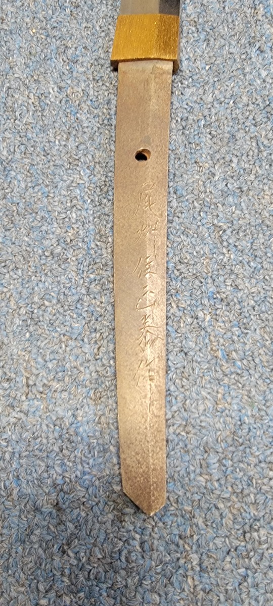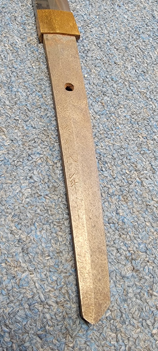 8/1/22 – This is an original Type 98 Japanese Officer Sword. The sword comes with an original scabbard and an Army Officer Tassel. The blade is factory made with nice natural patina on the hilt. The blade has a tempered edge and no chips or imperfections along the edge. There is some mild speckling and light areas of discoloration and surface patina along the edge however. The fittings and handle have handling wear and surface aging but no major issues. Some of the fittings are numbered as shown. The tassel is a nice brown and blue color with no notable flaws.