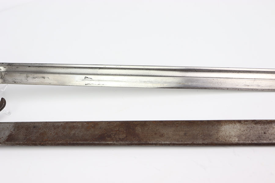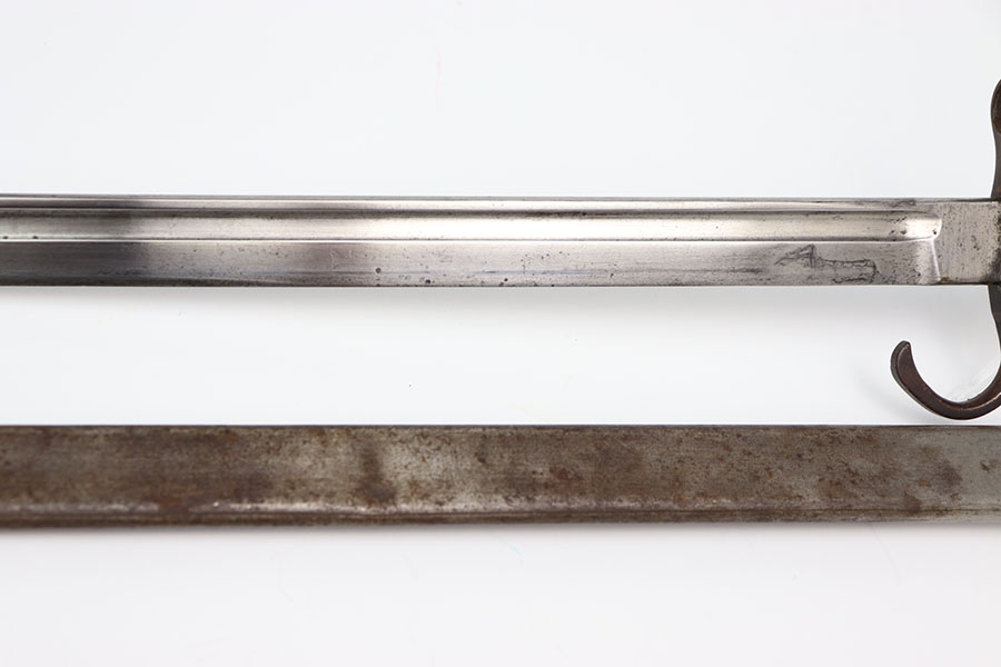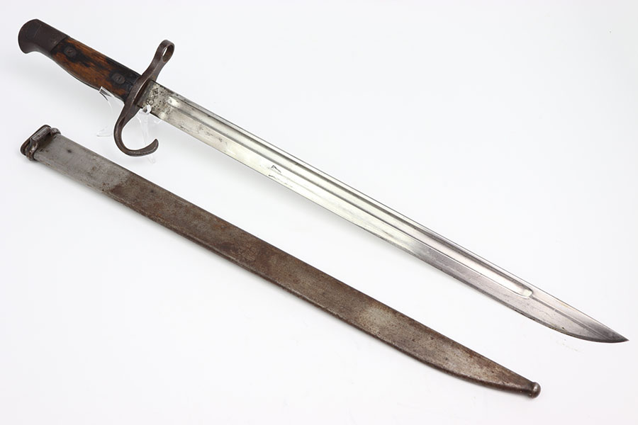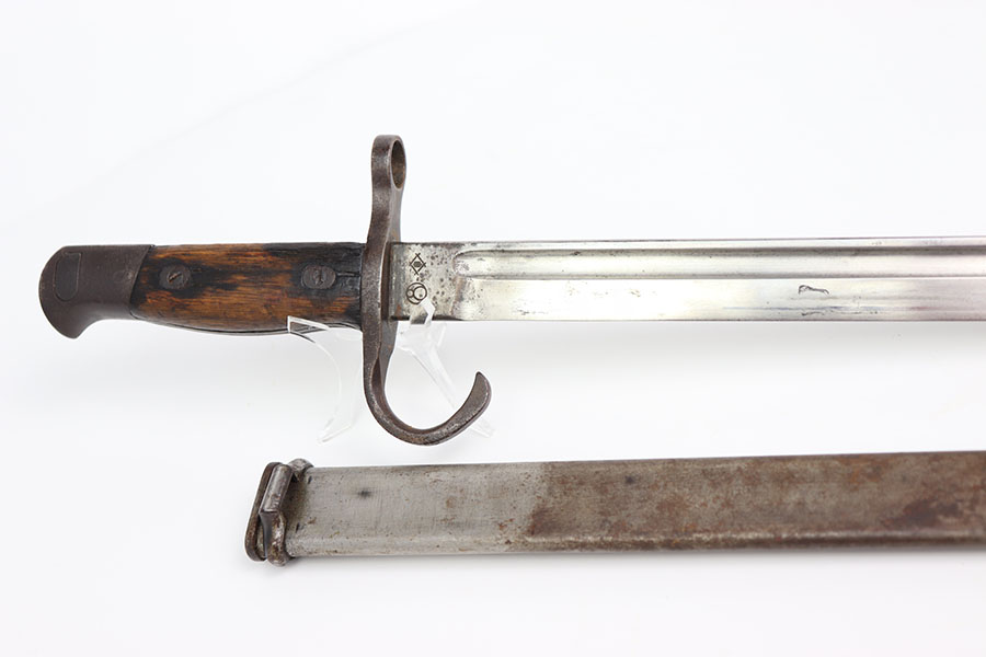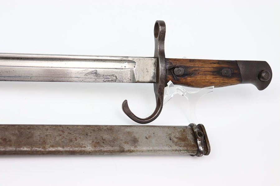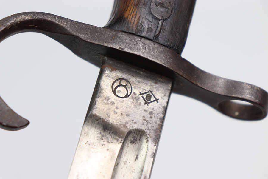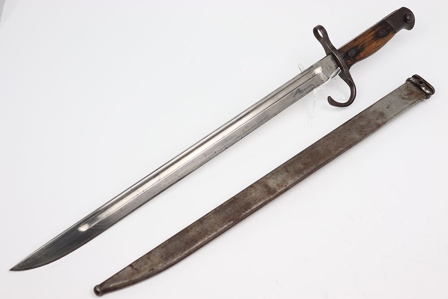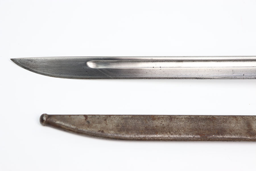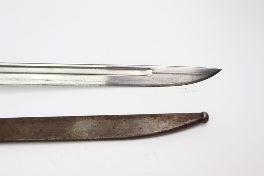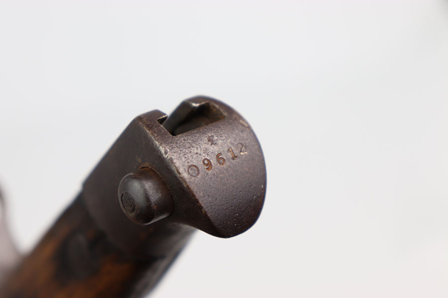 2/19/24 – This is a WW2 original Type 30 Arisaka rifle bayonet by Toyota Automatic Loom Works. The bayonet is cited in Labar’s book as LB-140 Variation A. Maker stamped on the base of the blade, which has minor oxidation but great throughout. Features a hooked cross guard and bird’s head pommel with mild patina throughout. Contoured wood grips are excellent with screws and washers. Comes with a metal cone-tipped scabbard. The scabbard has the majority of wear, patina, and a couple minor dents but overall a great example.
