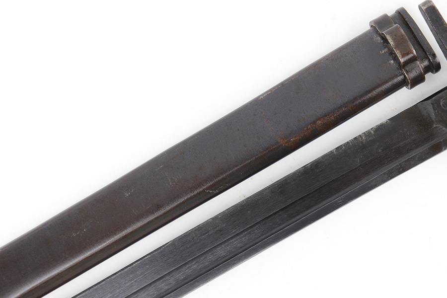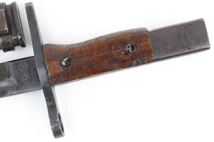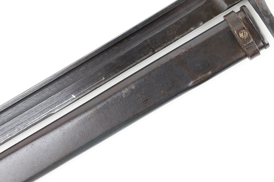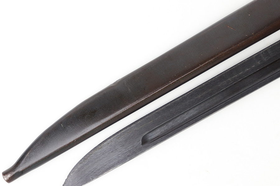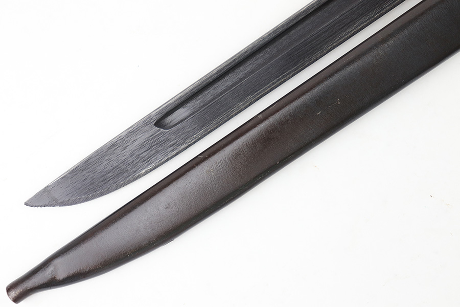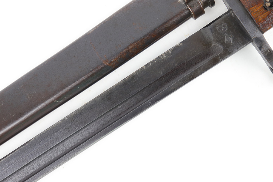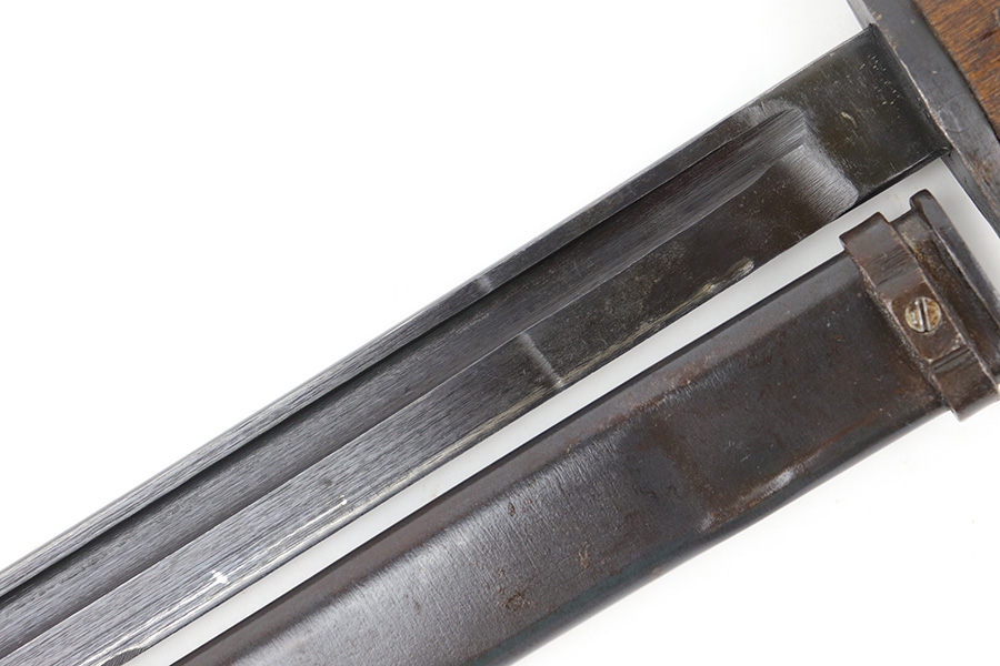5/12/23 – This is an original WW2 production Japanese Type 30 Rifle Bayonet. The bayonet is known as a Variation K in Labar’s book, on page 173. This is a fairly uncommon variation with a blued fullered blade, contoured wrap-around wood grips with 2 rivets, straight cross guard, and rectangular pommel. The pommel is serial numbered within the 106th series, and TALW inspector stamped. This is the last variation with a fullered blade, and this example has an excellent blade with most of the original bluing intact. Some light signs of sharpening along the edge, and a TALW arsenal stamp at the base of the blade. No notable flaws throughout the hilt and handle. Comes with a tubular-tipped metal scabbard that’s also in great condition with some mild surface patina throughout.
