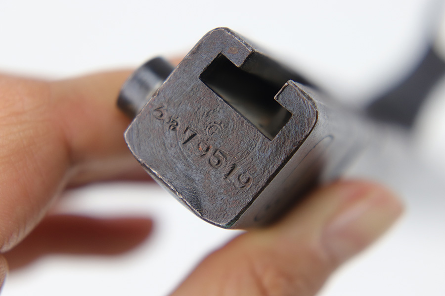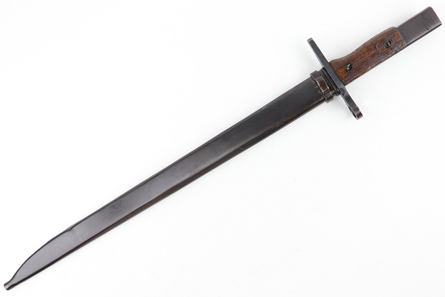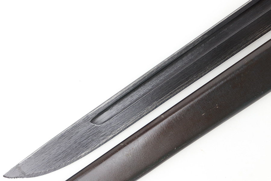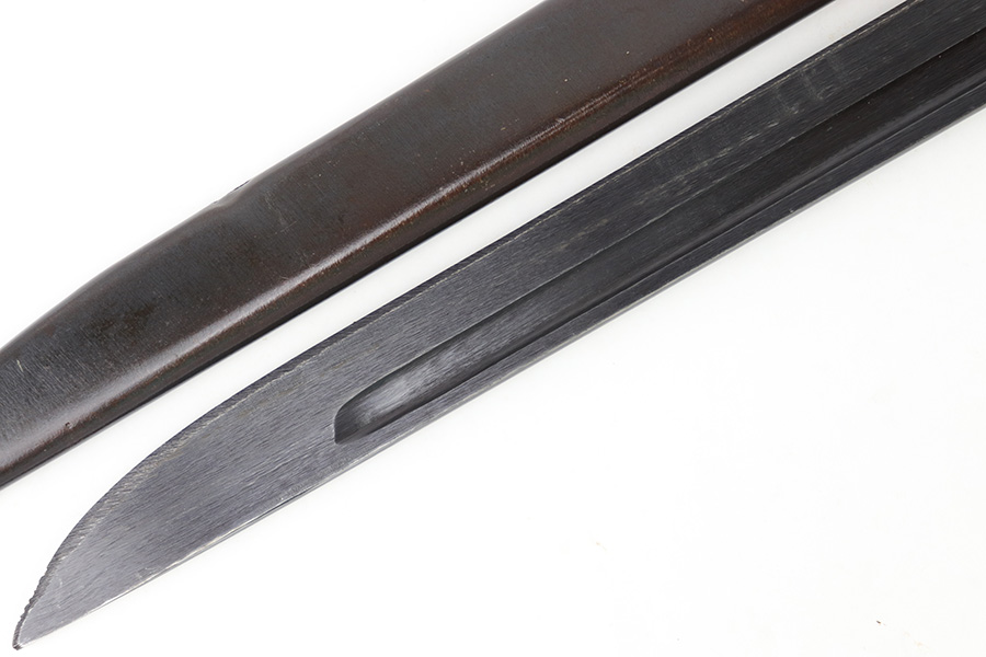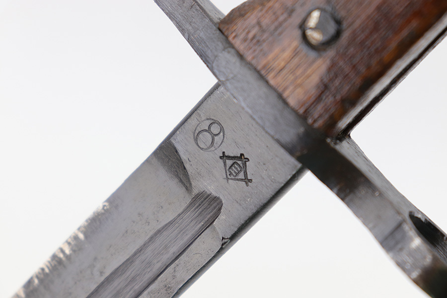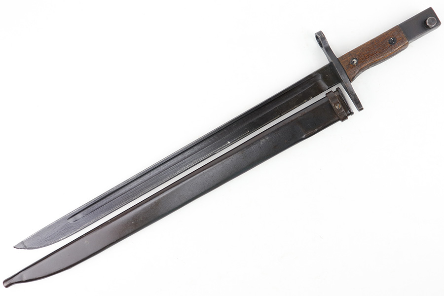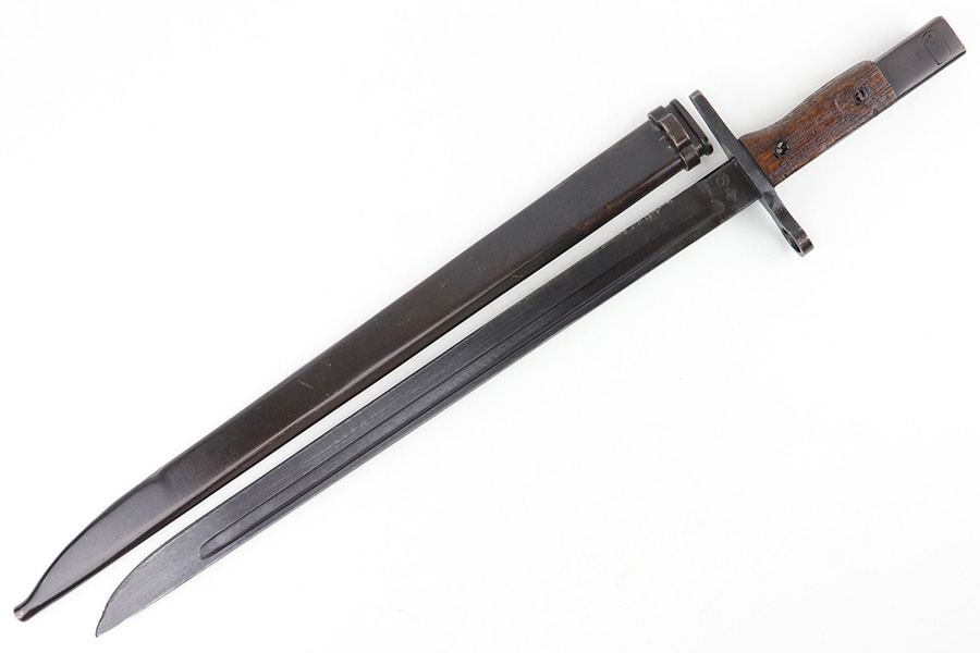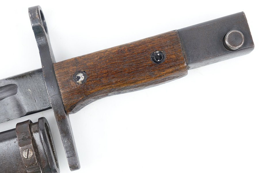 5/12/23 – This is an original WW2 production Japanese Type 30 Rifle Bayonet. The bayonet is known as a Variation K in Labar’s book, on page 173. This is a fairly uncommon variation with a blued fullered blade, contoured wrap-around wood grips with 2 rivets, straight cross guard, and rectangular pommel. The pommel is serial numbered within the 106th series, and TALW inspector stamped. This is the last variation with a fullered blade, and this example has an excellent blade with most of the original bluing intact. Some light signs of sharpening along the edge, and a TALW arsenal stamp at the base of the blade. No notable flaws throughout the hilt and handle. Comes with a tubular-tipped metal scabbard that’s also in great condition with some mild surface patina throughout.