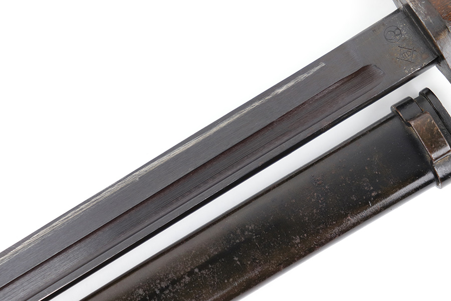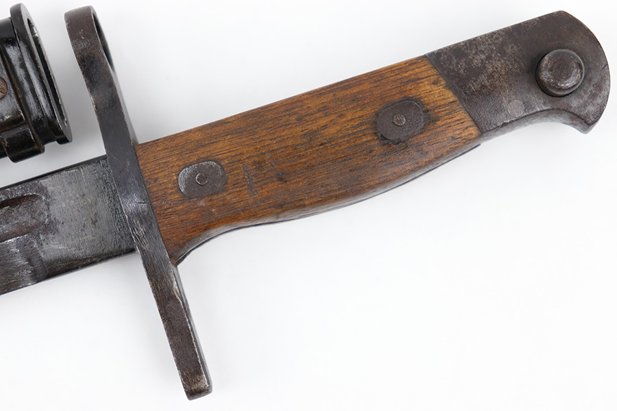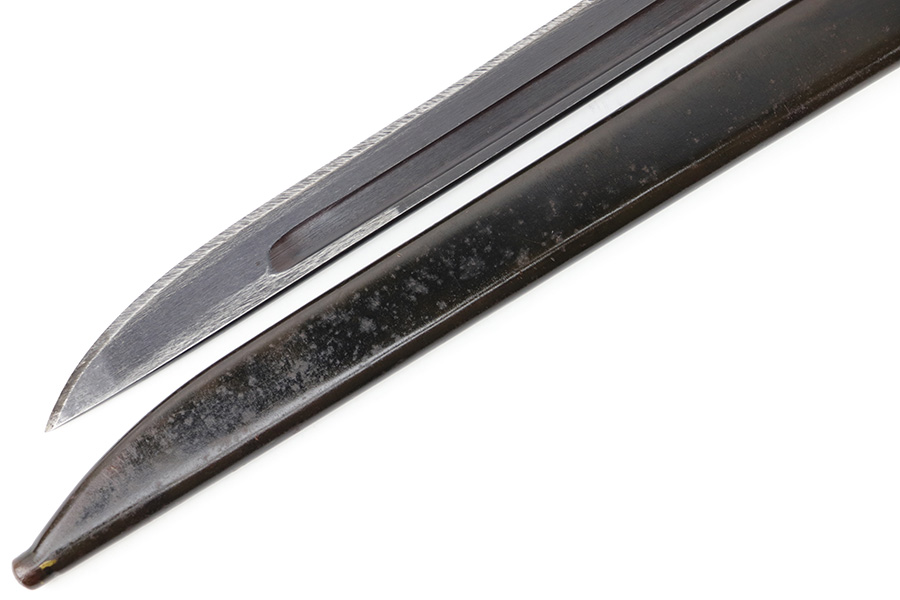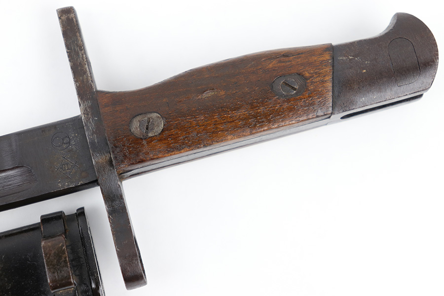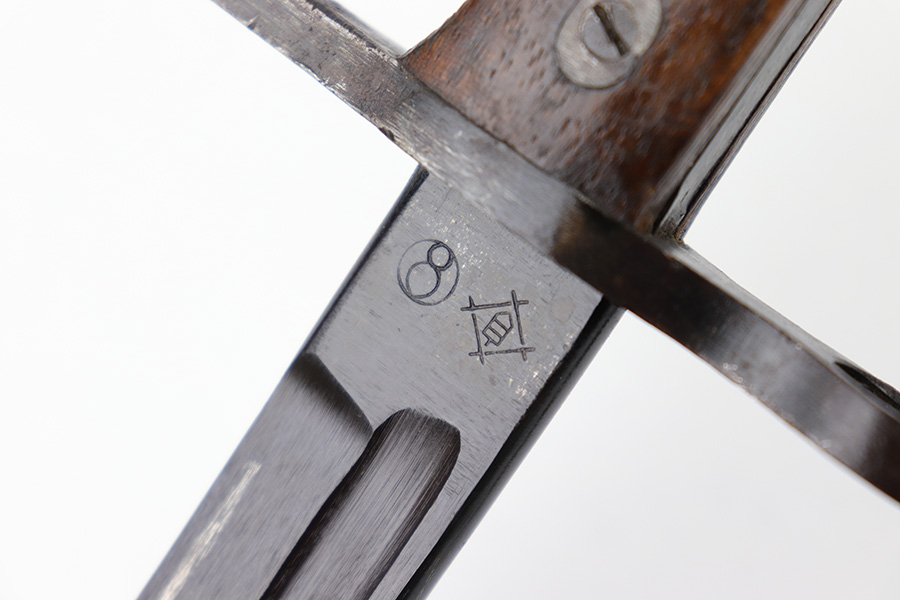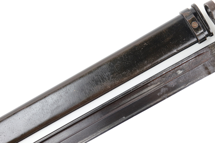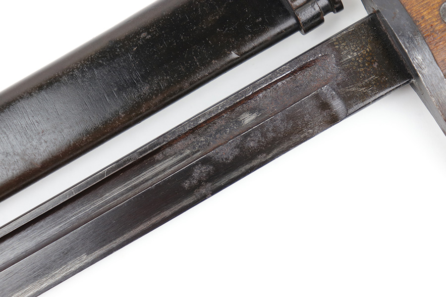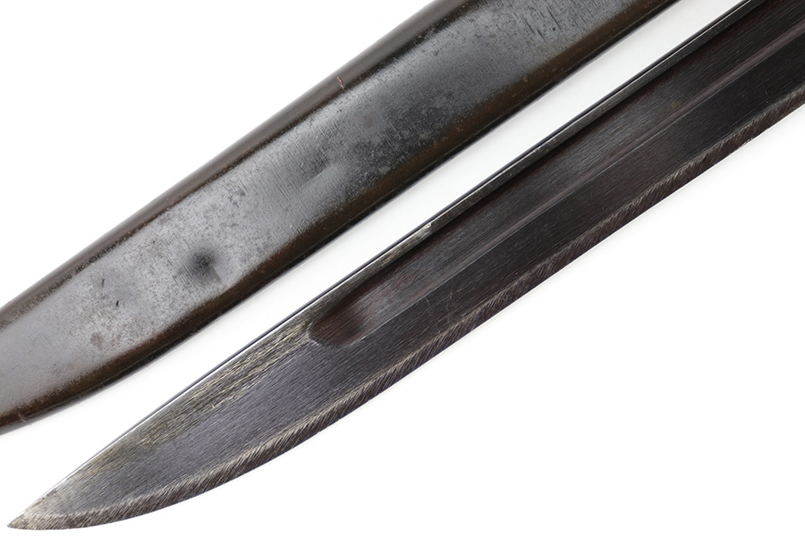 5/22/23 – This is an original WW2 Japanese Type 30 bayonet. The bayonet is known as a variation D on page 172 of Labar’s book. The bayonet features a blued fullered blade, straight cross guard, 2 screws & washers in contoured wood grips, bird’s head pommel, and a cone-tipped metal scabbard. The blade is sharpened about halfway down the edge and has very nice original bluing throughout. There’s dark patina and some surface pitting near the base of the blade, mostly on the side opposite the maker stamp. The hand guard and pommel have some dark patina and finish loss but no major issues. Excellent grips and the pommel is numbered and stamped with a Nagoya inspector’s mark. The scabbard has a few mild dents near the base but is in great overall condition.