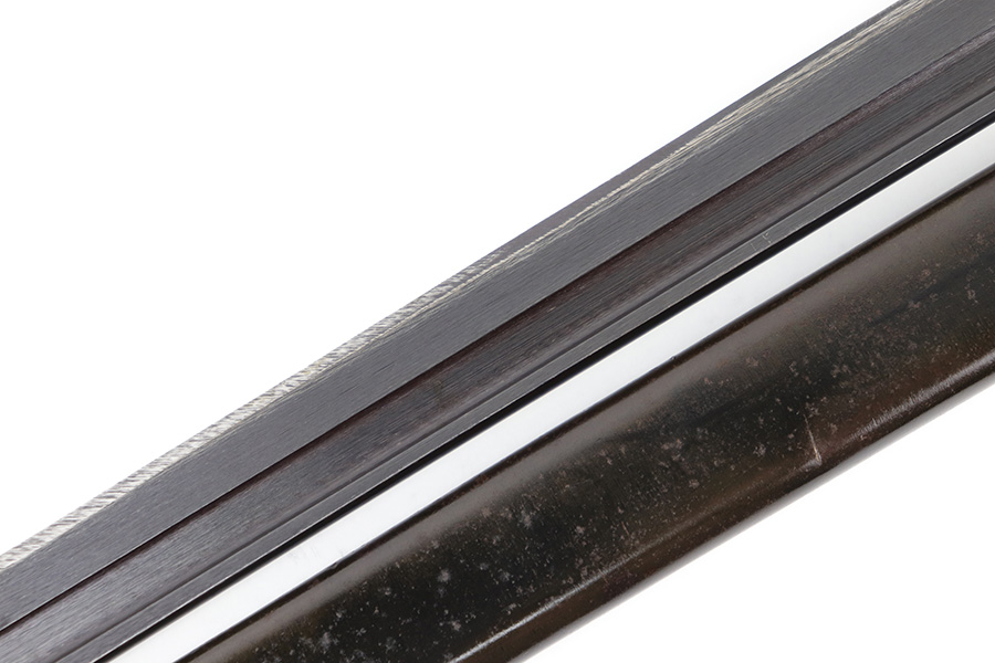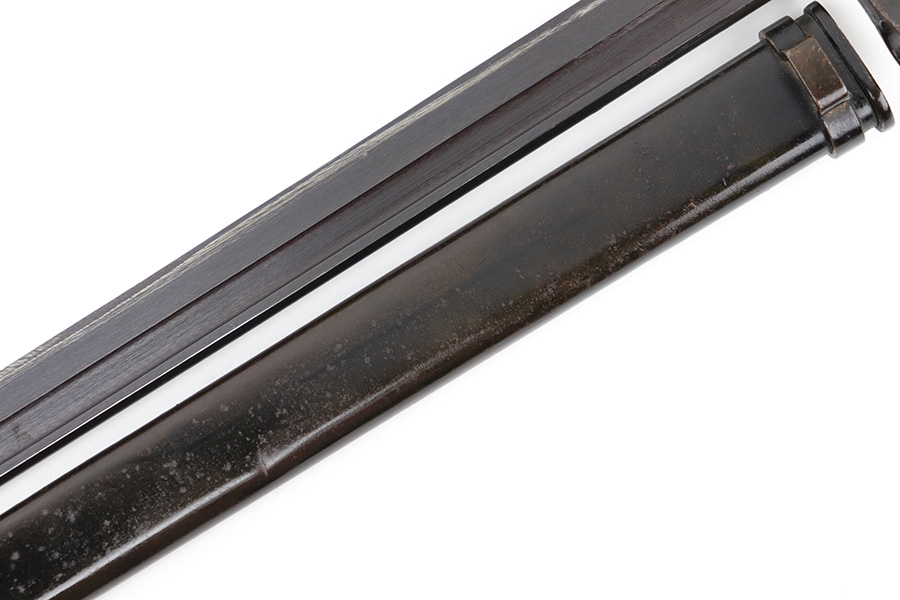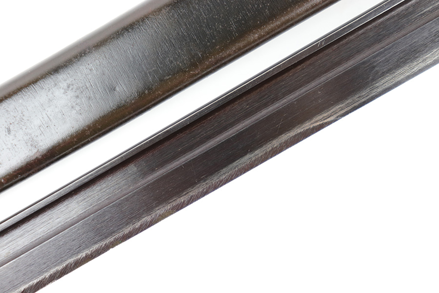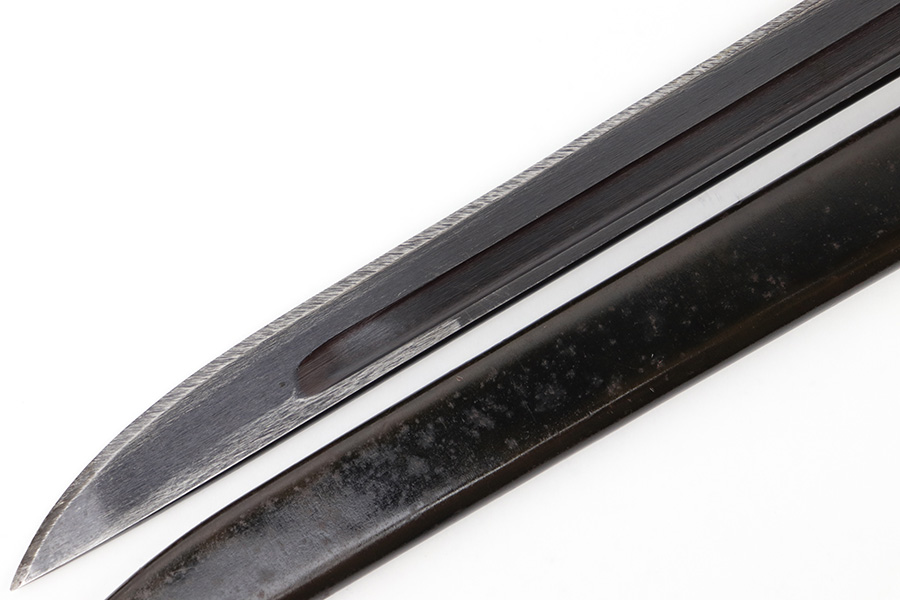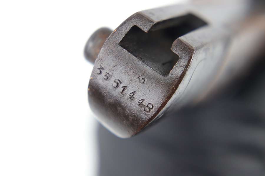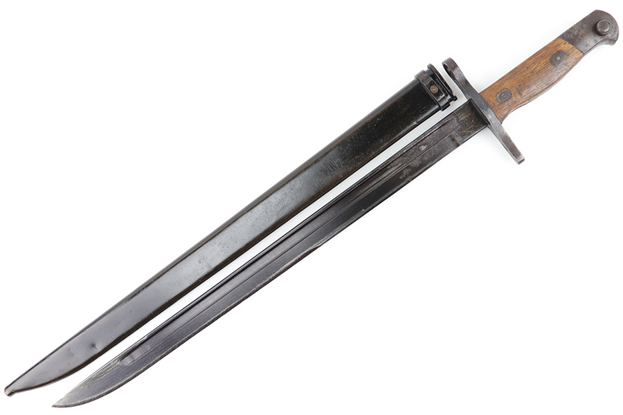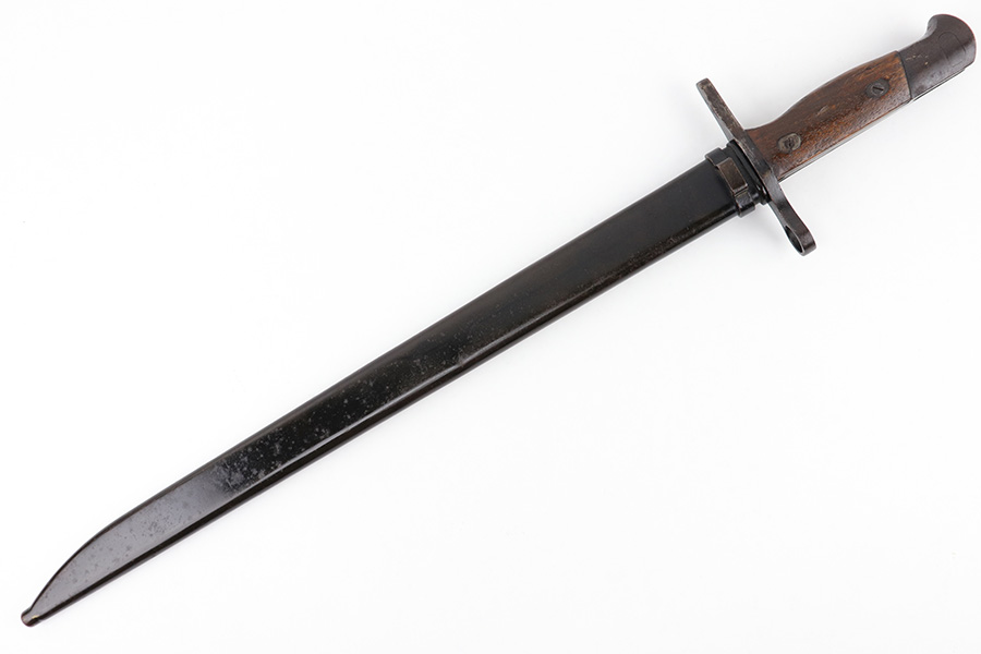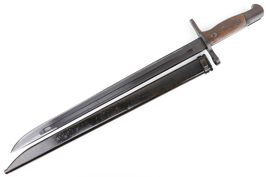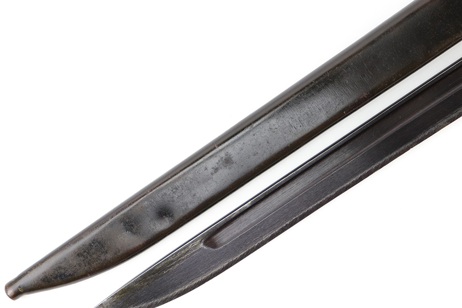 5/22/23 – This is an original WW2 Japanese Type 30 bayonet. The bayonet is known as a variation D on page 172 of Labar’s book. The bayonet features a blued fullered blade, straight cross guard, 2 screws & washers in contoured wood grips, bird’s head pommel, and a cone-tipped metal scabbard. The blade is sharpened about halfway down the edge and has very nice original bluing throughout. There’s dark patina and some surface pitting near the base of the blade, mostly on the side opposite the maker stamp. The hand guard and pommel have some dark patina and finish loss but no major issues. Excellent grips and the pommel is numbered and stamped with a Nagoya inspector’s mark. The scabbard has a few mild dents near the base but is in great overall condition.