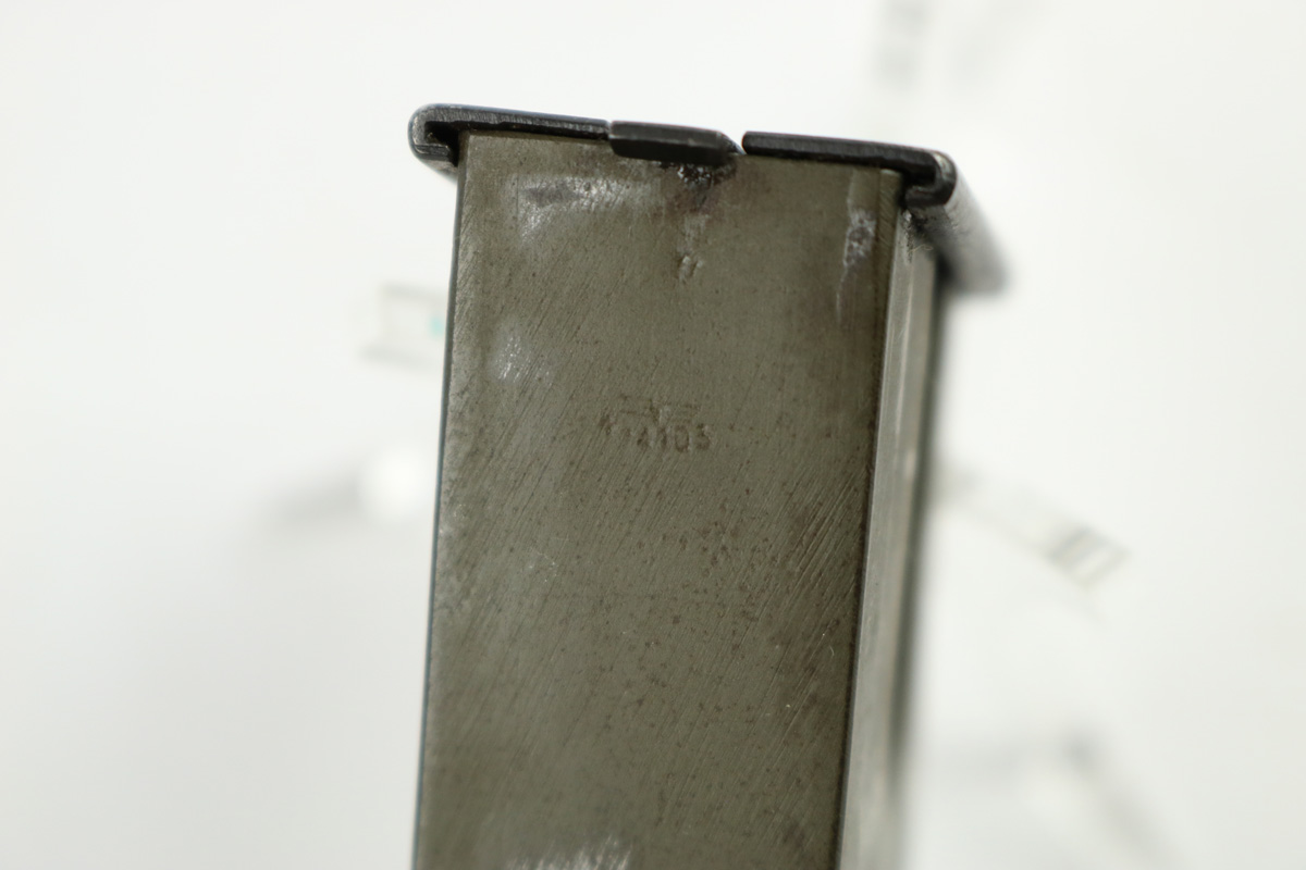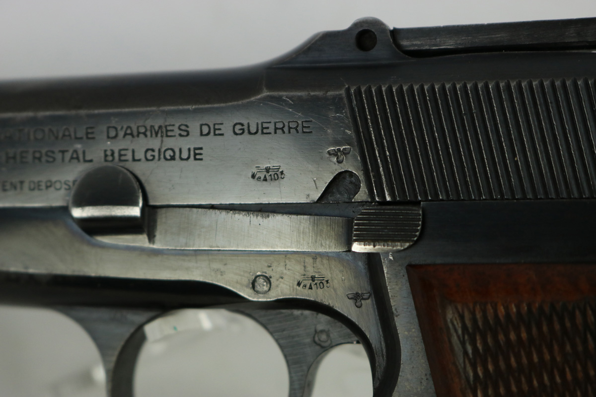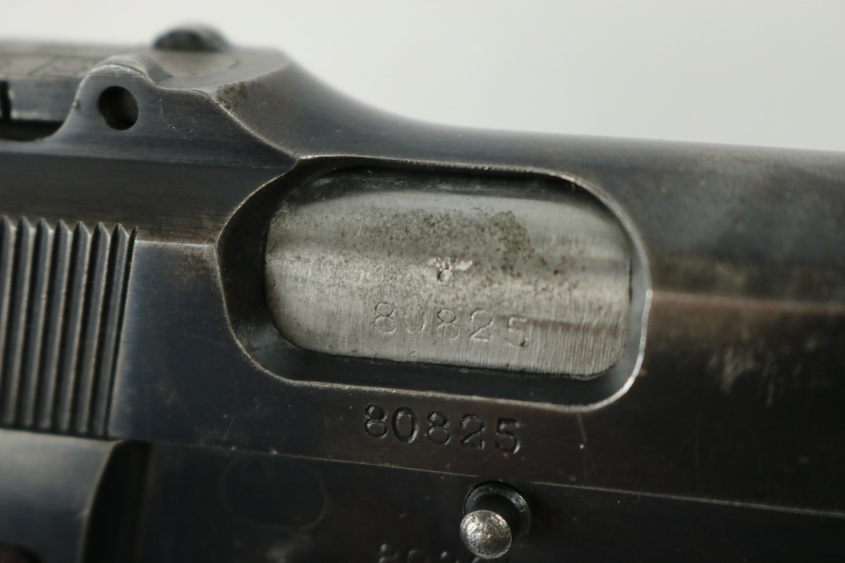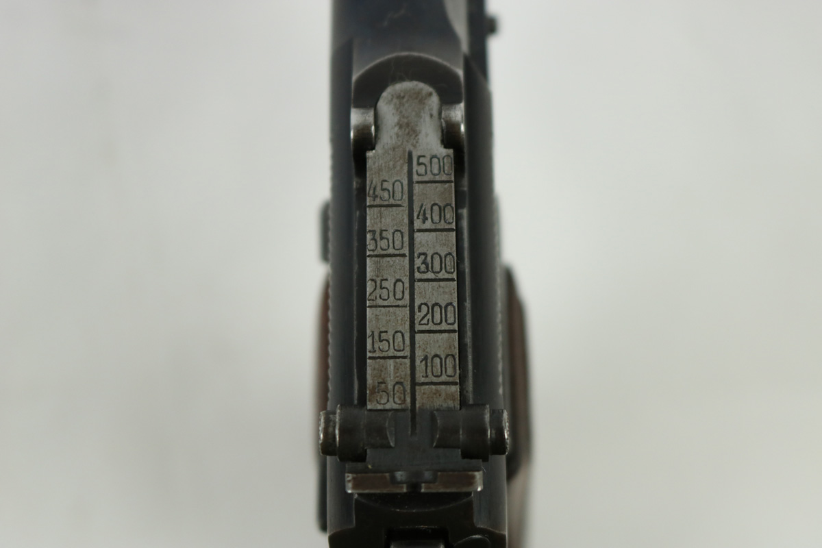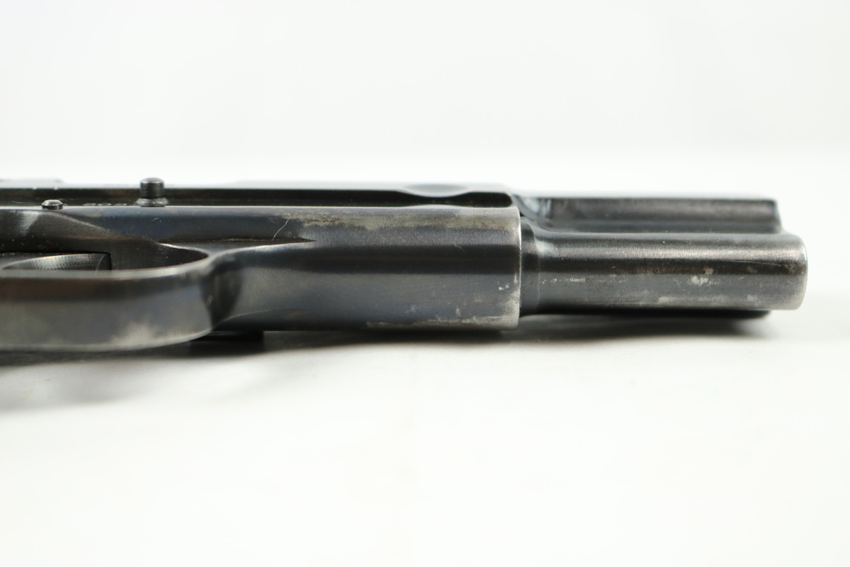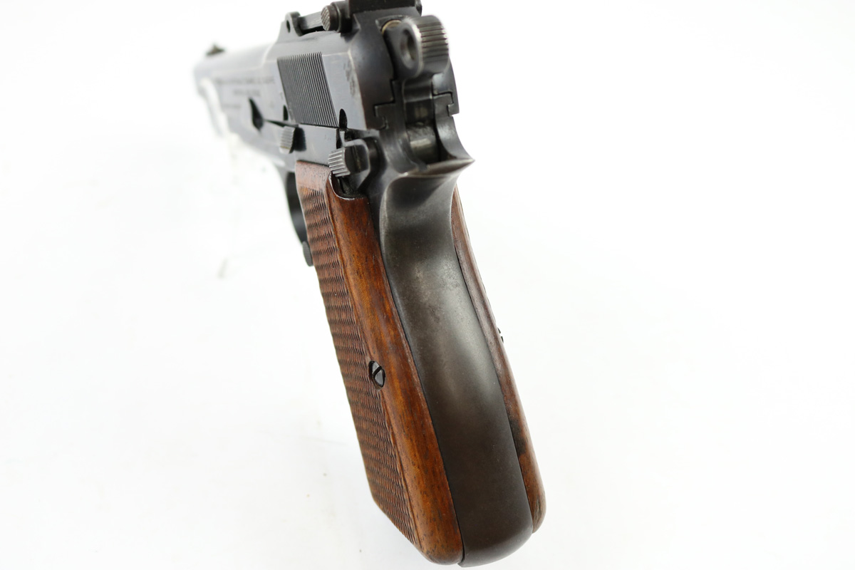9/26/18 – This is an original, fairly early and scarce WaA103 Tangent Hi Power. The pistol has a high polish finish that is mostly in tact, original wood grips, a tangent rear sight, and waffen 103 proof stamps. Roughly 80-85% of the finish remains in tact, despite wear throughout the front and back straps, as well as general bluing loss on the frame and slide. The straps have more discoloration and significant wear than the slide and remaining frame. The left side of the slide has small pin marks as if someone struck it multiple times in this area – or maybe it was hit by shrapnel. The wood grips have no cracks or chips. All correct, matching, and fully functional. The bore is a 7 out of 10 with good rifling but there’s clear signs of use and patina throughout. Guaranteed original. Comes with one original WaA103 proofed magazine as well.