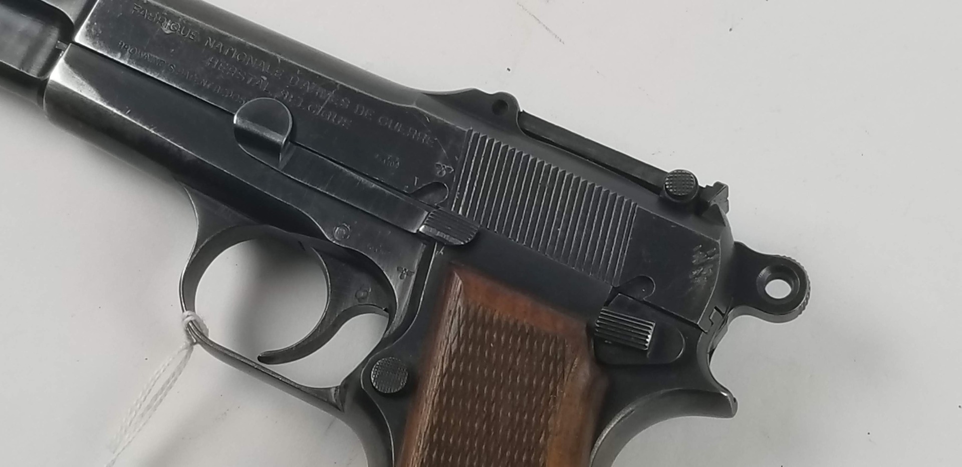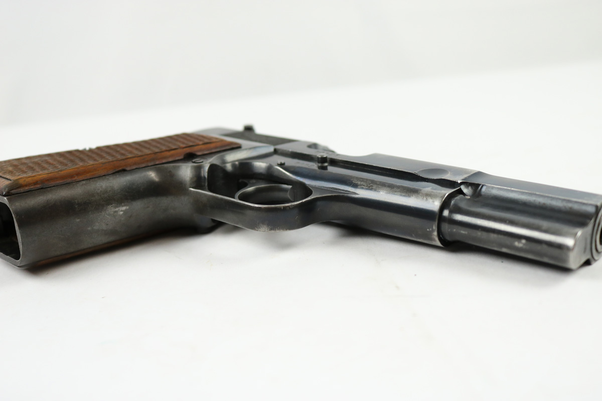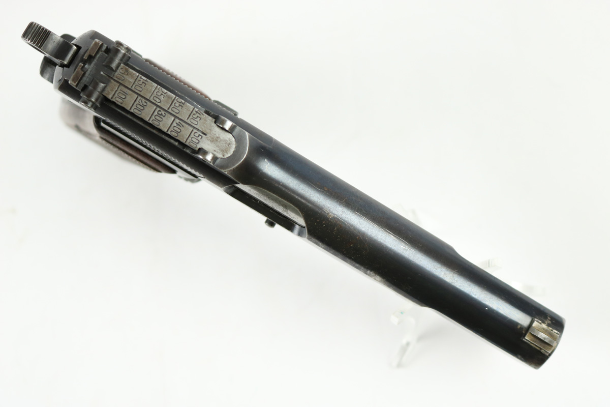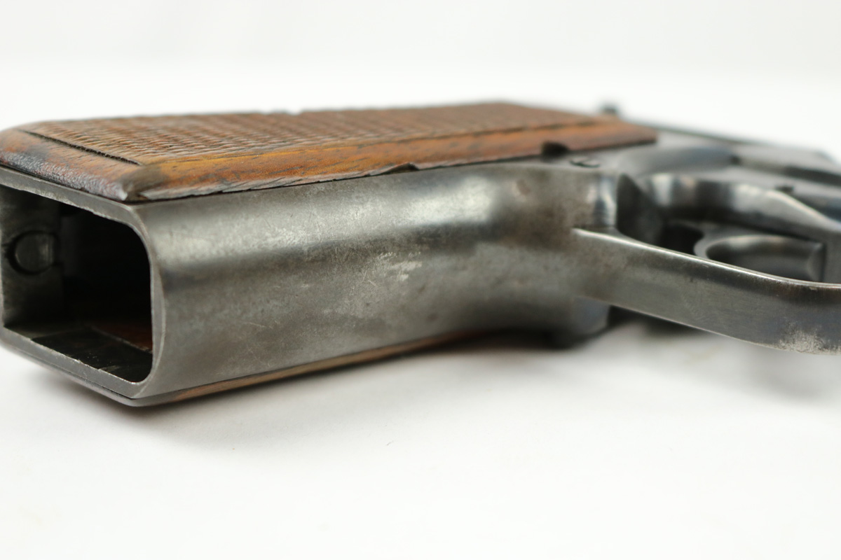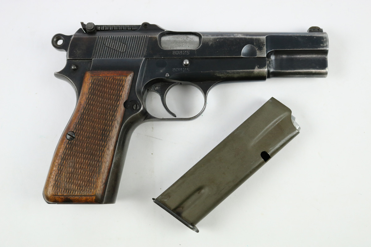 9/26/18 – This is an original, fairly early and scarce WaA103 Tangent Hi Power. The pistol has a high polish finish that is mostly in tact, original wood grips, a tangent rear sight, and waffen 103 proof stamps. Roughly 80-85% of the finish remains in tact, despite wear throughout the front and back straps, as well as general bluing loss on the frame and slide. The straps have more discoloration and significant wear than the slide and remaining frame. The left side of the slide has small pin marks as if someone struck it multiple times in this area – or maybe it was hit by shrapnel. The wood grips have no cracks or chips. All correct, matching, and fully functional. The bore is a 7 out of 10 with good rifling but there’s clear signs of use and patina throughout. Guaranteed original. Comes with one original WaA103 proofed magazine as well.