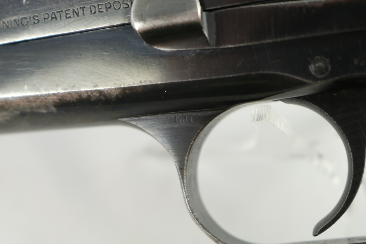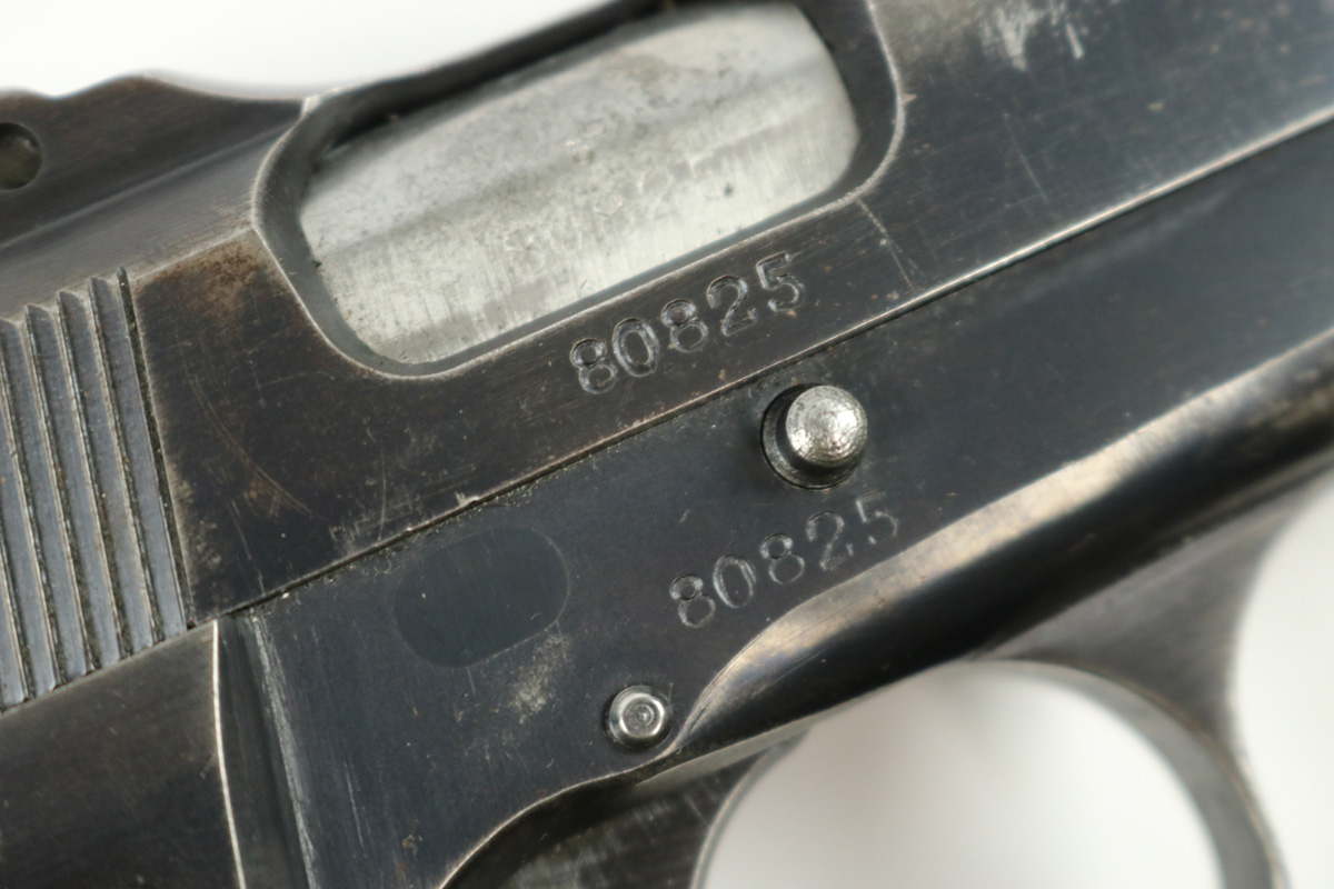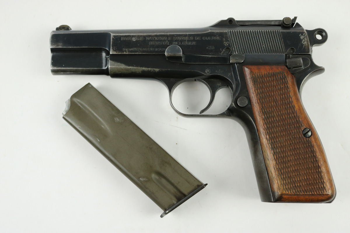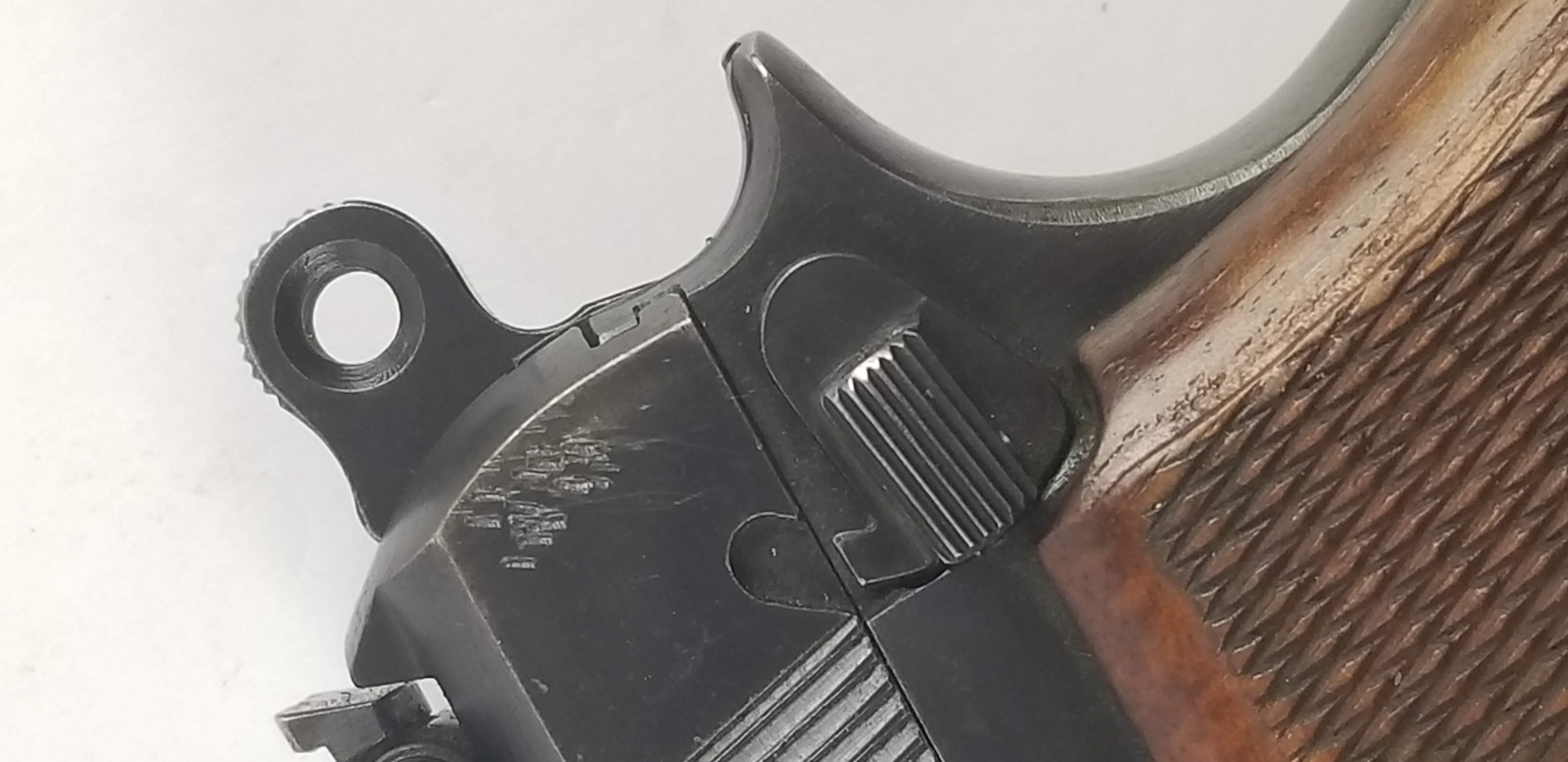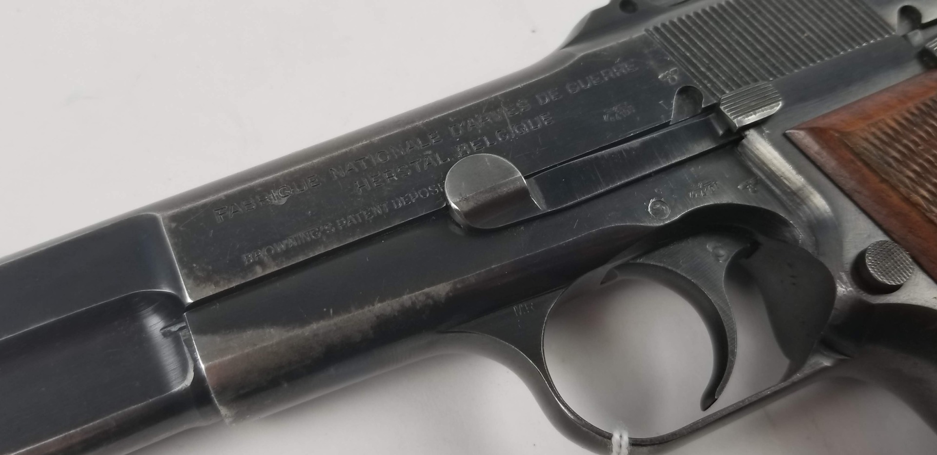 9/26/18 – This is an original, fairly early and scarce WaA103 Tangent Hi Power. The pistol has a high polish finish that is mostly in tact, original wood grips, a tangent rear sight, and waffen 103 proof stamps. Roughly 80-85% of the finish remains in tact, despite wear throughout the front and back straps, as well as general bluing loss on the frame and slide. The straps have more discoloration and significant wear than the slide and remaining frame. The left side of the slide has small pin marks as if someone struck it multiple times in this area – or maybe it was hit by shrapnel. The wood grips have no cracks or chips. All correct, matching, and fully functional. The bore is a 7 out of 10 with good rifling but there’s clear signs of use and patina throughout. Guaranteed original. Comes with one original WaA103 proofed magazine as well.