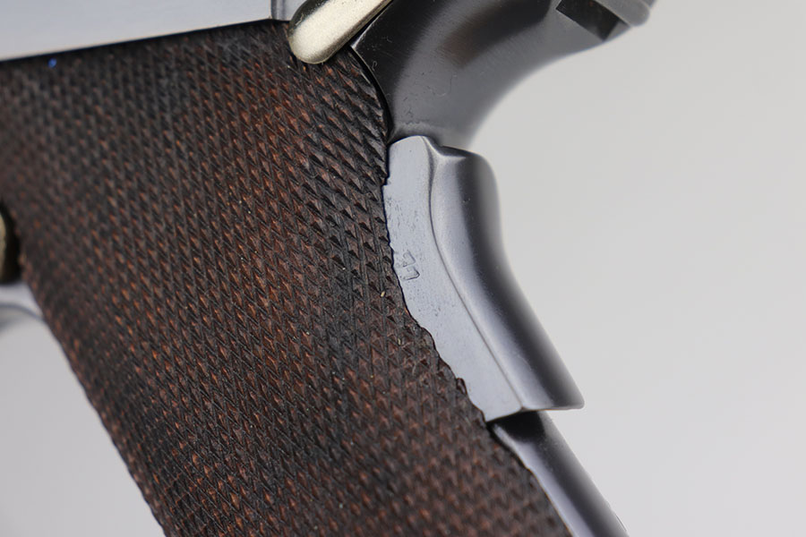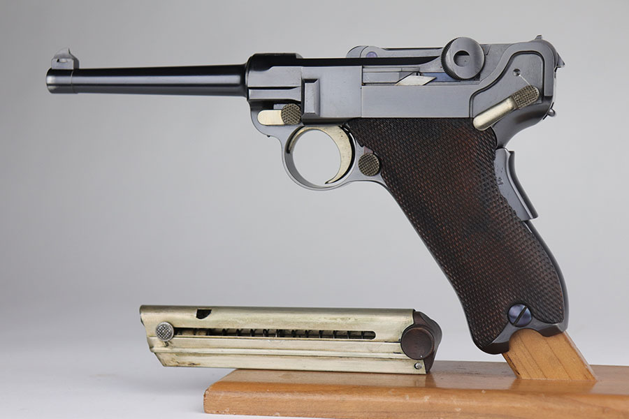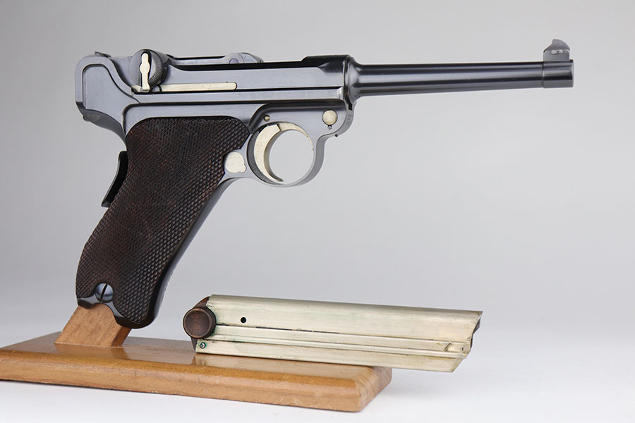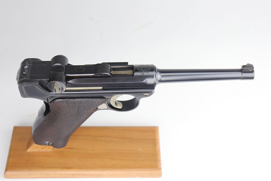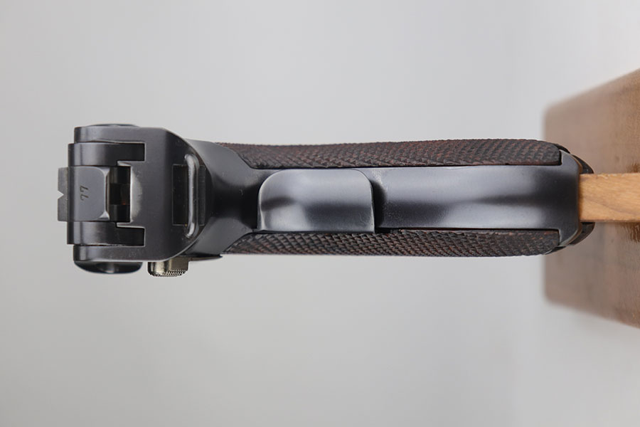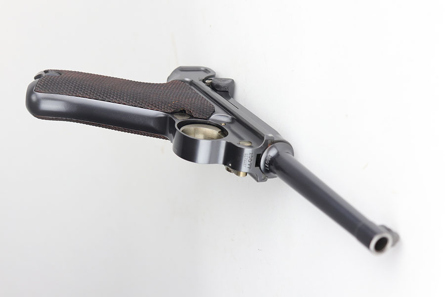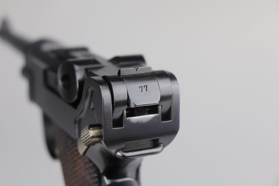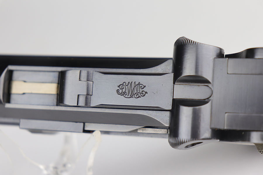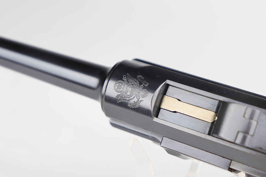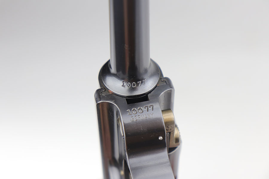 8/6/20 – This is a rare DWM model 1900 luger with American Eagle crest on the chamber. This is the first production model of this variation, made in or around 1900 with early dish toggle. These pistols went to the US retail market and the manufacturers at DWM realized that nation-based crests increased sales of these lugers, so that is why you find the American Eagle over the chamber. This is also why you see GERMANY marked on the frame, denoting these were exported for commercial sale. This pistol is in excellent original condition, with almost zero bluing loss. There’s an area of finish loss on the muzzle, and another on the back of the frame. All matching numbers on the pistol with correct blank-bottom wood magazine. Bore has strong rifling but a little bit of frost throughout. The excellent grips are unmarked.