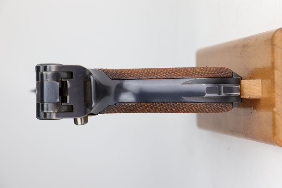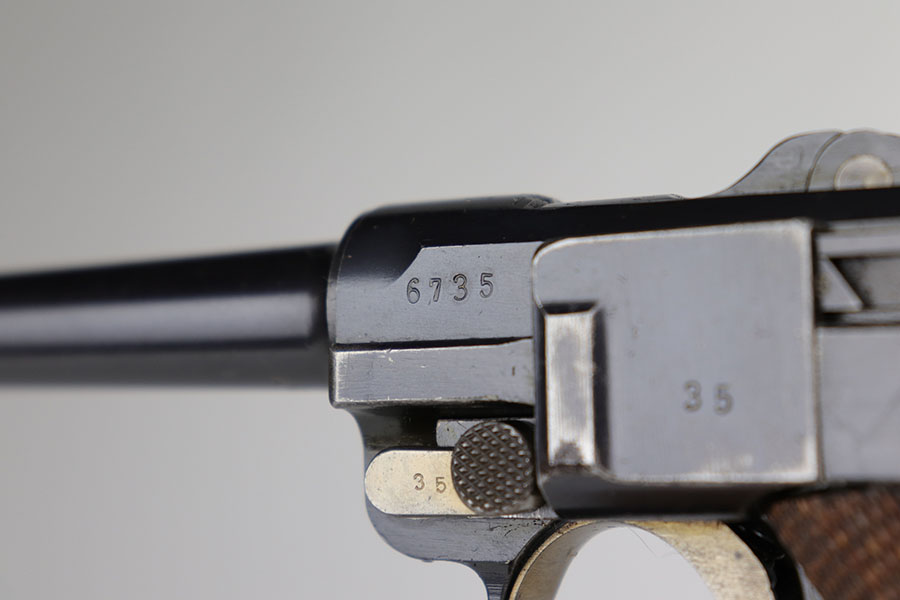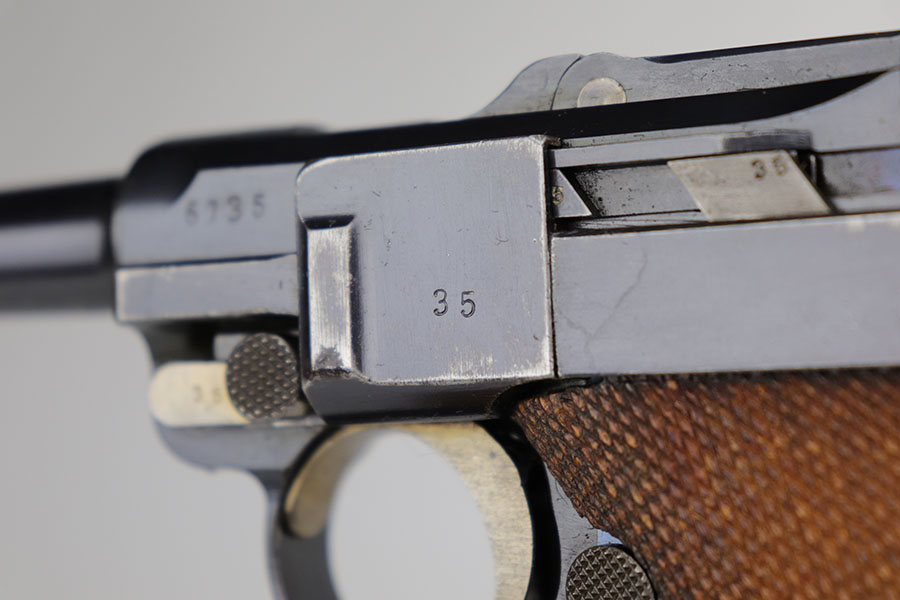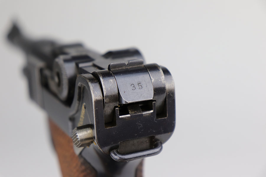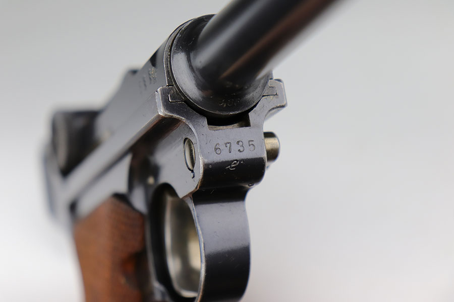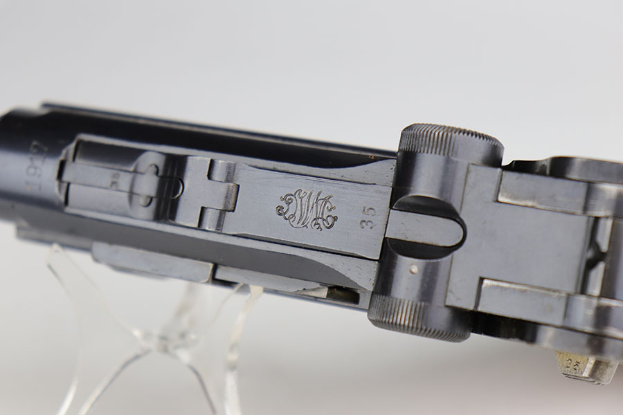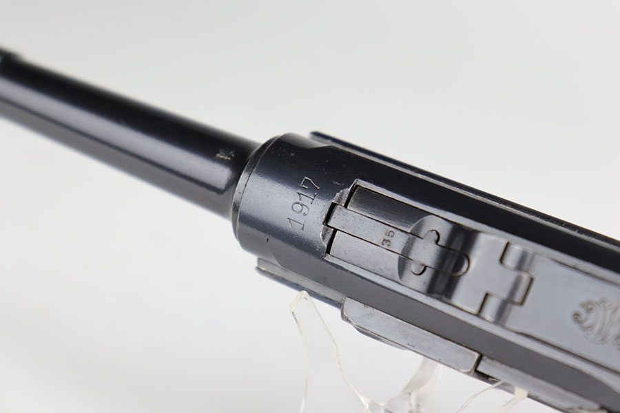 12/8/20 – This is a terrific and complete DWM military Luger rig from 1917, which includes a holster, tool and both of the original, matching magazines. The pistol is all matching and original, with 95-96% of the blue remaining. There’s minor bluing loss on the sideplate and the ears of the receiver, but minty otherwise. Beautiful straw finish on the small parts. Both magazines factory numbered to the pistol. Correct tool with Imperial proof. The holster is in great shape with minor scuffs but no major defects. It’s 1918 dated and marked ‘DEUTSCHE SIGNALFLAGGEN-FABRIK KARLSRUHEIB”.