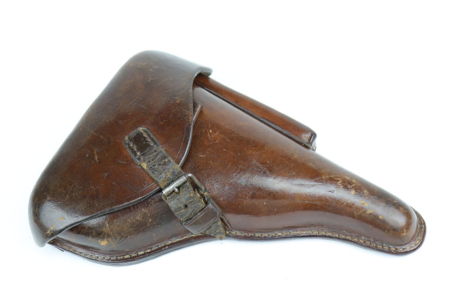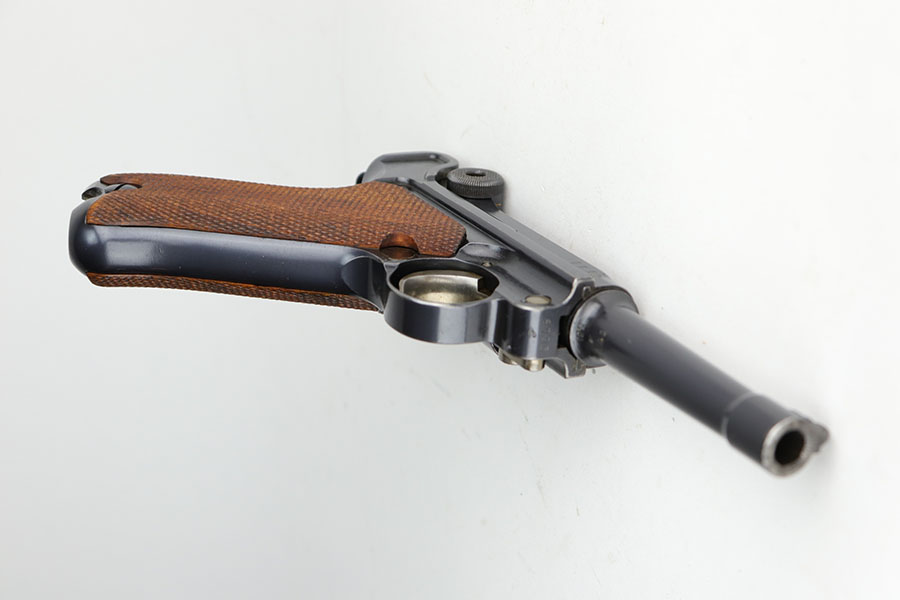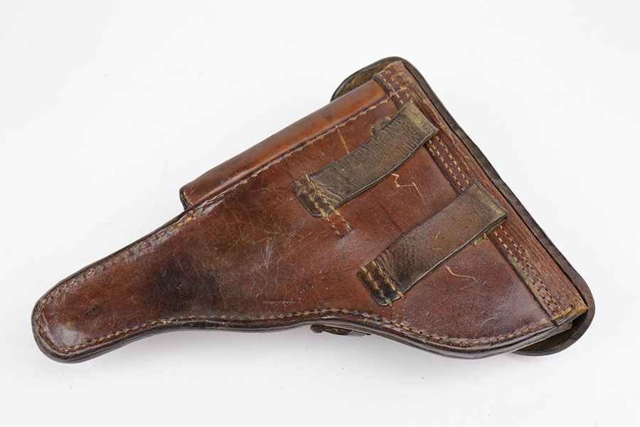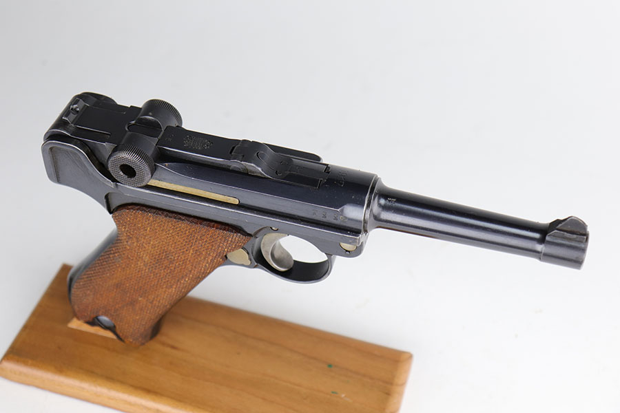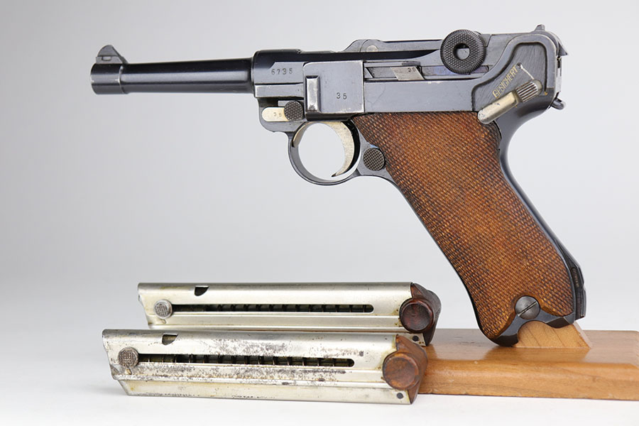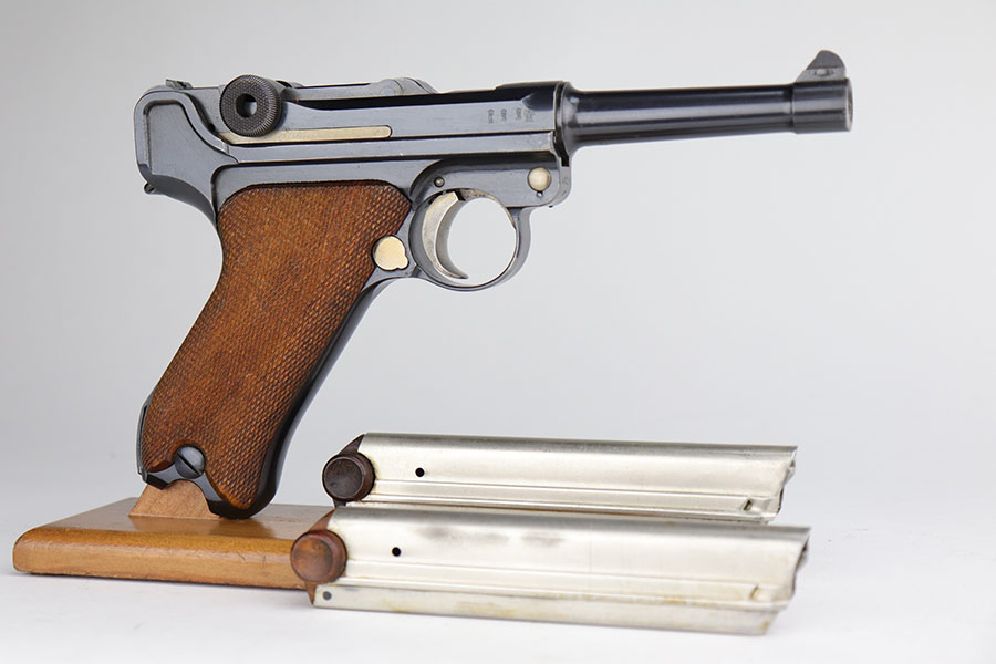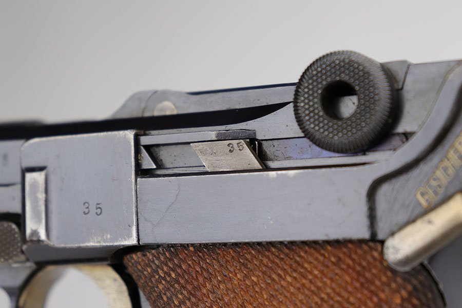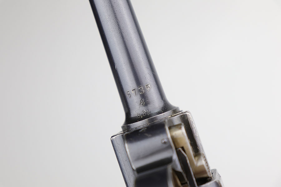 12/8/20 – This is a terrific and complete DWM military Luger rig from 1917, which includes a holster, tool and both of the original, matching magazines. The pistol is all matching and original, with 95-96% of the blue remaining. There’s minor bluing loss on the sideplate and the ears of the receiver, but minty otherwise. Beautiful straw finish on the small parts. Both magazines factory numbered to the pistol. Correct tool with Imperial proof. The holster is in great shape with minor scuffs but no major defects. It’s 1918 dated and marked ‘DEUTSCHE SIGNALFLAGGEN-FABRIK KARLSRUHEIB”.