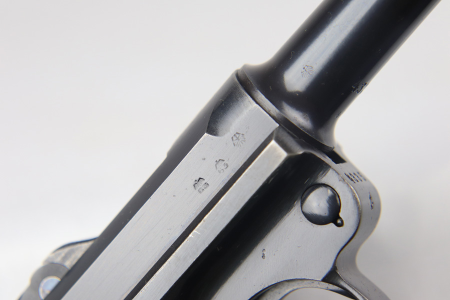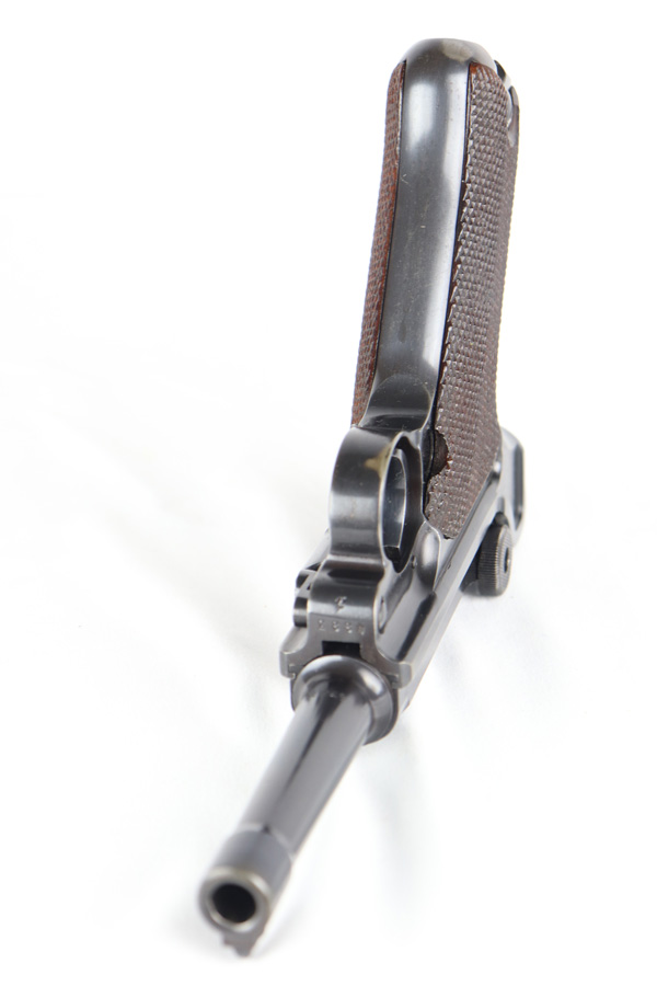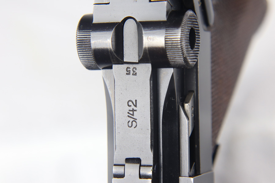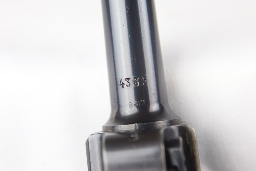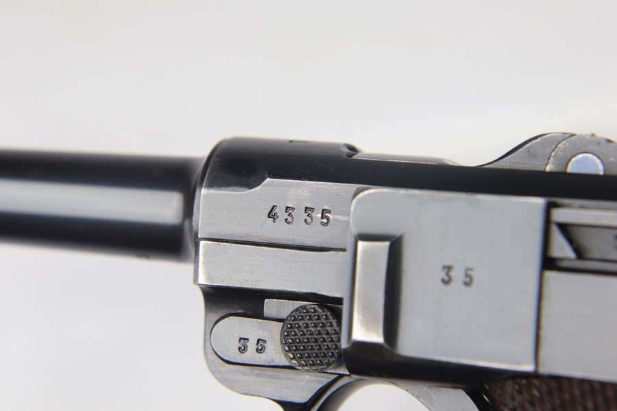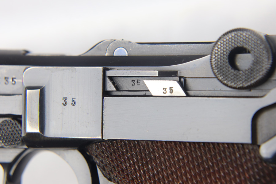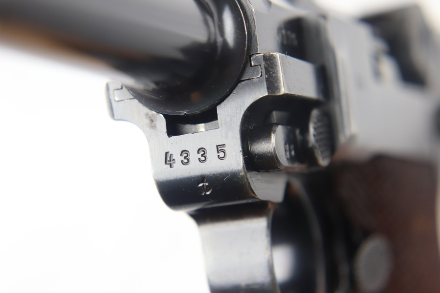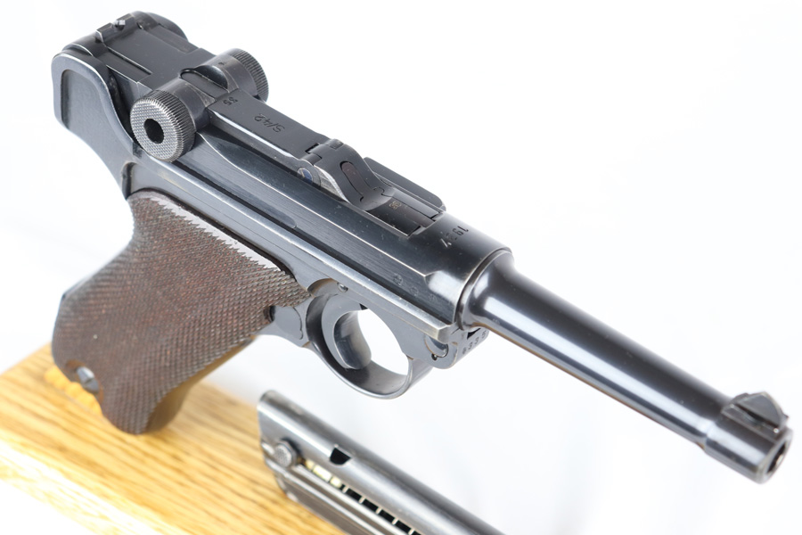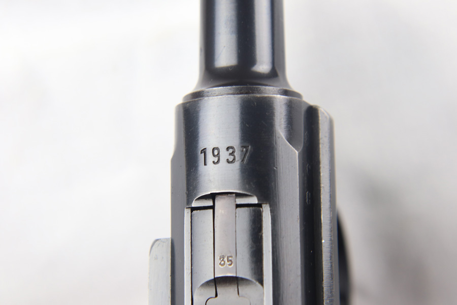 9/21/20 – This a beautiful Mauser Luger from 1937 with the original matching grips and magazine. The original bluing rates at 96-97% with high edge wear in all the normal locations, and minor finish loss on the straps. The grips are sharp and numbered to the gun. This pistol is from late 1937 as the small parts are blued, not strawed. Shiny, clean bore.